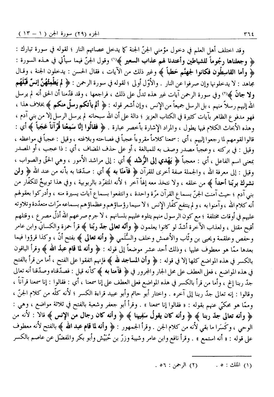 وَأَنَّهُ تَعالى جَدُّ رَبِّنا وَأَنَّهُ كانَ يَقُولُ سَفِيهُنا وَأَنَّهُ كانَ رِجالٌ مِنَ الْإِنْسِ قَالَا: لِأَنَّهُ مِنَ الْوَحْيِ، وَكَسَرَا مَا بَقِيَ لِأَنَّهُ مِنْ كَلَامِ الْجِنِّ. وَقَرَأَ الْجُمْهُورُ: وَأَنَّهُ لَمَّا قامَ عَبْدُ اللَّهِ بِالْفَتْحِ لِأَنَّهُ مَعْطُوفٌ عَلَى قَوْلِهِ: «أَنَّهُ اسْتَمَعَ» . وَقَرَأَ نَافِعٌ وَابْنُ عَامِرٍ وَشَيْبَةُ وَزِرُّ بْنُ حُبَيْشٍ وَأَبُو بَكْرٍ وَالْمُفَضَّلُ عَنْ عَاصِمٍ بالكسر