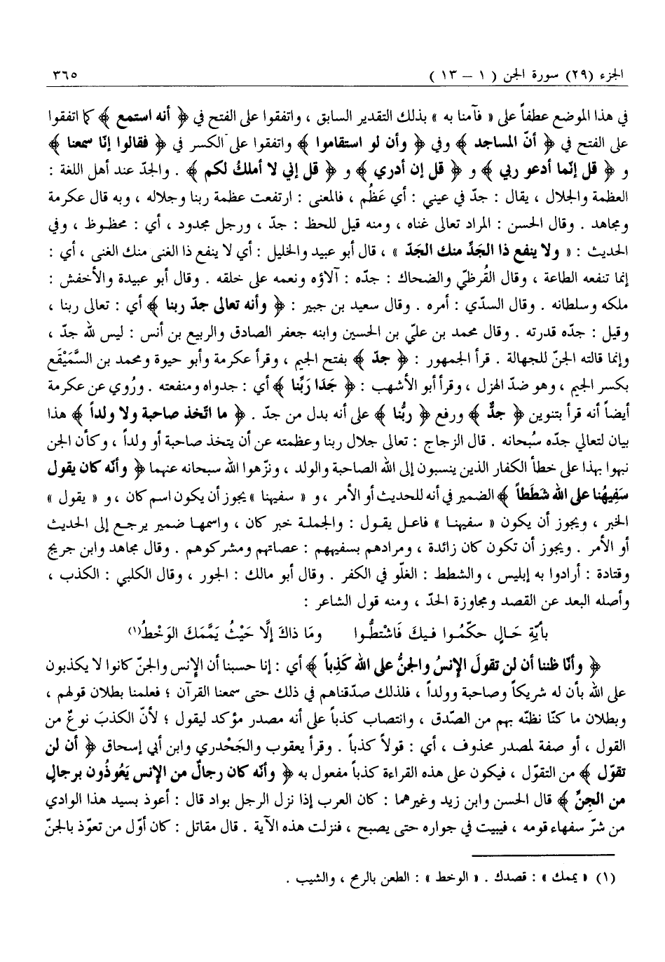 مُلْكُهُ وَسُلْطَانُهُ. وَقَالَ السُّدِّيُّ: أَمْرُهُ. وَقَالَ سَعِيدُ بْنُ جُبَيْرٍ: وَأَنَّهُ تَعالى جَدُّ رَبِّنا أَيْ: تَعَالَى رَبُّنَا، وَقِيلَ: جَدُّهُ قُدْرَتُهُ. وَقَالَ مُحَمَّدُ بْنُ عَلِيِّ بْنِ الْحُسَيْنِ وَابْنُهُ جَعْفَرٌ الصَّادِقُ وَالرَّبِيعُ بْنُ أَنَسٍ: لَيْسَ لِلَّهِ جَدٌّ، وَإِنَّمَا قَالَتْهُ الْجِنُّ لِلْجَهَالَةِ. قَرَأَ الْجُمْهُورُ: جَدُّ بِفَتْحِ الْجِيمِ، وَقَرَأَ عِكْرِمَةُ وَأَبُو حيوة ومحمد بن السّميقع بِكَسْرِ الْجِيمِ، وَهُوَ ضِدُّ الْهَزْلِ، وَقَرَأَ أَبُو الأشهب: جدا رَبِّنَا أَيْ: جَدْوَاهُ وَمَنْفَعَتُهُ. وَرُوِيَ عَنْ عِكْرِمَةَ أَيْضًا أَنَّهُ قَرَأَ بِتَنْوِينِ جَدُّ وَرَفْعِ رَبِّنَا عَلَى أَنَّهُ بَدَلٌ مِنْ جَدُّ. مَا اتَّخَذَ صاحِبَةً وَلا وَلَداً هَذَا بَيَانٌ لِتَعَالِي جَدِّهِ سُبْحَانَهُ. قَالَ الزَّجَّاجُ: تَعَالَى جَلَالُ رَبِّنَا وَعَظَمَتُهُ عَنْ أَنْ يَتَّخِذَ صَاحِبَةً أَوْ وَلَدًا، وَكَأَنَّ الْجِنَّ نَبَّهُوا بِهَذَا عَلَى خَطَأِ الْكُفَّارِ الَّذِينَ يَنْسُبُونَ إِلَى اللَّهِ الصَّاحِبَةَ وَالْوَلَدَ، وَنَزَّهُوا اللَّهَ سُبْحَانَهُ عَنْهُمَا وَأَنَّهُ كانَ يَقُولُ سَفِيهُنا عَلَى اللَّهِ شَطَطاً الضَّمِيرُ فِي أَنَّهُ لِلْحَدِيثِ أَوِ الْأَمْرِ، وَ «سَفِيهُنَا» يَجُوزُ أَنْ يَكُونَ اسْمَ كَانَ، وَ «يَقُولُ» الْخَبَرُ، وَيَجُوزُ أَنْ يَكُونَ «سَفِيهُنَا» فَاعِلَ يَقُولُ: وَالْجُمْلَةُ خَبَرُ كَانَ، وَاسْمُهَا ضَمِيرٌ يَرْجِعُ إِلَى الْحَدِيثِ أَوِ الْأَمْرِ. وَيَجُوزُ أَنْ تَكُونَ كَانَ زَائِدَةً، وَمُرَادُهُمْ بِسَفِيهِهِمْ: عُصَاتُهُمْ وَمُشْرِكُوهُمْ. وَقَالَ مُجَاهِدٌ وَابْنُ جُرَيْجٍ وَقَتَادَةُ: أَرَادُوا بِهِ إِبْلِيسَ، وَالشَّطَطُ: الْغُلُوُّ فِي الْكُفْرِ. وَقَالَ أَبُو مَالِكٍ: الْجَوْرُ، وَقَالَ الْكَلْبِيُّ: الْكَذِبُ، وَأَصْلُهُ الْبُعْدُ عَنِ الْقَصْدِ وَمُجَاوَزَةُ الْحَدِّ، وَمِنْهُ قَوْلُ الشَّاعِرِ: