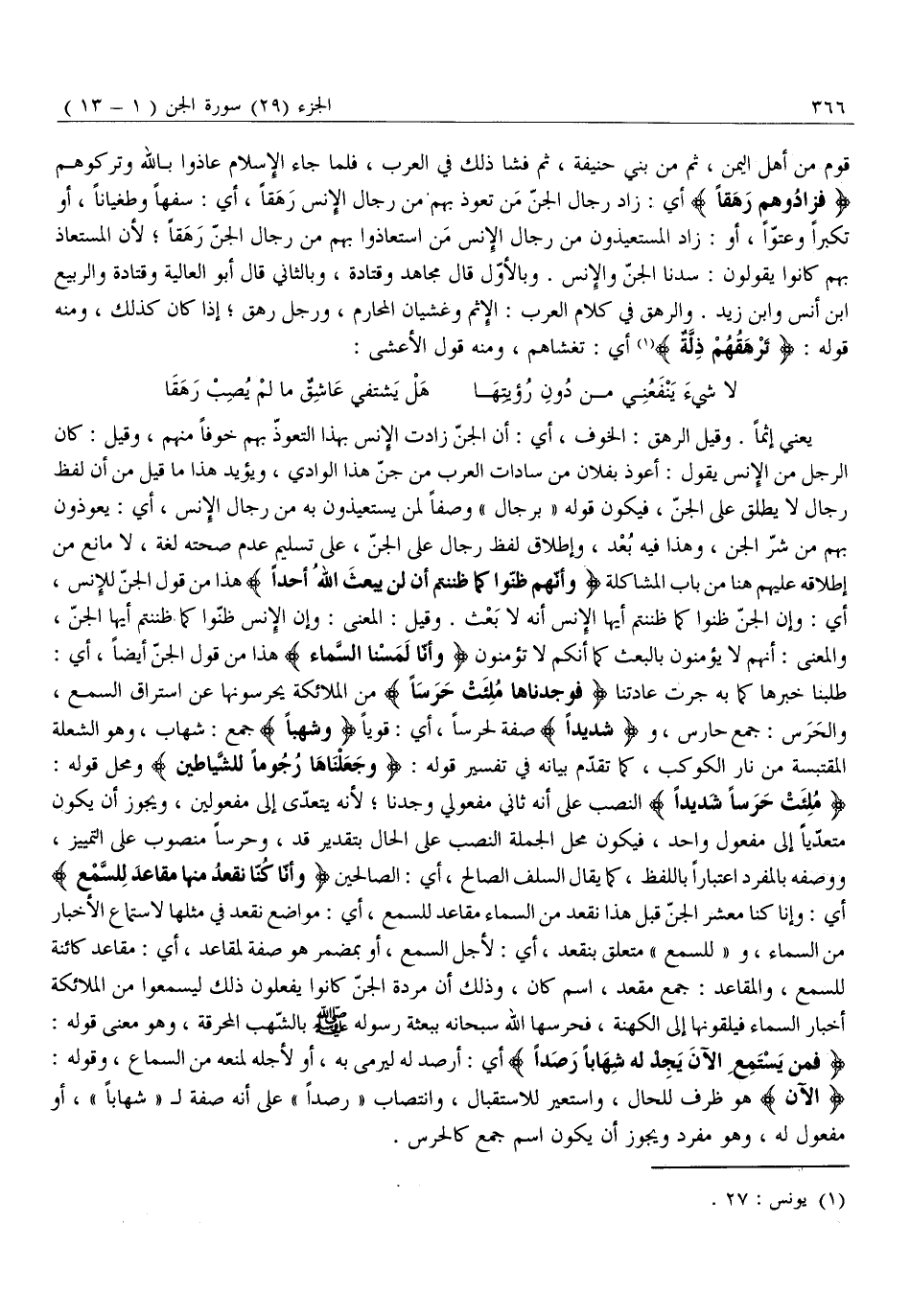 قَوْمٌ مِنْ أَهْلِ الْيَمَنِ، ثُمَّ مِنْ بَنِي حَنِيفَةَ، ثُمَّ فَشَا ذَلِكَ فِي الْعَرَبِ، فَلَمَّا جَاءَ الْإِسْلَامُ عَاذُوا بِاللَّهِ وَتَرَكُوهُمْ فَزادُوهُمْ رَهَقاً أَيْ: زَادَ رِجَالُ الْجِنِّ مَنْ تَعَوَّذَ بِهِمْ مِنْ رِجَالِ الْإِنْسِ رَهَقًا، أَيْ: سَفَهًا وَطُغْيَانًا، أو تَكَبُّرًا وَعُتُوًّا، أَوْ: زَادَ الْمُسْتَعِيذُونَ مِنْ رِجَالِ الْإِنْسِ مَنِ اسْتَعَاذُوا بِهِمْ مِنْ رِجَالِ الْجِنِّ رَهَقًا لِأَنَّ الْمُسْتَعَاذَ بِهِمْ كَانُوا يَقُولُونَ: سُدْنَا الْجِنَّ وَالْإِنْسَ. وَبِالْأَوَّلِ قَالَ مُجَاهِدٌ وَقَتَادَةُ، وَبِالثَّانِي قال أبو العالية وقتادة والربيع ابن أَنَسٍ وَابْنُ زَيْدٍ. وَالرَّهَقُ فِي كَلَامِ الْعَرَبِ: الْإِثْمُ وَغَشِيَانُ الْمَحَارِمِ، وَرَجُلٌ رَهِقٌ إِذَا كَانَ كذلك، ومنه قوله: تَرْهَقُهُمْ ذِلَّةٌ «1» أَيْ: تَغْشَاهُمْ، وَمِنْهُ قَوْلُ الْأَعْشَى: