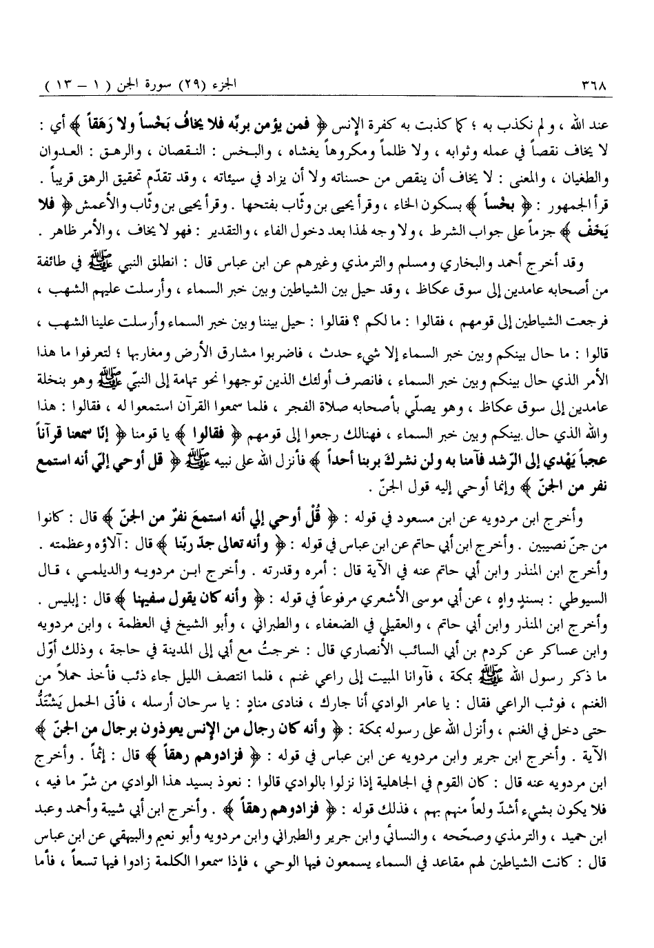 وَأَخْرَجَ ابْنُ الْمُنْذِرِ وَابْنُ أَبِي حَاتِمٍ، وَالْعُقَيْلِيُّ فِي الضُّعَفَاءِ، وَالطَّبَرَانِيُّ، وَأَبُو الشَّيْخِ فِي الْعَظَمَةِ، وَابْنُ مَرْدَوَيْهِ وَابْنُ عساكر عن كردم بْنِ أَبِي السَّائِبِ الْأَنْصَارِيِّ قَالَ: خَرَجْتُ مَعَ أَبِي إِلَى الْمَدِينَةِ فِي حَاجَةٍ، وَذَلِكَ أَوَّلُ مَا ذُكِرَ رَسُولُ اللَّهِ صَلَّى اللَّهُ عَلَيْهِ وَسَلَّمَ بِمَكَّةَ، فَآوَانَا الْمَبِيتُ إِلَى رَاعِي غَنَمٍ، فَلَمَّا انْتَصَفَ اللَّيْلُ جَاءَ ذِئْبٌ فَأَخَذَ حَمَلًا مِنَ الْغَنَمِ، فَوَثَبَ الرَّاعِي فَقَالَ: يَا عَامِرَ الْوَادِي أَنَا جَارُكَ، فَنَادَى مُنَادٍ: يَا سَرْحَانُ أَرْسِلْهُ، فَأَتَى الْحَمَلُ يَشْتَدُّ حَتَّى دَخَلَ فِي الْغَنَمِ، وَأَنْزَلَ اللَّهُ عَلَى رَسُولِهِ بِمَكَّةَ: وَأَنَّهُ كانَ رِجالٌ مِنَ الْإِنْسِ يَعُوذُونَ بِرِجالٍ مِنَ الْجِنِّ الْآيَةُ. وَأَخْرَجَ ابْنُ جَرِيرٍ وَابْنُ مَرْدَوَيْهِ عَنِ ابْنِ عَبَّاسٍ فِي قَوْلِهِ: فَزادُوهُمْ رَهَقاً قَالَ: إِثْمًا. وَأَخْرَجَ ابْنُ مَرْدَوَيْهِ عَنْهُ قَالَ: كَانَ الْقَوْمُ فِي الْجَاهِلِيَّةِ إِذَا نَزَلُوا بِالْوَادِي قَالُوا: نَعُوذُ بِسَيِّدِ هَذَا الْوَادِي مِنْ شَرِّ مَا فِيهِ، فَلَا يَكُونُ بِشَيْءٍ أَشَدَّ وَلَعًا منهم بهم، فذلك قَوْلُهُ: فَزادُوهُمْ رَهَقاً. وَأَخْرَجَ ابْنُ أَبِي شَيْبَةَ وأحمد وعبد ابن حُمَيْدٍ، وَالتِّرْمِذِيُّ وَصَحَّحَهُ، وَالنِّسَائِيُّ وَابْنُ جَرِيرٍ وَالطَّبَرَانِيُّ وَابْنُ مَرْدَوَيْهِ وَأَبُو نُعَيْمٍ وَالْبَيْهَقِيُّ عَنِ ابْنِ عَبَّاسٍ قَالَ: كَانَتِ الشَّيَاطِينُ لَهُمْ مَقَاعِدُ فِي السَّمَاءِ يَسْمَعُونَ فِيهَا الْوَحْيَ، فَإِذَا سَمِعُوا الْكَلِمَةَ زَادُوا فِيهَا تِسْعًا، فَأَمَّا