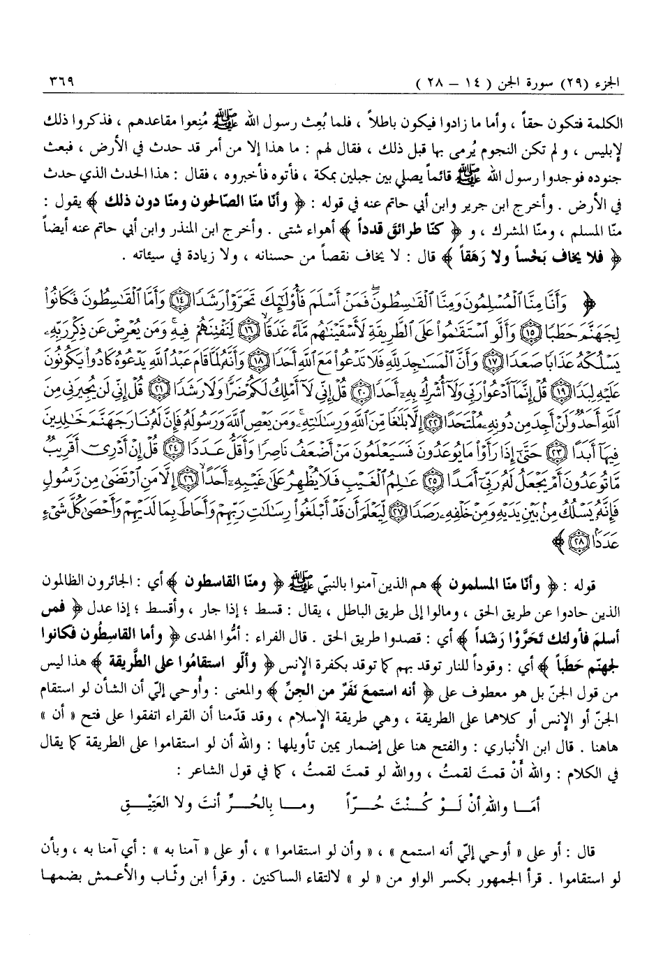 وَأَنَّا مِنَّا الْمُسْلِمُونَ وَمِنَّا الْقاسِطُونَ فَمَنْ أَسْلَمَ فَأُولئِكَ تَحَرَّوْا رَشَداً (14) وَأَمَّا الْقاسِطُونَ فَكانُوا لِجَهَنَّمَ حَطَباً (15) وَأَنْ لَوِ اسْتَقامُوا عَلَى الطَّرِيقَةِ لَأَسْقَيْناهُمْ مَاءً غَدَقاً (16) لِنَفْتِنَهُمْ فِيهِ وَمَنْ يُعْرِضْ عَنْ ذِكْرِ رَبِّهِ يَسْلُكْهُ عَذاباً صَعَداً (17) وَأَنَّ الْمَساجِدَ لِلَّهِ فَلا تَدْعُوا مَعَ اللَّهِ أَحَداً (18)