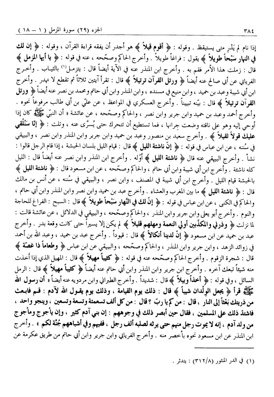 نَشَأَ. وَأَخْرَجَ الْبَيْهَقِيُّ عَنْهُ قَالَ ناشِئَةَ اللَّيْلِ أَوَّلُهُ. وَأَخْرَجَ ابْنُ الْمُنْذِرِ وَابْنُ نَصْرٍ عَنْهُ أَيْضًا قَالَ: اللَّيْلُ كُلُّهُ نَاشِئَةٌ. وَأَخْرَجَ ابْنُ أَبِي شَيْبَةَ وَابْنُ أَبِي حَاتِمٍ، وَالْحَاكِمُ وَصَحَّحَهُ، عَنِ ابْنِ مَسْعُودٍ قَالَ: ناشِئَةَ اللَّيْلِ بِالْحَبَشَةِ قِيَامُ اللَّيْلِ. وَأَخْرَجَ ابْنُ أَبِي شَيْبَةَ فِي الْمُصَنَّفِ، وَابْنُ نَصْرٍ، وَالْبَيْهَقِيُّ فِي سُنَنِهِ، عَنْ أَنَسِ بْنِ مَالِكٍ قَالَ: ناشِئَةَ اللَّيْلِ مَا بَيْنَ الْمَغْرِبِ وَالْعِشَاءِ. وَأَخْرَجَ عَبْدُ بْنُ حُمَيْدٍ وَابْنُ نَصْرٍ وَابْنُ الْمُنْذِرِ وَابْنُ أَبِي حَاتِمٍ، وَالْحَاكِمُ فِي الْكُنَى، عَنِ ابْنِ عَبَّاسٍ فِي قَوْلِهِ: إِنَّ لَكَ فِي النَّهارِ سَبْحاً طَوِيلًا قَالَ: السَّبْحُ: الْفَرَاغُ لِلْحَاجَةِ وَالنَّوْمِ. وَأَخْرَجَ أَبُو يَعْلَى وَابْنُ جَرِيرٍ وَابْنُ الْمُنْذِرِ، وَالْحَاكِمُ وَصَحَّحَهُ، وَالْبَيْهَقِيُّ فِي الدَّلَائِلِ، عَنْ عَائِشَةَ قَالَتْ: