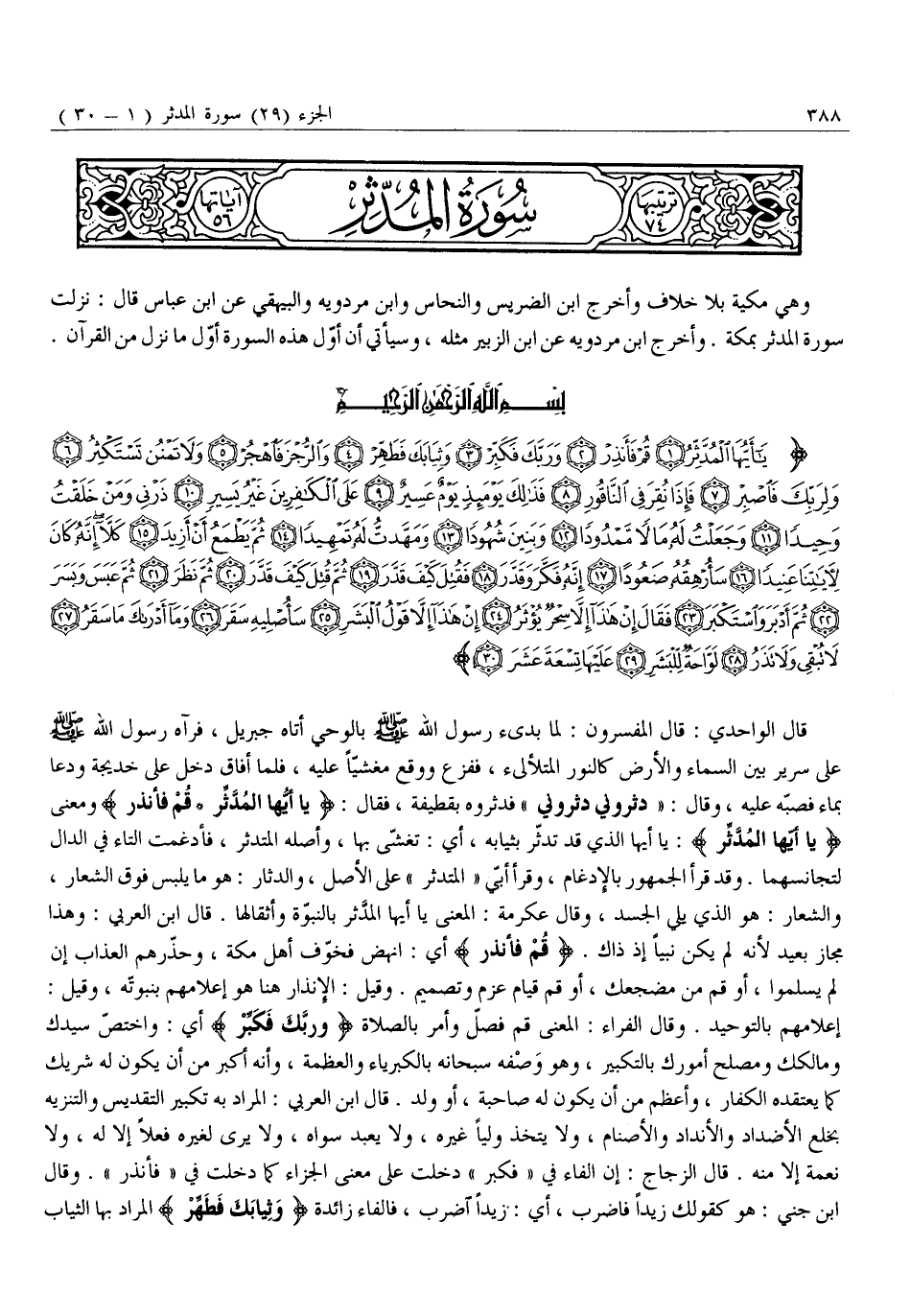 قَالَ الْوَاحِدِيُّ: قَالَ الْمُفَسِّرُونَ: لَمَّا بُدِئَ رَسُولُ اللَّهِ صَلَّى اللَّهُ عَلَيْهِ وَسَلَّمَ بِالْوَحْيِ أَتَاهُ جِبْرِيلُ، فَرَآهُ رَسُولَ اللَّهِ صَلَّى اللَّهُ عَلَيْهِ وَسَلَّمَ عَلَى سَرِيرٍ بَيْنَ السَّمَاءِ وَالْأَرْضِ كَالنُّورِ الْمُتَلَأْلِئِ، فَفَزِعَ وَوَقَعَ مَغْشِيًّا عَلَيْهِ، فَلَمَّا أَفَاقَ دَخَلَ عَلَى خَدِيجَةَ وَدَعَا بِمَاءٍ فَصَبَّهُ عَلَيْهِ، وَقَالَ: «دَثِّرُونِي دَثِّرُونِي» فَدَثَّرُوهُ بِقَطِيفَةٍ، فقال: يا أَيُّهَا الْمُدَّثِّرُ- قُمْ فَأَنْذِرْ ومعنى يا أَيُّهَا الْمُدَّثِّرُ: يَا أَيُّهَا الَّذِي قَدْ تَدَثَّرَ بِثِيَابِهِ، أَيْ: تَغَشَّى بِهَا، وَأَصْلُهُ الْمُتَدَثِّرُ، فَأُدْغِمَتِ التَّاءُ فِي الدَّالِ لِتَجَانُسِهِمَا. وَقَدْ قَرَأَ الْجُمْهُورُ بِالْإِدْغَامِ، وَقَرَأَ أُبَيٌّ «الْمُتَدَثِّرُ» عَلَى الْأَصْلِ، وَالدِّثَارِ: هُوَ مَا يُلْبَسُ فَوْقَ الشِّعَارِ، وَالشِّعَارُ: هُوَ الَّذِي علي الْجَسَدَ، وَقَالَ عِكْرِمَةُ: الْمَعْنَى يَا أَيُّهَا الْمُدَّثِّرُ بِالنُّبُوَّةِ وَأَثْقَالِهَا. قَالَ ابْنُ الْعَرَبِيِّ: وَهَذَا مَجَازٌ بَعِيدٌ لِأَنَّهُ لَمْ يَكُنْ نَبِيًّا إِذْ ذَاكَ. قُمْ فَأَنْذِرْ أَيِ: انْهَضْ فَخَوِّفَ أَهْلَ مَكَّةَ، وَحَذِّرْهُمُ الْعَذَابَ إِنْ لَمْ يُسْلِمُوا، أَوْ قُمْ مِنْ مَضْجَعِكَ، أَوْ قُمْ قِيَامَ عَزْمٍ وَتَصْمِيمٍ. وَقِيلَ: الْإِنْذَارُ هُنَا هُوَ إِعْلَامُهُمْ بِنُبُوَّتِهِ، وَقِيلَ: