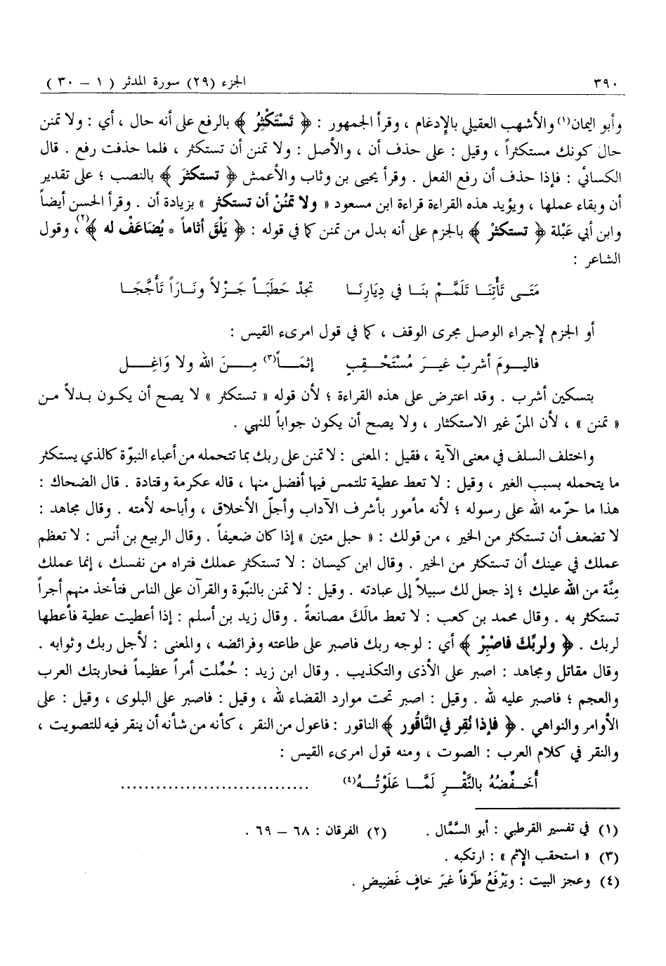 وَأَبُو الْيَمَانِ «1» وَالْأَشْهَبُ الْعُقَيْلِيُّ بِالْإِدْغَامِ، وَقَرَأَ الْجُمْهُورُ: تَسْتَكْثِرُ بِالرَّفْعِ عَلَى أَنَّهُ حَالٌ، أَيْ: وَلَا تَمْنُنْ حَالَ كَوْنِكَ مُسْتَكْثِرًا، وَقِيلَ: عَلَى حَذْفِ أَنْ، وَالْأَصْلُ: وَلَا تَمْنُنْ أَنْ تَسْتَكْثِرَ، فَلَمَّا حذفت رفع. قال الكسائي: فإذا حذف أَنْ رُفِعَ الْفِعْلُ. وَقَرَأَ يَحْيَى بْنُ وَثَّابٍ والأعمش تَسْتَكْثِرُ بالنصب على تقدير أن وبقاء عملها، ويؤيد هذه القراءة قراءة ابن مسعود «ولا تمنن أن تَسْتَكْثِرْ» بِزِيَادَةِ أَنْ. وَقَرَأَ الْحَسَنُ أَيْضًا وَابْنُ أَبِي عَبْلَةَ تَسْتَكْثِرُ بِالْجَزْمِ عَلَى أَنَّهُ بَدَلٌ مِنْ تَمْنُنْ كَمَا فِي قَوْلِهِ: يَلْقَ أَثاماً- يُضاعَفْ لَهُ «2» ، وَقَوْلُ الشَّاعِرِ: