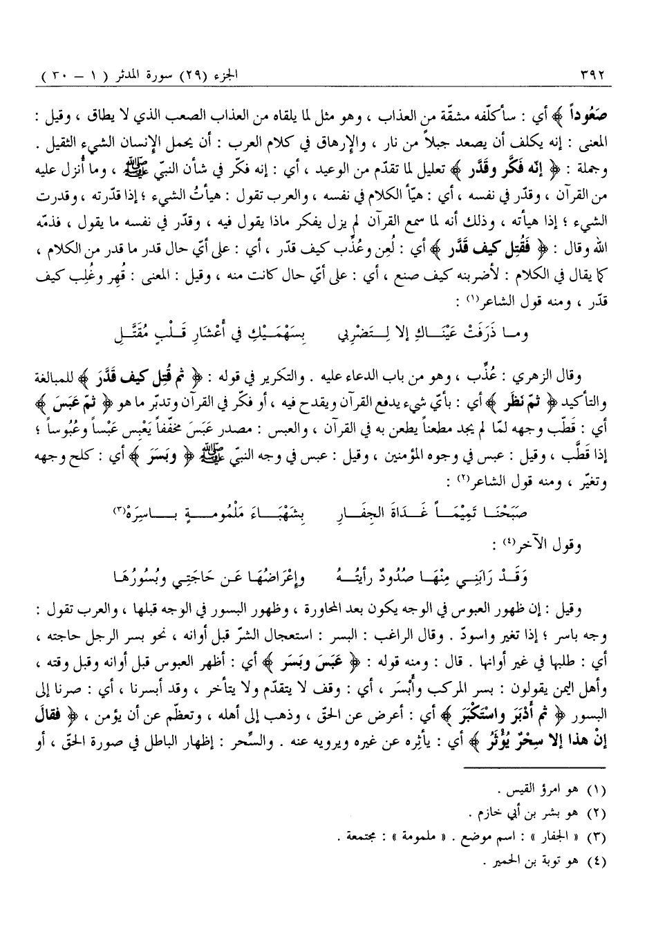 وَقَالَ الزُّهْرِيُّ: عُذِّبَ، وَهُوَ مِنْ بَابِ الدُّعَاءِ عَلَيْهِ. وَالتَّكْرِيرُ فِي قَوْلِهِ: ثُمَّ قُتِلَ كَيْفَ قَدَّرَ لِلْمُبَالَغَةِ وَالتَّأْكِيدِ ثُمَّ نَظَرَ أَيْ: بِأَيِّ شَيْءٍ يَدْفَعُ الْقُرْآنَ وَيَقْدَحُ فِيهِ، أَوْ فَكَّرَ فِي الْقُرْآنِ وَتَدَبَّرَ مَا هُوَ ثُمَّ عَبَسَ أَيْ: قَطَّبَ وَجْهَهُ لَمَّا لَمْ يَجِدْ مَطْعَنًا يَطْعَنُ بِهِ فِي الْقُرْآنِ، وَالْعَبْسُ: مَصْدَرُ عَبَسَ مُخَفَّفًا يَعْبِسُ عَبْسًا وَعُبُوسًا إِذَا قَطَّبَ، وَقِيلَ: عَبَسَ فِي وُجُوهِ الْمُؤْمِنِينَ، وَقِيلَ: عَبَسَ فِي وَجْهِ النَّبِيِّ صَلَّى اللَّهُ عَلَيْهِ وَسَلَّمَ وَبَسَرَ أَيْ: كَلَّحَ وَجْهَهُ وَتَغَيَّرَ، وَمِنْهُ قَوْلُ الشَّاعِرِ «2» :