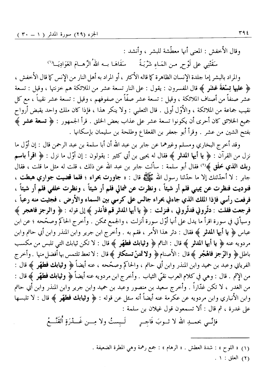 وَقَدْ أَخْرَجَ الْبُخَارِيُّ وَمُسْلِمٌ وَغَيْرُهُمَا عَنْ جَابِرٍ بْنِ عَبْدِ اللَّهِ أَنَّ أَبَا سَلَمَةَ بْنَ عَبْدِ الرَّحْمَنِ قَالَ: إِنَّ أَوَّلَ مَا نَزَلَ مِنَ الْقُرْآنِ: يا أَيُّهَا الْمُدَّثِّرُ فَقَالَ لَهُ يَحْيَى بْنُ أَبِي كَثِيرٍ: يَقُولُونَ: أَنَّ أَوَّلَ مَا نَزَلَ: اقْرَأْ بِاسْمِ رَبِّكَ الَّذِي خَلَقَ «2» فَقَالَ أَبُو سَلَمَةَ: سَأَلْتُ جَابِرَ بْنَ عَبْدِ اللَّهِ عَنْ ذَلِكَ، قُلْتُ لَهُ مِثْلَ مَا قُلْتُ، فَقَالَ جَابِرٌ: لَا أُحَدِّثُنَّكَ إِلَّا مَا حَدَّثَنَا رَسُولَ اللَّهِ صَلَّى اللَّهُ عَلَيْهِ وَسَلَّمَ قَالَ: «جَاوَرْتُ بِحِرَاءٍ فَلَمَّا قَضَيْتُ جِوَارِي هَبَطْتُ، فَنُودِيتُ فَنَظَرْتُ عَنْ يَمِينِي فَلَمْ أَرَ شَيْئًا، وَنَظَرْتُ عَنْ شِمَالِي فَلَمْ أَرَ شَيْئًا، وَنَظَرْتُ خَلْفِي فَلَمْ أَرَ شَيْئًا، فَرَفَعْتُ رَأْسِي فَإِذَا الْمَلَكُ الَّذِي جَاءَنِي بِحِرَاءٍ جَالَسٌ عَلَى كُرْسِيٍّ بين السماء والأرض، فجثيت مِنْهُ رُعْبًا، فَرَجَعْتُ فَقُلْتُ: دَثِّرُونِي فَدَثَّرُونِي، فَنَزَلَتْ: يا أَيُّهَا الْمُدَّثِّرُ قُمْ فَأَنْذِرْ إِلَى قَوْلِهِ: وَالرُّجْزَ فَاهْجُرْ وَسَيَأْتِي فِي سُورَةِ اقْرَأْ مَا يَدُلُّ عَلَى أَنَّهَا أَوَّلُ سُورَةٍ أُنْزِلَتْ، وَالْجَمْعُ مُمْكِنٌ. وَأَخْرَجَ الحاكم وصحّحه عن ابن عباس يا أَيُّهَا الْمُدَّثِّرُ فَقَالَ: دَثِّرْ هَذَا الْأَمْرَ، فَقُمْ بِهِ. وَأَخْرَجَ ابْنُ جَرِيرٍ وَابْنُ الْمُنْذِرِ وَابْنُ أَبِي حاتم وابن مردويه عنه يا أَيُّهَا الْمُدَّثِّرُ فقال: النَّائِمُ وَثِيابَكَ فَطَهِّرْ قَالَ: لَا تَكُنْ ثِيَابَكَ الَّتِي تَلْبَسُ مِنْ مَكْسَبٍ بَاطِلٍ وَالرُّجْزَ فَاهْجُرْ قَالَ: الْأَصْنَامُ وَلا تَمْنُنْ تَسْتَكْثِرُ قَالَ: لَا تُعْطِ تَلْتَمِسُ بِهَا أَفْضَلَ مِنْهَا. وَأَخْرَجَ الْفِرْيَابِيُّ وَعَبْدُ بْنُ حُمَيْدٍ وَابْنُ الْمُنْذِرِ وَابْنُ أَبِي حَاتِمٍ، وَالْحَاكِمُ وَصَحَّحَهُ، عَنْهُ أَيْضًا وَثِيابَكَ فَطَهِّرْ قَالَ: