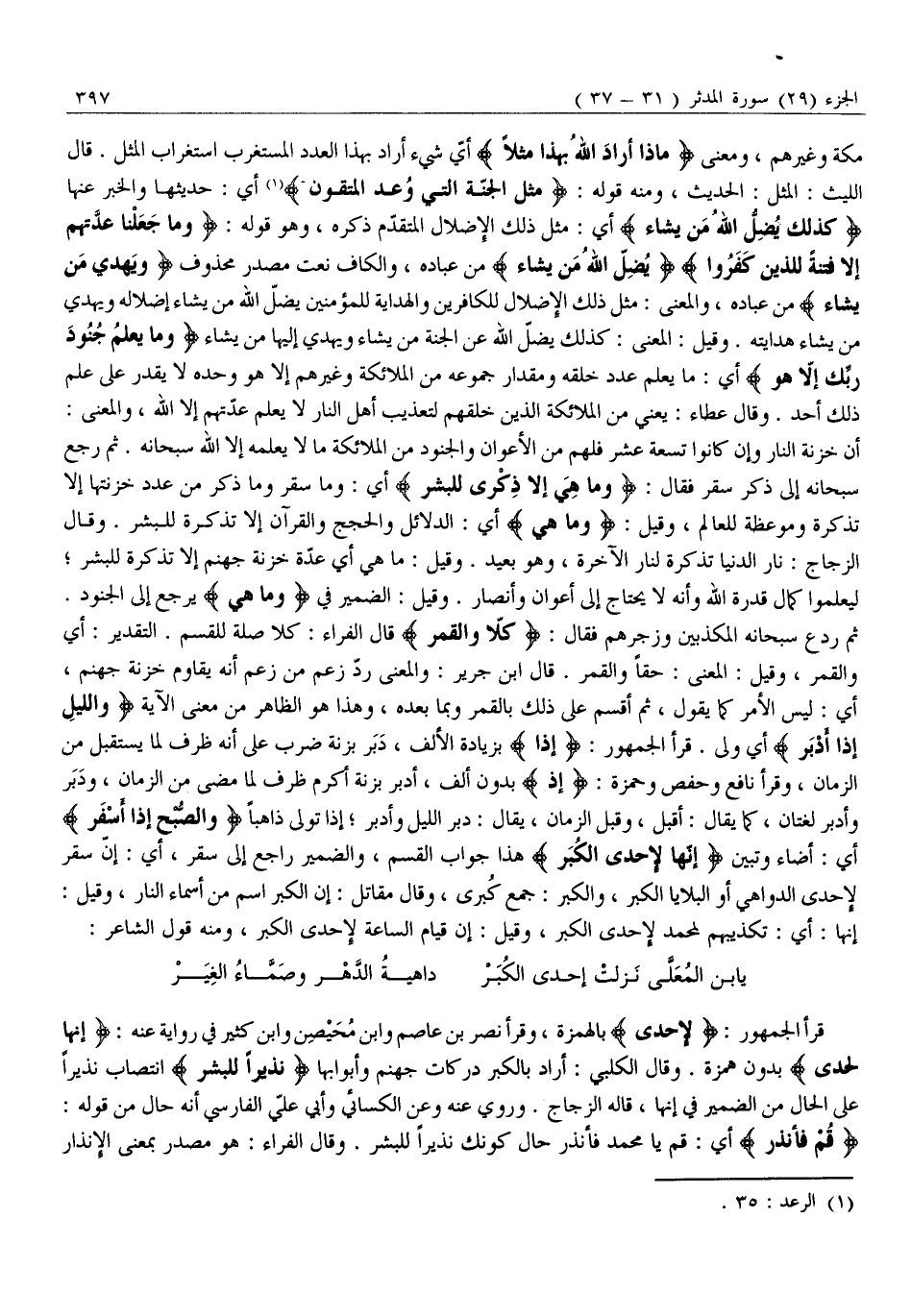 مَكَّةَ وَغَيْرِهِمْ، وَمَعْنَى مَاذَا أَرادَ اللَّهُ بِهذا مَثَلًا أَيْ شَيْءٌ أَرَادَ بِهَذَا الْعَدَدِ الْمُسْتَغْرَبِ اسْتِغْرَابَ الْمَثَلِ. قَالَ اللَّيْثُ: الْمَثَلُ: الْحَدِيثُ، وَمِنْهُ قوله: مَثَلُ الْجَنَّةِ الَّتِي وُعِدَ الْمُتَّقُونَ «1» أي: حديثها والخبر عَنْهَا كَذلِكَ يُضِلُّ اللَّهُ مَنْ يَشاءُ أَيْ: مِثْلَ ذَلِكَ الْإِضْلَالِ الْمُتَقَدِّمِ ذِكْرُهُ، وَهُوَ قَوْلُهُ: وَما جَعَلْنا عِدَّتَهُمْ إِلَّا فِتْنَةً لِلَّذِينَ كَفَرُوا يُضِلُّ اللَّهُ مَنْ يَشاءُ مِنْ عِبَادِهِ، وَالْكَافُ نَعْتُ مَصْدَرٍ مَحْذُوفٍ وَيَهْدِي مَنْ يَشاءُ مِنْ عِبَادِهِ، وَالْمَعْنَى: مِثْلَ ذَلِكَ الْإِضْلَالِ لِلْكَافِرِينَ وَالْهِدَايَةِ لِلْمُؤْمِنِينَ يُضِلُّ اللَّهُ مَنْ يَشَاءُ إِضْلَالَهُ وَيَهْدِي مَنْ يَشَاءُ هِدَايَتَهُ. وَقِيلَ: الْمَعْنَى: كَذَلِكَ يُضِلُّ اللَّهُ عَنِ الْجَنَّةِ مَنْ يَشَاءُ وَيَهْدِي إِلَيْهَا مَنْ يَشَاءُ وَما يَعْلَمُ جُنُودَ رَبِّكَ إِلَّا هُوَ أي: ما يَعْلَمُ عَدَدَ خَلْقِهِ وَمِقْدَارَ جُمُوعِهِ مِنَ الْمَلَائِكَةِ وَغَيْرِهِمْ إِلَّا هُوَ وَحْدَهُ لَا يَقْدِرُ عَلَى عِلْمِ ذَلِكَ أَحَدٌ. وَقَالَ عَطَاءٌ: يَعْنِي مِنَ الْمَلَائِكَةِ الَّذِينَ خَلَقَهُمْ لِتَعْذِيبِ أَهْلِ النَّارِ لَا يَعْلَمُ عِدَّتَهُمْ إِلَّا اللَّهُ، وَالْمَعْنَى: