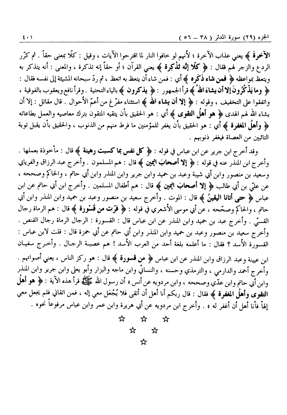 وَأَخْرَجَ ابْنُ الْمُنْذِرِ عَنْهُ فِي قَوْلِهِ: إِلَّا أَصْحابَ الْيَمِينِ قَالَ: هُمُ الْمُسْلِمُونَ. وَأَخْرَجَ عَبْدُ الرَّزَّاقِ وَالْفِرْيَابِيُّ وَسَعِيدُ بْنُ مَنْصُورٍ وَابْنُ أَبِي شَيْبَةَ وَعَبْدُ بْنُ حُمَيْدٍ وَابْنُ جَرِيرٍ وَابْنُ الْمُنْذِرِ وَابْنُ أَبِي حَاتِمٍ، وَالْحَاكِمُ وَصَحَّحَهُ، عَنْ عَلِيِّ بْنِ أَبِي طَالِبٍ إِلَّا أَصْحابَ الْيَمِينِ قَالَ: هُمْ أَطْفَالُ الْمُسْلِمِينَ. وَأَخْرَجَ ابْنُ أَبِي حَاتِمٍ عَنِ ابْنِ عَبَّاسٍ حَتَّى أَتانَا الْيَقِينُ قَالَ: الْمَوْتُ. وَأَخْرَجَ سَعِيدُ بْنُ مَنْصُورٍ وَعَبْدُ بْنُ حُمَيْدٍ وَابْنُ الْمُنْذِرِ وَابْنُ أَبِي حَاتِمٍ، وَالْحَاكِمُ وَصَحَّحَهُ، عَنْ أَبِي مُوسَى الْأَشْعَرِيِّ فِي قَوْلِهِ: فَرَّتْ مِنْ قَسْوَرَةٍ قَالَ: هُمُ الرُّمَاةُ رِجَالُ الْقِسِيِّ. وَأَخْرَجَ عَبْدُ بْنُ حُمَيْدٍ وَابْنُ الْمُنْذِرِ عَنْ ابْنِ عَبَّاسٍ قَالَ: الْقَسْوَرَةُ: الرِّجَالُ الرماة رجال الْقُنَّصُ.