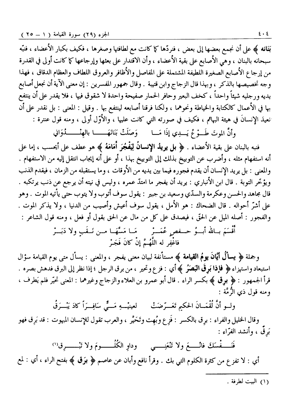 فَنَبَّهَ بِالْبَنَانِ عَلَى بَقِيَّةِ الْأَعْضَاءِ. بَلْ يُرِيدُ الْإِنْسانُ لِيَفْجُرَ أَمامَهُ هُوَ عَطْفٌ عَلَى أَيَحْسَبُ، إِمَّا عَلَى أَنَّهُ اسْتِفْهَامٌ مِثْلُهُ، وَأَضْرَبَ عَنِ التَّوْبِيخِ بِذَلِكَ إِلَى التَّوْبِيخِ بِهَذَا، أَوْ عَلَى أَنَّهُ إِيجَابٌ انْتَقَلَ إِلَيْهِ مِنَ الِاسْتِفْهَامِ.