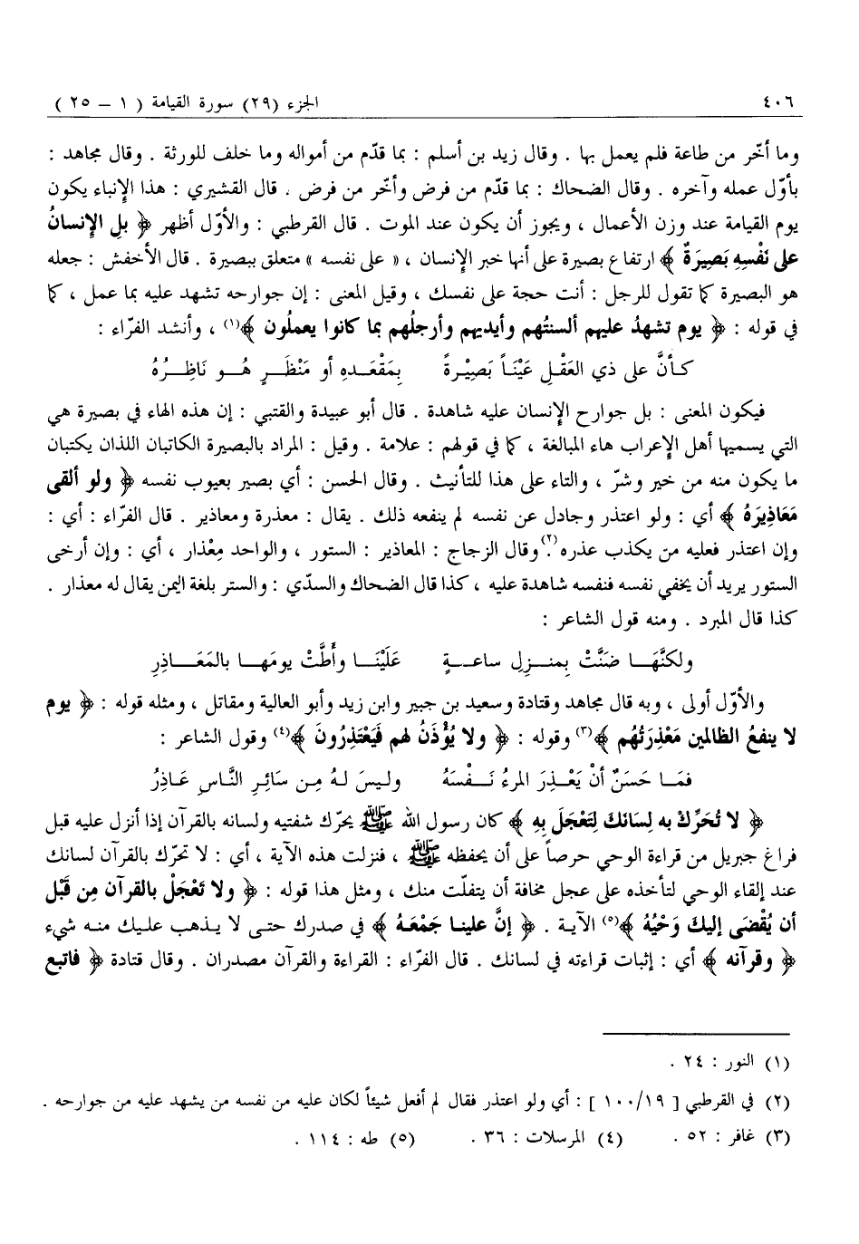 (2) . في القرطبي [19/ 100] : أي ولو اعتذر فقال لم أفعل شيئا لكان عليه من نفسه من يشهد عليه من جوارحه.
