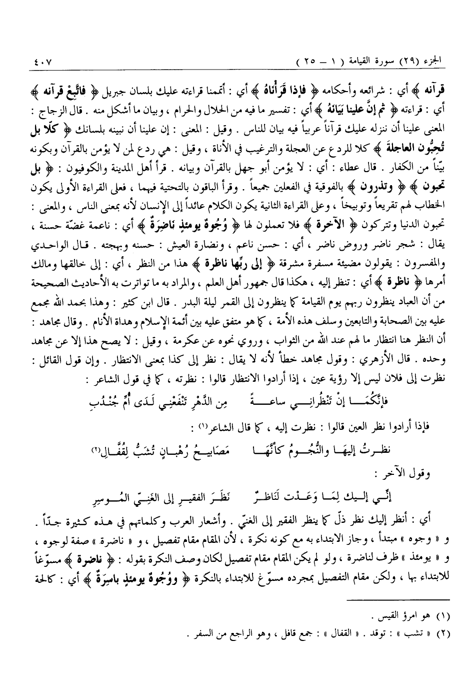 تُحِبُّونَ الدُّنْيَا وَتَتْرُكُونَ الْآخِرَةَ فَلَا تَعْمَلُونَ لَهَا وُجُوهٌ يَوْمَئِذٍ ناضِرَةٌ أَيْ: نَاعِمَةٌ غَضَّةٌ حَسَنَةٌ، يُقَالُ: شَجَرٌ نَاضِرٌ وَرَوْضٌ نَاضِرٌ، أَيْ: حَسَنٌ نَاعِمٌ، وَنَضَارَةُ الْعَيْشِ: حُسْنُهُ وبهجته. قال الواحدي والمفسرون: يقولون مضيئة مسفرة مُشْرِقَةٌ إِلى رَبِّها ناظِرَةٌ هَذَا مِنَ النَّظَرِ، أَيْ: إِلَى خَالِقِهَا وَمَالِكِ أَمْرِهَا ناظِرَةٌ أَيْ: تَنْظُرُ إِلَيْهِ، هَكَذَا قَالَ جُمْهُورُ أَهْلِ الْعِلْمِ، وَالْمُرَادُ بِهِ مَا تَوَاتَرَتْ بِهِ الْأَحَادِيثُ الصَّحِيحَةُ مِنْ أَنَّ الْعِبَادَ يَنْظُرُونَ رَبَّهُمْ يَوْمَ الْقِيَامَةِ كَمَا يَنْظُرُونَ إِلَى الْقَمَرِ لَيْلَةَ الْبَدْرِ. قَالَ ابْنُ كَثِيرٍ: وَهَذَا بِحَمْدِ اللَّهِ مُجْمَعٌ عَلَيْهِ بَيْنَ الصَّحَابَةِ وَالتَّابِعَيْنِ وَسَلَفِ هَذِهِ الْأُمَّةِ، كَمَا هُوَ مُتَّفَقٌ عَلَيْهِ بَيْنَ أَئِمَّةِ الْإِسْلَامِ وَهُدَاةِ الْأَنَامِ. وَقَالَ مُجَاهِدٌ: