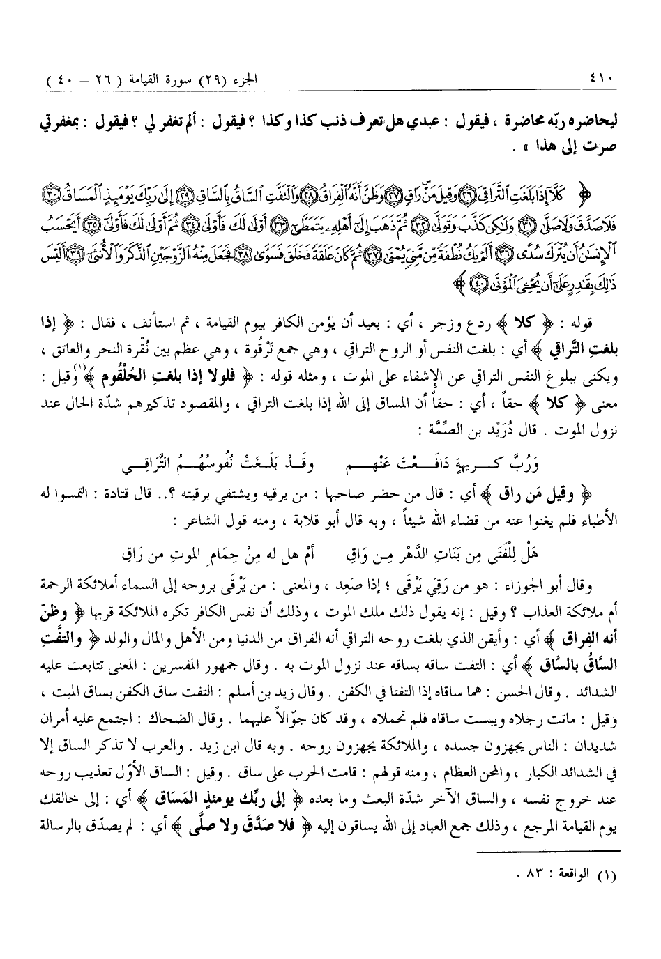 قَوْلُهُ: كَلَّا رَدْعٌ وَزَجْرٌ، أَيْ: بَعِيدٌ أَنْ يُؤْمِنَ الْكَافِرُ بِيَوْمِ الْقِيَامَةِ، ثُمَّ اسْتَأْنَفَ، فَقَالَ: إِذا بَلَغَتِ التَّراقِيَ أَيْ: بَلَغَتِ النَّفْسُ أَوِ الرُّوحُ التَّرَاقِيَ، وَهِيَ جَمْعُ تَرْقُوَةٍ، وَهِيَ عظم بين نقرة النَّحْرِ وَالْعَاتِقِ، وَيُكَنَّى بِبُلُوغِ النَّفْسِ التَّرَاقِي عَنِ الْإِشْفَاءِ عَلَى الْمَوْتِ، وَمِثْلُهُ قَوْلُهُ: فَلَوْلا إِذا بَلَغَتِ الْحُلْقُومَ «1» وَقِيلَ: