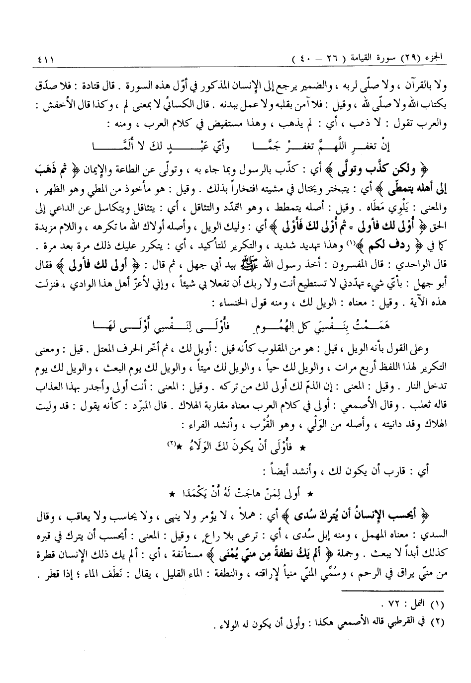 وَلكِنْ كَذَّبَ وَتَوَلَّى أَيْ: كَذَّبَ بِالرَّسُولِ وَبِمَا جَاءَ بِهِ، وَتَوَلَّى عَنِ الطَّاعَةِ وَالْإِيمَانِ ثُمَّ ذَهَبَ إِلى أَهْلِهِ يَتَمَطَّى أَيْ: يَتَبَخْتَرُ وَيَخْتَالُ فِي مِشْيَتِهِ افْتِخَارًا بِذَلِكَ. وَقِيلَ: هُوَ مَأْخُوذٌ مِنَ الْمَطِيِّ وَهُوَ الظَّهْرُ، وَالْمَعْنَى: يَلْوِي مَطَاهُ. وَقِيلَ: أَصْلُهُ يَتَمَطَّطُ، وَهُوَ التَّمَدُّدُ وَالتَّثَاقُلُ، أَيْ: يَتَثَاقَلُ وَيَتَكَاسَلُ عَنِ الدَّاعِي إِلَى الْحَقِّ أَوْلى لَكَ فَأَوْلى - ثُمَّ أَوْلى لَكَ فَأَوْلى أَيْ: وَلِيَكَ الْوَيْلَ، وَأَصْلُهُ أَوْلَاكَ اللَّهُ مَا تَكْرَهُهُ، وَاللَّامُ مَزِيدَةٌ كَمَا فِي رَدِفَ لَكُمْ «1» وهذا تهديد شديد، والتكرير للتأكيد، أي: يتكرر عَلَيْكَ ذَلِكَ مَرَّةً بَعْدَ مَرَّةٍ.