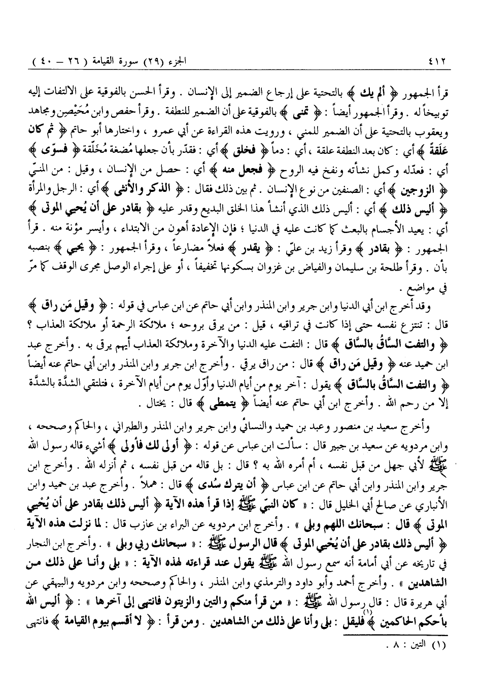 وَأَخْرَجَ سَعِيدُ بْنُ مَنْصُورٍ وَعَبْدُ بْنُ حُمَيْدٍ وَالنَّسَائِيُّ وَابْنُ جَرِيرٍ وَابْنُ الْمُنْذِرِ وَالطَّبَرَانِيُّ، وَالْحَاكِمُ وَصَحَّحَهُ، وَابْنُ مَرْدَوَيْهِ عَنْ سَعِيدِ بْنِ جُبَيْرٍ قَالَ: سألت ابن عباس عن قوله: أَوْلى لَكَ فَأَوْلى أَشَيْءٌ قَالَهُ رَسُولُ اللَّهِ صَلَّى اللَّهُ عَلَيْهِ وَسَلَّمَ لِأَبِي جَهْلٍ مِنْ قِبَلِ نَفْسِهِ، أَمْ أَمَرَهُ اللَّهُ بِهِ؟ قَالَ: بَلْ قَالَهُ مِنْ قِبَلِ نَفْسِهِ، ثُمَّ أَنْزَلَهُ اللَّهِ. وَأَخْرَجَ ابْنُ جَرِيرٍ وَابْنُ الْمُنْذِرِ وَابْنُ أَبِي حَاتِمٍ عَنِ ابْنِ عَبَّاسٍ أَنْ يُتْرَكَ سُدىً قَالَ: هَمَلًا. وَأَخْرَجَ عَبْدُ بْنُ حُمَيْدٍ وَابْنُ الْأَنْبَارِيِّ عَنْ صَالِحِ أَبِي الْخَلِيلِ قَالَ: «كَانَ النَّبِيُّ صَلَّى اللَّهُ عَلَيْهِ وَسَلَّمَ إِذَا قَرَأَ هَذِهِ الْآيَةَ أَلَيْسَ ذلِكَ بِقادِرٍ عَلى أَنْ يُحْيِيَ الْمَوْتى قَالَ: سُبْحَانَكَ اللَّهُمَّ وَبَلَى» . وَأَخْرَجَ ابْنُ مَرْدَوَيْهِ عَنِ الْبَرَاءِ بْنِ عَازِبٍ قَالَ: لَمَّا نَزَلَتْ هَذِهِ الْآيَةُ أَلَيْسَ ذلِكَ بِقادِرٍ عَلى أَنْ يُحْيِيَ الْمَوْتى قال الرسول صَلَّى اللَّهُ عَلَيْهِ وَسَلَّمَ: «سُبْحَانَكَ رَبِّي وَبَلَى» . وَأَخْرَجَ ابْنُ النَّجَّارِ فِي تَارِيخِهِ عَنْ أَبِي أُمَامَةَ أَنَّهُ سَمِعَ رَسُولَ اللَّهِ صَلَّى اللَّهُ عَلَيْهِ وَسَلَّمَ يَقُولُ عِنْدَ قِرَاءَتِهِ لِهَذِهِ الْآيَةِ: «بَلَى وَأَنَا عَلَى ذَلِكَ مِنَ الشَّاهِدَيْنِ» . وَأَخْرَجَ أَحْمَدُ وَأَبُو دَاوُدَ وَالتِّرْمِذِيُّ وَابْنُ الْمُنْذِرِ، وَالْحَاكِمُ وَصَحَّحَهُ وَابْنُ مَرْدَوَيْهِ وَالْبَيْهَقِيُّ عَنْ أَبِي هُرَيْرَةَ قَالَ: قَالَ رَسُولُ اللَّهِ صَلَّى اللَّهُ عَلَيْهِ وَسَلَّمَ: «مَنْ قَرَأَ مِنْكُمْ وَالتِّينِ وَالزَّيْتُونِ فَانْتَهَى إِلَى آخِرِهَا» : أَلَيْسَ اللَّهُ بِأَحْكَمِ الْحاكِمِينَ «1» فَلْيَقُلْ: بَلَى وَأَنَا عَلَى ذَلِكَ مِنَ الشَّاهِدِينَ. وَمَنْ قرأ: لا أُقْسِمُ بِيَوْمِ الْقِيامَةِ فانتهى
