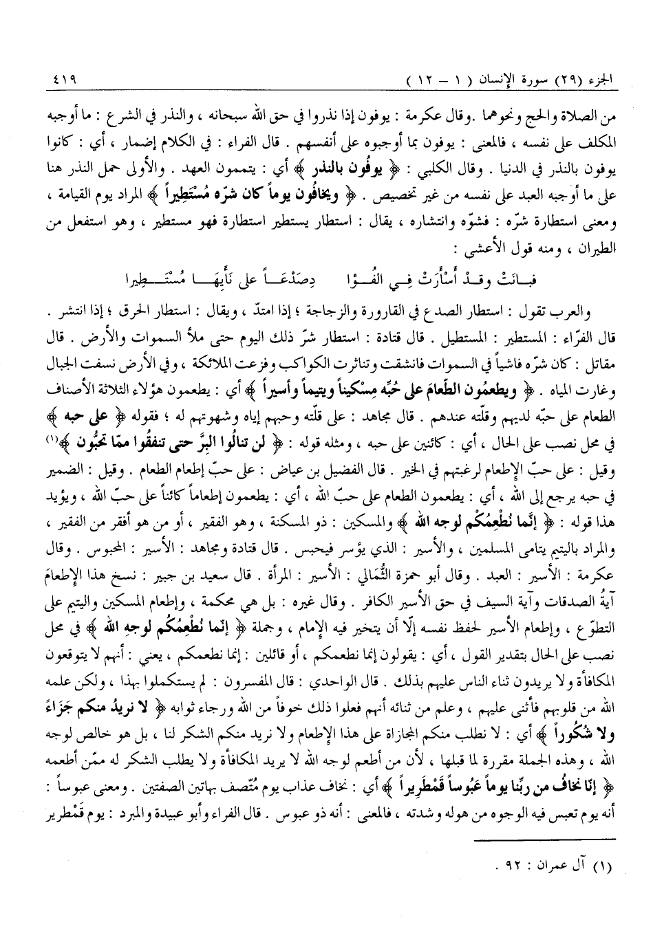 قَالَ الْفَرَّاءُ: الْمُسْتَطِيرُ: الْمُسْتَطِيلُ. قَالَ قَتَادَةُ: اسْتَطَارَ شَرُّ ذَلِكَ الْيَوْمِ حَتَّى مَلَأَ السموات وَالْأَرْضَ. قَالَ مُقَاتِلٌ: كَانَ شَرُّهُ فَاشِيًا فِي السموات فَانْشَقَّتْ وَتَنَاثَرَتِ الْكَوَاكِبُ وَفَزِعَتِ الْمَلَائِكَةُ، وَفِي الْأَرْضِ نُسِفَتِ الْجِبَالُ وَغَارَتِ الْمِيَاهُ. وَيُطْعِمُونَ الطَّعامَ عَلى حُبِّهِ مِسْكِيناً وَيَتِيماً وَأَسِيراً أَيْ: يُطْعِمُونَ هَؤُلَاءِ الثَّلَاثَةَ الْأَصْنَافِ الطَّعَامَ عَلَى حُبِّهِ لَدَيْهِمْ وَقِلَّتِهِ عِنْدَهُمْ. قَالَ مُجَاهِدٌ: عَلَى قِلَّتِهِ وَحُبِّهِمْ إِيَّاهُ وَشَهْوَتِهِمْ لَهُ فَقَوْلُهُ عَلى حُبِّهِ فِي مَحَلِّ نَصْبٍ عَلَى الْحَالِ، أَيْ: كَائِنَيْنِ عَلَى حُبِّهِ، وَمِثْلُهُ قَوْلُهُ: لَنْ تَنالُوا الْبِرَّ حَتَّى تُنْفِقُوا مِمَّا تُحِبُّونَ «1» وَقِيلَ: عَلَى حُبِّ الْإِطْعَامِ لِرَغْبَتِهِمْ فِي الْخَيْرِ. قَالَ الْفُضَيْلُ بْنُ عِيَاضٍ: عَلَى حُبِّ إِطْعَامِ الطَّعَامِ. وَقِيلَ: الضَّمِيرُ فِي حُبِّهِ يَرْجِعُ إِلَى اللَّهِ، أَيْ: يُطْعِمُونَ الطَّعَامَ عَلَى حُبِّ اللَّهِ، أَيْ: يُطْعِمُونَ إِطْعَامًا كَائِنًا عَلَى حُبِّ اللَّهِ، وَيُؤَيِّدُ هَذَا قَوْلُهُ: إِنَّما نُطْعِمُكُمْ لِوَجْهِ اللَّهِ وَالْمِسْكِينُ: ذُو الْمَسْكَنَةِ، وَهُوَ الْفَقِيرُ، أَوْ مَنْ هُوَ أَفْقَرُ مِنَ الْفَقِيرِ، وَالْمُرَادُ بِالْيَتِيمِ يَتَامَى الْمُسْلِمِينَ، وَالْأَسِيرُ: الَّذِي يُؤْسَرُ فَيُحْبَسُ. قَالَ قَتَادَةُ وَمُجَاهِدٌ: الْأَسِيرُ: الْمَحْبُوسُ. وَقَالَ عِكْرِمَةُ: الْأَسِيرُ: الْعَبْدُ. وَقَالَ أَبُو حَمْزَةَ الثُّمَالِيُّ: الْأَسِيرُ: الْمَرْأَةُ. قَالَ سَعِيدُ بْنُ جُبَيْرٍ: نَسَخَ هَذَا الْإِطْعَامَ آيَةُ الصَّدَقَاتِ وَآيَةُ السَّيْفِ فِي حَقِّ الْأَسِيرِ الْكَافِرِ. وَقَالَ غَيْرُهُ: بَلْ هِيَ مُحْكَمَةٌ، وَإِطْعَامُ الْمِسْكِينِ وَالْيَتِيمِ عَلَى التَّطَوُّعِ، وَإِطْعَامُ الْأَسِيرِ لِحِفْظِ نَفْسِهِ إلّا أَنْ يَتَخَيَّرَ فِيهِ الْإِمَامُ، وَجُمْلَةُ إِنَّما نُطْعِمُكُمْ لِوَجْهِ اللَّهِ فِي مَحَلِّ نَصْبٍ عَلَى الْحَالِ بِتَقْدِيرِ الْقَوْلِ، أَيْ: يَقُولُونَ إِنَّمَا نُطْعِمُكُمْ، أَوْ قَائِلِينَ: إِنَّمَا نُطْعِمُكُمْ، يَعْنِي: أَنَّهُمْ لَا يَتَوَقَّعُونَ الْمُكَافَأَةَ وَلَا يُرِيدُونَ ثَنَاءَ النَّاسِ عَلَيْهِمْ بِذَلِكَ. قال الواحدي: قال المفسرون: لم يَسْتَكْمِلُوا بِهَذَا، وَلَكِنْ عَلِمَهُ اللَّهُ مِنْ قُلُوبِهِمْ فَأَثْنَى عَلَيْهِمْ، وَعَلِمَ مِنْ ثَنَائِهِ أَنَّهُمْ فَعَلُوا ذَلِكَ خَوْفًا مِنَ اللَّهِ وَرَجَاءَ ثَوَابِهِ لَا نُرِيدُ مِنْكُمْ جَزاءً وَلا شُكُوراً أَيْ: لَا نَطْلُبُ مِنْكُمُ الْمُجَازَاةَ عَلَى هَذَا الْإِطْعَامِ وَلَا نُرِيدُ مِنْكُمُ الشُّكْرَ لَنَا، بَلْ هُوَ خَالِصٌ لِوَجْهِ اللَّهِ، وَهَذِهِ الْجُمْلَةُ مُقَرِّرَةٌ لِمَا قَبْلَهَا، لِأَنَّ مَنْ أَطْعَمَ لِوَجْهِ اللَّهِ لَا يُرِيدُ الْمُكَافَأَةَ وَلَا يَطْلُبُ الشُّكْرَ لَهُ مِمَّنْ أَطْعَمَهُ إِنَّا نَخافُ مِنْ رَبِّنا يَوْماً عَبُوساً قَمْطَرِيراً أَيْ: نَخَافُ عَذَابَ يَوْمٍ مُتَّصِفٍ بِهَاتَيْنِ الصِّفَتَيْنِ. وَمَعْنَى عَبُوسًا:
