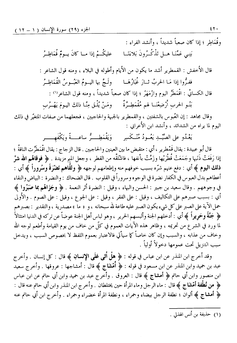 قَالَ أَبُو عُبَيْدَةَ: يقال قمطرير، أي: متقبض مَا بَيْنَ الْعَيْنَيْنِ وَالْحَاجِبَيْنِ. قَالَ الزَّجَّاجُ: يُقَالُ اقْمَطَرَّتِ النَّاقَةُ إِذَا رَفَعَتْ ذَنَبَهَا وَجَمَعَتْ قُطْرَيْهَا وزمّت بأنفها، فاشتقّه مِنَ الْقَطْرِ، وَجَعَلَ الْمِيمَ مَزِيدَةً. فَوَقاهُمُ اللَّهُ شَرَّ ذلِكَ الْيَوْمِ أي: دفع عنهم شرّه بسبب خوفهم منه وإطعامهم لوجهه وَلَقَّاهُمْ نَضْرَةً وَسُرُوراً أَيْ: