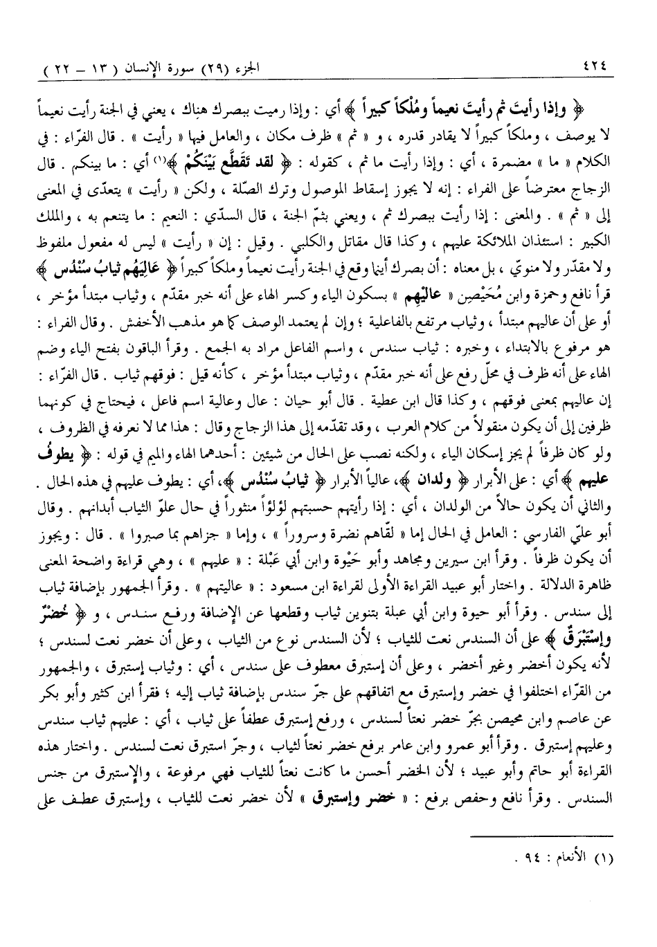 وَإِذا رَأَيْتَ ثَمَّ رَأَيْتَ نَعِيماً وَمُلْكاً كَبِيراً أَيْ: وَإِذَا رَمَيْتَ بِبَصَرِكَ هُنَاكَ، يَعْنِي فِي الْجَنَّةِ رَأَيْتَ نَعِيمًا لَا يُوصَفُ، وَمُلْكًا كَبِيرًا لَا يُقَادَرُ قَدْرُهُ، وَ «ثَمَّ» ظَرْفُ مَكَانٍ، وَالْعَامِلُ فِيهَا «رَأَيْتَ» . قَالَ الْفَرَّاءُ: فِي الْكَلَامِ «مَا» مُضْمَرَةٌ، أَيْ: وَإِذَا رَأَيْتَ مَا ثَمَّ، كقوله: لَقَدْ تَقَطَّعَ بَيْنَكُمْ «1» أَيْ: مَا بَيْنَكُمْ. قَالَ الزَّجَّاجُ مُعْتَرِضًا عَلَى الْفَرَّاءِ: إِنَّهُ لَا يَجُوزُ إِسْقَاطُ الْمَوْصُولِ وَتَرْكُ الصِّلَةِ، وَلَكِنْ «رَأَيْتَ» يَتَعَدَّى فِي الْمَعْنَى إِلَى «ثَمَّ» . وَالْمَعْنَى: إِذَا رَأَيْتَ بِبَصَرِكَ ثَمَّ، وَيَعْنِي بِثَمَّ الْجَنَّةَ، قَالَ السُّدِّيُّ: النَّعِيمُ: مَا يُتَنَعَّمُ بِهِ، وَالْمُلْكُ الْكَبِيرُ: اسْتِئْذَانُ الْمَلَائِكَةِ عَلَيْهِمْ، وَكَذَا قَالَ مُقَاتِلٌ وَالْكَلْبِيُّ. وَقِيلَ: إِنَّ «رَأَيْتَ» لَيْسَ لَهُ مَفْعُولٌ مَلْفُوظٌ وَلَا مُقَدَّرٌ وَلَا مَنْوِيٌّ، بَلْ مَعْنَاهُ: أَنَّ بَصَرَكَ أَيْنَمَا وَقَعَ فِي الْجَنَّةِ رَأَيْتَ نَعِيمًا وَمُلْكًا كَبِيرًا عالِيَهُمْ ثِيابُ سُندُسٍ قَرَأَ نَافِعٌ وَحَمْزَةُ وَابْنُ مُحَيْصِنٍ «عَالِيهِمْ» بِسُكُونِ الْيَاءِ وَكَسْرِ الْهَاءِ عَلَى أَنَّهُ خَبَرٌ مُقَدَّمٌ، وَثِيَابٌ مُبْتَدَأٌ مُؤَخَّرٌ، أَوْ عَلَى أَنَّ عاليهم مبتدأ، وثياب مُرْتَفِعٌ بِالْفَاعِلِيَّةِ وَإِنْ لَمْ يَعْتَمِدِ الْوَصْفَ كَمَا هُوَ مَذْهَبُ الْأَخْفَشِ. وَقَالَ الْفَرَّاءُ: