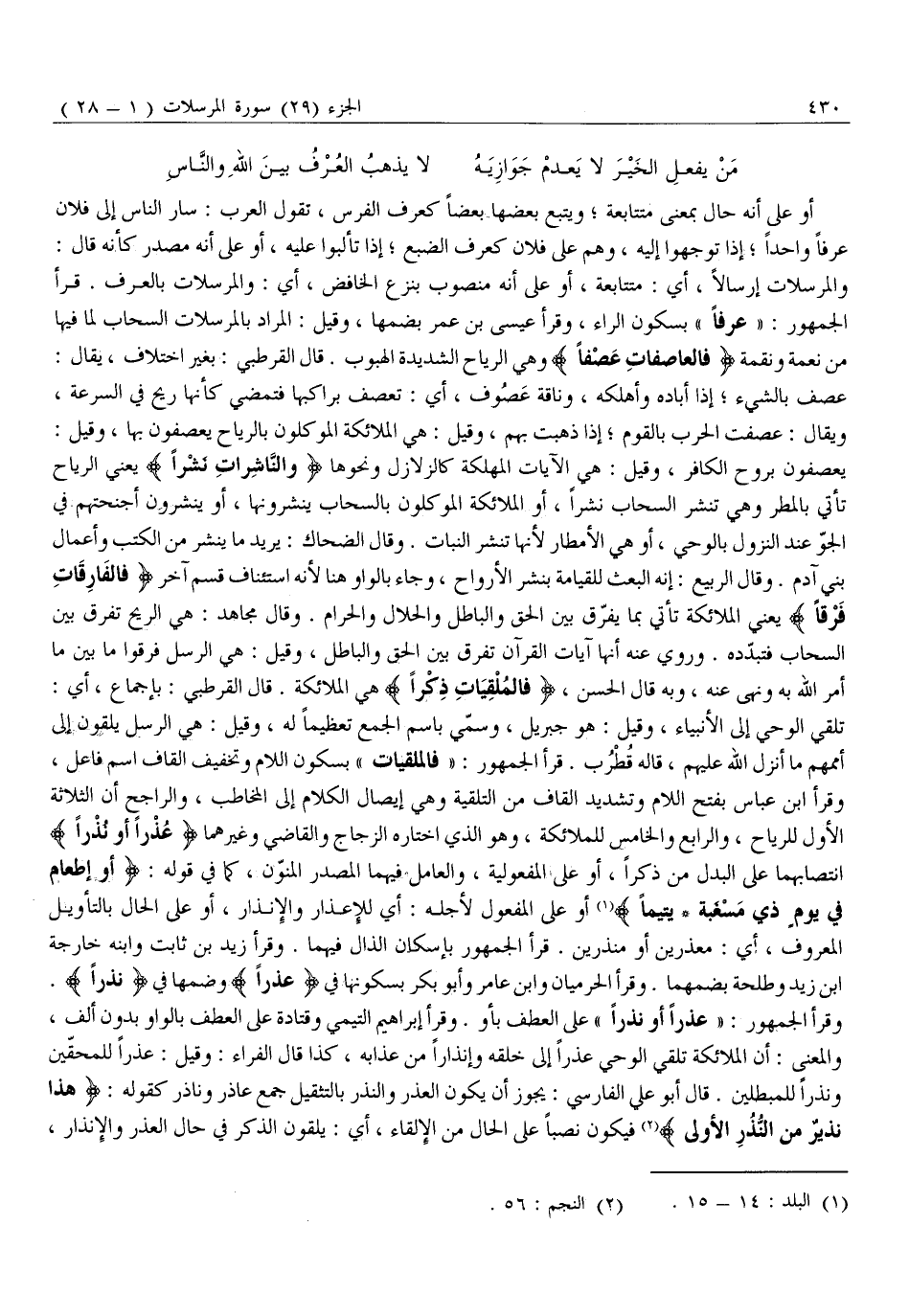 يَعْصِفُونَ بِرُوحِ الْكَافِرِ، وَقِيلَ: هِيَ الْآيَاتُ الْمُهْلِكَةُ كَالزَّلَازِلِ وَنَحْوِهَا وَالنَّاشِراتِ نَشْراً يَعْنِي الرِّيَاحَ تَأْتِي بِالْمَطَرِ وَهِيَ تَنْشُرُ السَّحَابَ نَشْرًا، أَوِ الْمَلَائِكَةُ الْمُوَكَّلُونَ بِالسَّحَابِ يَنْشُرُونَهَا، أَوْ يَنْشُرُونَ أَجْنِحَتَهُمْ فِي الْجَوِّ عِنْدَ النُّزُولِ بِالْوَحْيِ، أَوْ هِيَ الْأَمْطَارُ لِأَنَّهَا تَنْشُرُ النَّبَاتَ. وَقَالَ الضَّحَّاكُ: يُرِيدُ مَا يُنْشَرُ مِنَ الْكُتُبِ وَأَعْمَالِ بَنِي آدَمَ. وَقَالَ الرَّبِيعُ: إِنَّهُ الْبَعْثُ لِلْقِيَامَةِ بِنَشْرِ الْأَرْوَاحِ، وَجَاءَ بِالْوَاوِ هُنَا لِأَنَّهُ اسْتِئْنَافُ قَسَمٍ آخَرَ فَالْفارِقاتِ فَرْقاً يَعْنِي الْمَلَائِكَةَ تَأْتِي بِمَا يُفَرِّقُ بَيْنَ الْحَقِّ وَالْبَاطِلِ وَالْحَلَّالِ وَالْحَرَامِ. وَقَالَ مُجَاهِدٌ: هِيَ الرِّيحُ تُفَرِّقُ بَيْنَ السَّحَابِ فَتُبَدِّدُهُ. وَرُوِيَ عَنْهُ أَنَّهَا آيَاتُ الْقُرْآنِ تَفْرُقُ بَيْنَ الْحَقِّ وَالْبَاطِلِ، وَقِيلَ: هِيَ الرُّسُلُ فَرَقُوا مَا بَيْنَ مَا أَمَرَ اللَّهُ بِهِ وَنَهَى عَنْهُ، وَبِهِ قَالَ الْحَسَنُ، فَالْمُلْقِياتِ ذِكْراً هِيَ الْمَلَائِكَةُ. قَالَ الْقُرْطُبِيُّ: بِإِجْمَاعٍ، أَيْ: