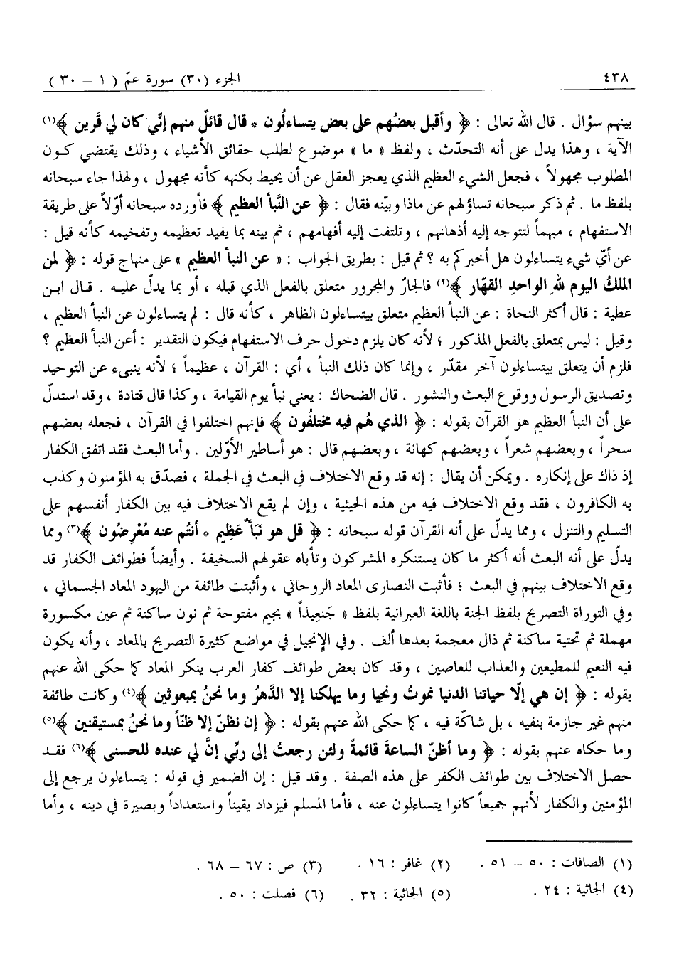 عَنْ أَيِّ شَيْءٍ يَتَسَاءَلُونَ هَلْ أَخْبَرَكُمْ بِهِ؟ ثُمَّ قِيلَ: بِطَرِيقِ الْجَوَابِ: «عَنِ النَّبَإِ الْعَظِيمِ» عَلَى مِنْهَاجِ قَوْلِهِ: لِمَنِ الْمُلْكُ الْيَوْمَ لِلَّهِ الْواحِدِ الْقَهَّارِ «2» فَالْجَارُّ وَالْمَجْرُورُ مُتَعَلِّقٌ بِالْفِعْلِ الَّذِي قَبْلَهُ، أَوْ بِمَا يَدُلُّ عَلَيْهِ. قَالَ ابْنُ عَطِيَّةَ: قَالَ أَكْثَرُ النُّحَاةِ: عَنْ النَّبَإِ الْعَظِيمِ مُتَعَلِّقٌ بِيَتَسَاءَلُونَ الظَّاهِرِ، كَأَنَّهُ قَالَ: لِمَ يَتَسَاءَلُونَ عَنِ النَّبَإِ الْعَظِيمِ، وَقِيلَ: لَيْسَ بِمُتَعَلِّقٍ بِالْفِعْلِ الْمَذْكُورِ لِأَنَّهُ كَانَ يَلْزَمُ دُخُولُ حَرْفِ الِاسْتِفْهَامِ فَيَكُونُ التَّقْدِيرُ: أَعَنِ النَّبَإِ الْعَظِيمِ؟
