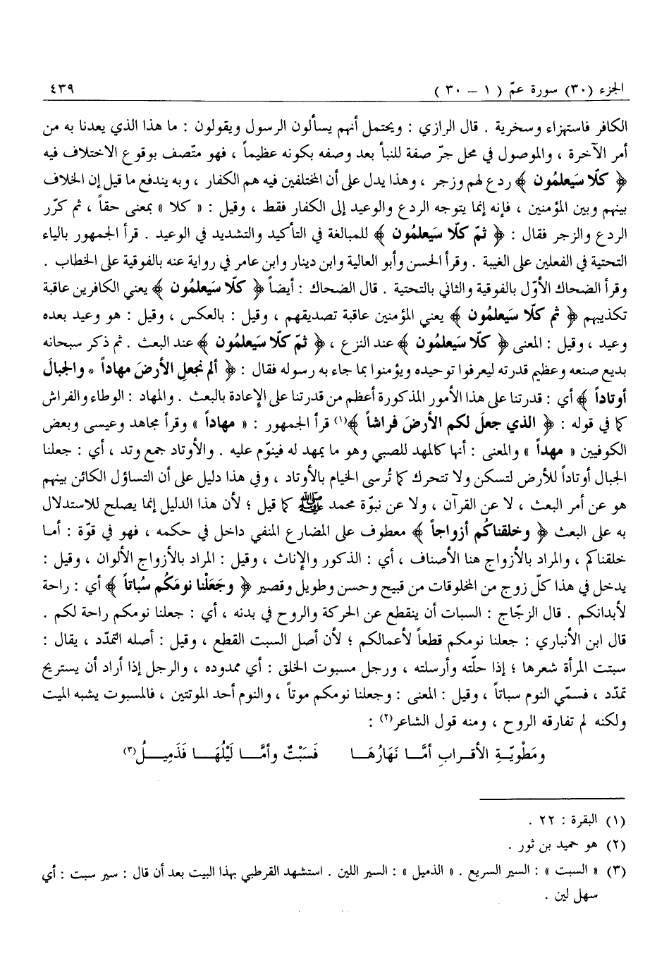 الْكَافِرُ فَاسْتِهْزَاءً وَسُخْرِيَةً. قَالَ الرَّازِّيُّ: وَيُحْتَمَلُ أَنَّهُمْ يَسْأَلُونَ الرَّسُولَ وَيَقُولُونَ: مَا هَذَا الَّذِي يَعِدُنَا بِهِ مِنْ أَمْرِ الْآخِرَةِ، وَالْمَوْصُولُ فِي مَحَلِّ جَرِّ صِفَةٍ لِلنَّبَإِ بَعْدَ وَصْفِهِ بِكَوْنِهِ عَظِيمًا، فهو متّصف بِوُقُوعِ الِاخْتِلَافِ فِيهِ كَلَّا سَيَعْلَمُونَ رَدْعٌ لَهُمْ وَزَجْرٌ، وَهَذَا يَدُلُّ عَلَى أَنَّ الْمُخْتَلِفِينَ فِيهِ هُمُ الْكُفَّارُ، وَبِهِ يَنْدَفِعُ مَا قِيلَ إِنَّ الْخِلَافَ بَيْنَهُمْ وَبَيْنَ الْمُؤْمِنِينَ، فَإِنَّهُ إِنَّمَا يَتَوَجَّهُ الرَّدْعُ وَالْوَعِيدُ إِلَى الْكُفَّارِ فَقَطْ، وَقِيلَ: «كَلَّا» بِمَعْنَى حَقًّا، ثُمَّ كَرَّرَ الرَّدْعُ وَالزَّجْرُ فَقَالَ: ثُمَّ كَلَّا سَيَعْلَمُونَ لِلْمُبَالَغَةِ فِي التَّأْكِيدِ وَالتَّشْدِيدِ فِي الْوَعِيدِ. قَرَأَ الْجُمْهُورُ بِالْيَاءِ التَّحْتِيَّةِ فِي الْفِعْلَيْنِ عَلَى الْغَيْبَةِ. وَقَرَأَ الْحَسَنُ وَأَبُو الْعَالِيَةِ وَابْنُ دِينَارٍ وَابْنُ عَامِرٍ فِي رِوَايَةٍ عَنْهُ بِالْفَوْقِيَّةِ عَلَى الْخِطَابِ.