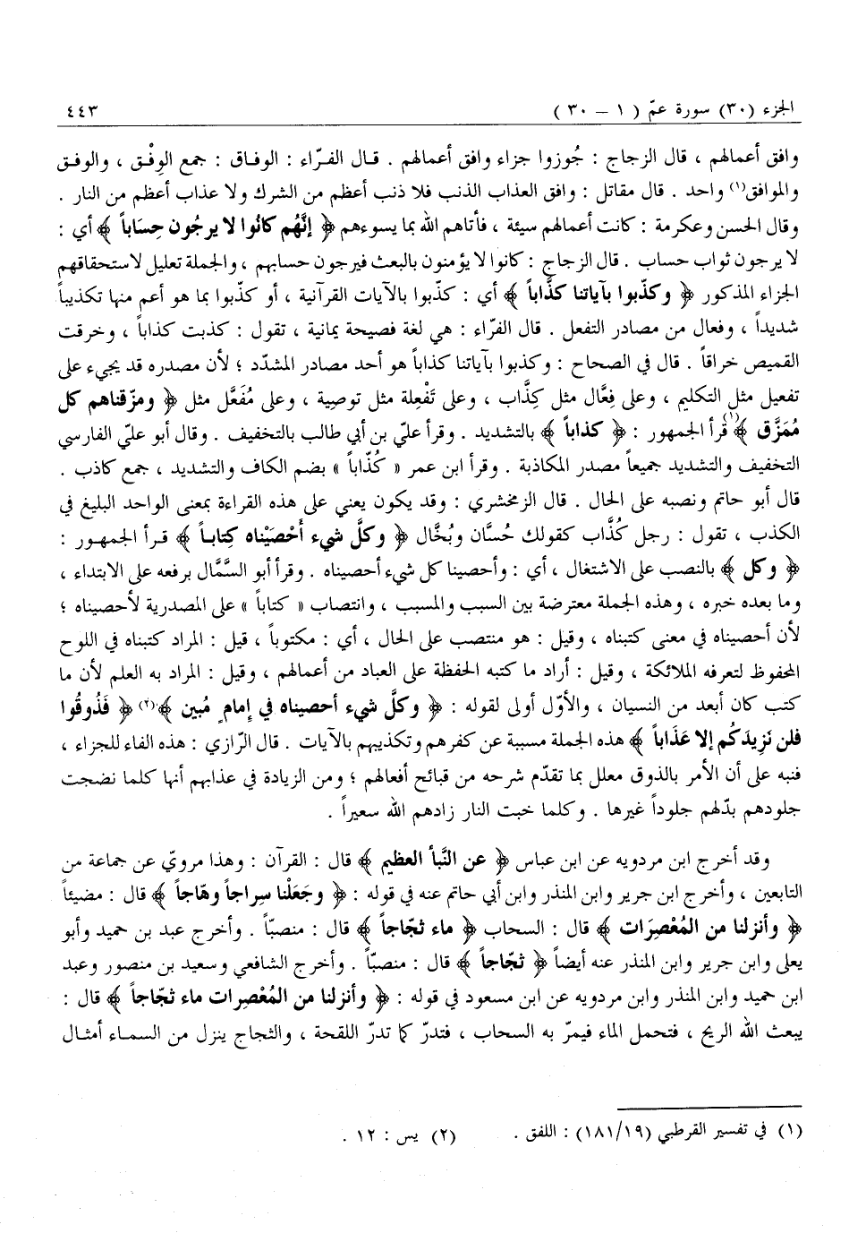 لَا يَرْجُونَ ثَوَابَ حِسَابٍ. قَالَ الزَّجَّاجُ: كَانُوا لَا يُؤْمِنُونَ بِالْبَعْثِ فَيَرْجُونَ حِسَابَهُمْ، وَالْجُمْلَةُ تَعْلِيلٌ لِاسْتِحْقَاقِهِمُ الْجَزَاءَ الْمَذْكُورَ وَكَذَّبُوا بِآياتِنا كِذَّاباً أَيْ: كَذَّبُوا بِالْآيَاتِ الْقُرْآنِيَّةِ، أَوْ كَذَّبُوا بِمَا هُوَ أعم منها تكذيبا شديدا، وفعال مِنْ مَصَادِرِ التَّفَعُّلِ. قَالَ الْفَرَّاءُ: هِيَ لُغَةٌ فَصِيحَةٌ يَمَانِيَّةٌ، تَقُولُ: كَذَّبْتُ كِذَّابًا، وَخَرَّقْتُ الْقَمِيصَ خِرَّاقًا. قَالَ فِي الصِّحَاحِ: وَكَذَّبُوا بِآيَاتِنَا كِذَّابًا هُوَ أَحَدُ مَصَادِرِ الْمُشَدَّدِ لِأَنَّ مَصْدَرَهُ قَدْ يَجِيءُ عَلَى تَفْعِيلٍ مِثْلَ التَّكْلِيمِ، وَعَلَى فِعَّالٍ مِثْلَ كِذَّابٍ، وَعَلَى تَفْعِلَةٍ مِثْلَ تَوْصِيَةٍ، وَعَلَى مفعّل مثل وَمَزَّقْناهُمْ كُلَّ مُمَزَّقٍ قَرَأَ الْجُمْهُورُ: كِذَّاباً بِالتَّشْدِيدِ. وَقَرَأَ عَلِيُّ بْنُ أَبِي طَالِبٍ بِالتَّخْفِيفِ. وَقَالَ أَبُو عَلِيٍّ الْفَارِسِيُّ التَّخْفِيفُ وَالتَّشْدِيدُ جَمِيعًا مَصْدَرُ الْمُكَاذَبَةِ. وَقَرَأَ ابْنُ عُمَرَ «كِذَّابًا» بِضَمِّ الْكَافِ وَالتَّشْدِيدِ، جَمْعَ كَاذِبٍ.