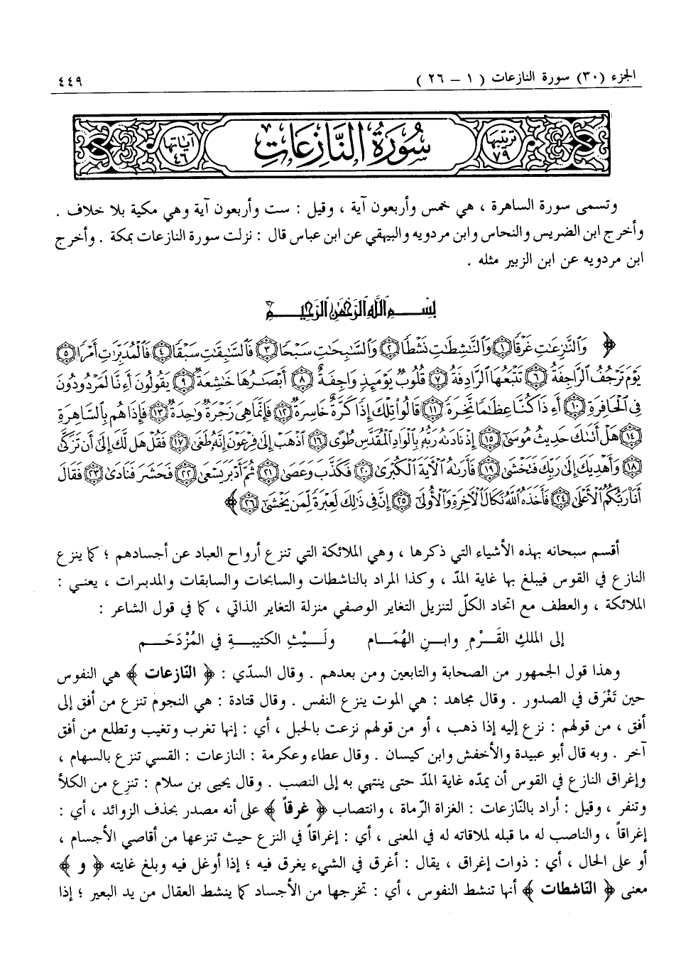 وتسمى سورة الساهرة، هي خمس وأربعون آية، وقيل: ست وأربعون آية وَهِيَ مَكِّيَّةٌ بِلَا خِلَافٍ.