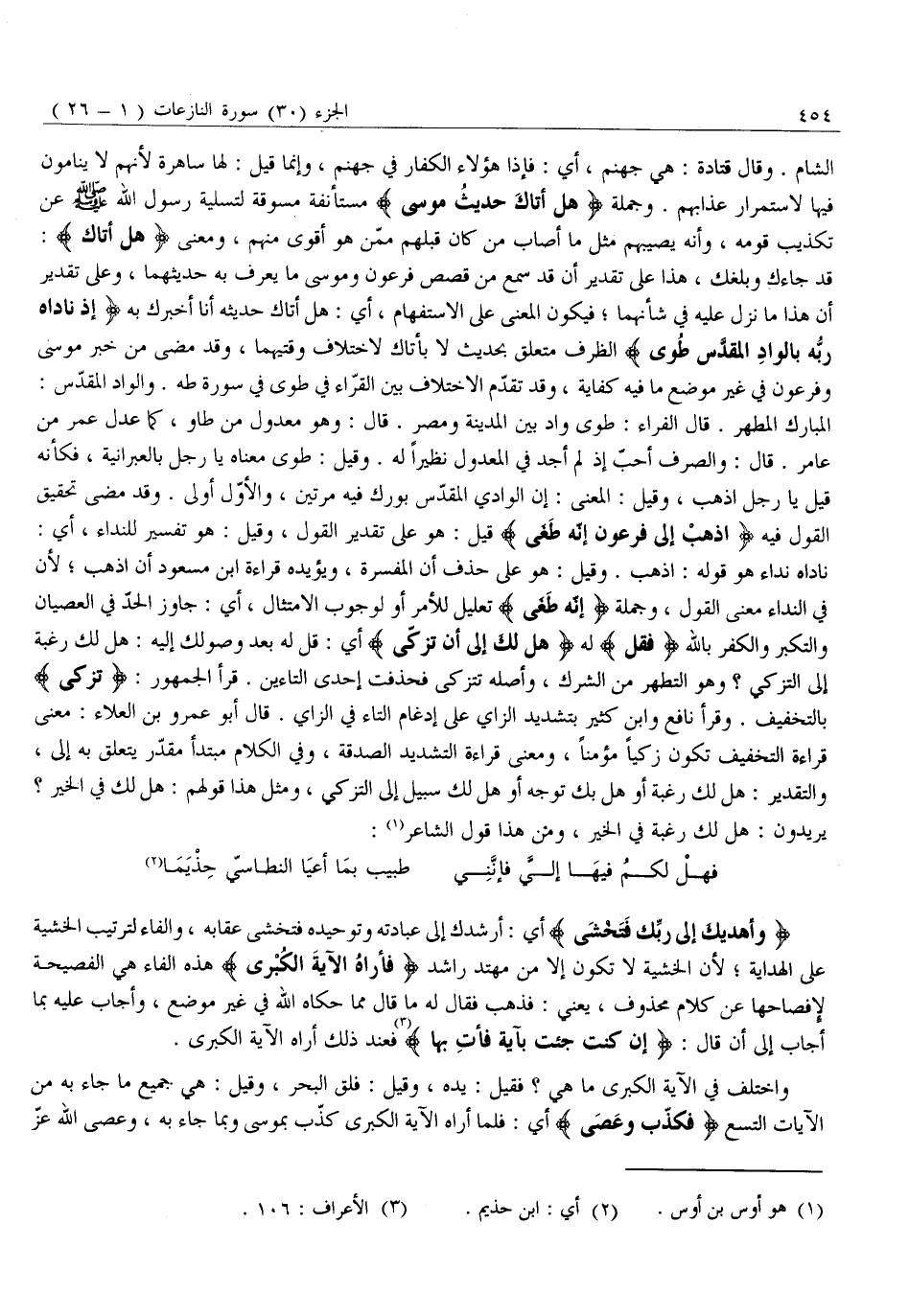 نَادَاهُ نِدَاءً هُوَ قَوْلُهُ: اذْهَبْ. وَقِيلَ: هُوَ عَلَى حَذْفِ أَنْ الْمُفَسِّرَةِ، وَيُؤَيِّدُهُ قِرَاءَةُ ابْنِ مَسْعُودٍ أَنِ اذْهَبْ لِأَنَّ فِي النِّدَاءِ مَعْنَى الْقَوْلِ، وَجُمْلَةُ إِنَّهُ طَغى تَعْلِيلٌ لِلْأَمْرِ أَوْ لِوُجُوبِ الِامْتِثَالِ، أَيْ: جَاوَزَ الْحَدَّ فِي الْعِصْيَانِ وَالتَّكَبُّرِ وَالْكُفْرِ بِاللَّهِ فَقُلْ لَهُ هَلْ لَكَ إِلى أَنْ تَزَكَّى أي: قل له بَعْدَ وُصُولِكَ إِلَيْهِ: هَلْ لَكَ رَغْبَةٌ إِلَى التَّزَكِّي؟ وَهُوَ التَّطَهُّرُ مِنَ الشِّرْكِ، وَأَصْلُهُ تَتَزَكَّى فحذفت إحدى التاءين. قرأ الْجُمْهُورُ: تَزَكَّى بِالتَّخْفِيفِ. وَقَرَأَ نَافِعٌ وَابْنُ كَثِيرٍ بِتَشْدِيدِ الزَّايِ عَلَى إِدْغَامِ التَّاءِ فِي الزَّايِ. قَالَ أَبُو عَمْرِو بْنُ الْعَلَاءِ: مَعْنَى قِرَاءَةِ التَّخْفِيفِ تَكُونُ زَكِيًّا مُؤْمِنًا، وَمَعْنَى قِرَاءَةُ التَّشْدِيدِ الصَّدَقَةُ، وَفِي الْكَلَامِ مُبْتَدَأٌ مُقَدَّرٌ يَتَعَلَّقُ بِهِ إِلَى، وَالتَّقْدِيرُ: هَلْ لَكَ رَغْبَةٌ أَوْ هَلْ بك تَوَجُّهٌ أَوْ هَلْ لَكَ سَبِيلٌ إِلَى التَّزَكِّي، وَمِثْلُ هَذَا قَوْلُهُمْ: هَلْ لَكَ فِي الْخَيْرِ؟