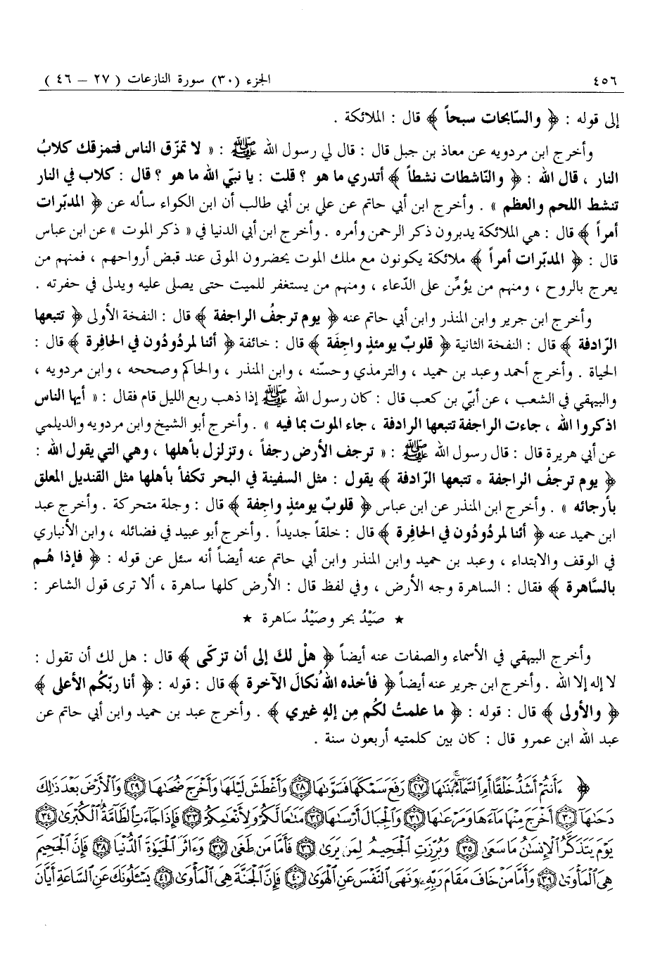 يَوْمَ تَرْجُفُ الرَّاجِفَةُ- تَتْبَعُهَا الرَّادِفَةُ يَقُولُ: مَثَلُ السَّفِينَةِ فِي الْبَحْرِ تَكْفَأُ بِأَهْلِهَا مَثَلُ الْقِنْدِيلِ الْمُعَلَّقِ بِأَرْجَائِهِ» . وَأَخْرَجَ ابْنُ الْمُنْذِرِ عَنِ ابْنِ عَبَّاسٍ قُلُوبٌ يَوْمَئِذٍ واجِفَةٌ قَالَ: وَجِلَةٌ مُتَحَرِّكَةٌ. وأخرج عبد ابن حميد عنه أَإِنَّا لَمَرْدُودُونَ فِي الْحافِرَةِ قَالَ: خَلْقًا جَدِيدًا. وَأَخْرَجَ أَبُو عُبَيْدٍ فِي فَضَائِلِهِ، وَابْنُ الْأَنْبَارِيِّ فِي الْوَقْفِ وَالِابْتِدَاءِ، وَعَبْدُ بْنُ حُمَيْدٍ وَابْنُ الْمُنْذِرِ وَابْنُ أَبِي حَاتِمٍ عَنْهُ أَيْضًا أَنَّهُ سُئِلَ عَنْ قَوْلِهِ: فَإِذا هُمْ بِالسَّاهِرَةِ فَقَالَ: السَّاهِرَةُ وَجْهُ الْأَرْضِ، وَفِي لَفْظٍ قَالَ: الْأَرْضُ كُلُّهَا سَاهِرَةٌ، أَلَا تَرَى قَوْلَ الشَّاعِرِ: