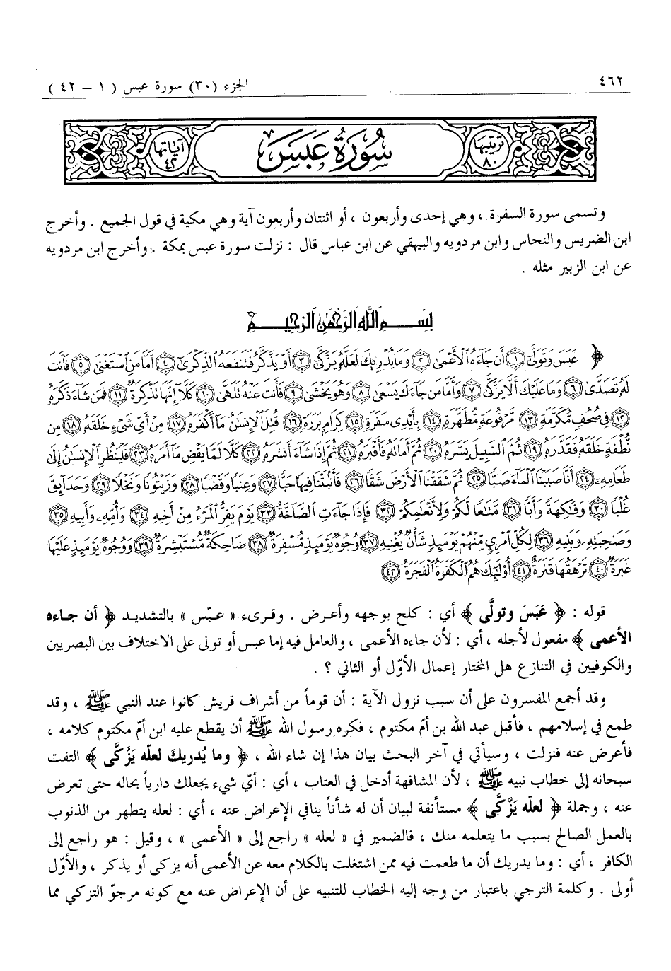 قَوْلُهُ: عَبَسَ وَتَوَلَّى أي: كلح بوجهه وَأَعْرَضَ. وَقُرِئَ «عَبَّسَ» بِالتَّشْدِيدِ أَنْ جاءَهُ الْأَعْمى مَفْعُولٌ لِأَجْلِهِ، أَيْ: لِأَنْ جَاءَهُ الْأَعْمَى، وَالْعَامِلُ فِيهِ إِمَّا عَبَسَ أَوْ تَوَلَّى عَلَى الِاخْتِلَافِ بَيْنَ الْبَصْرِيِّينَ وَالْكُوفِيِّينَ فِي التَّنَازُعِ هَلِ الْمُخْتَارُ إِعْمَالُ الْأَوَّلِ أَوِ الثَّانِي؟.