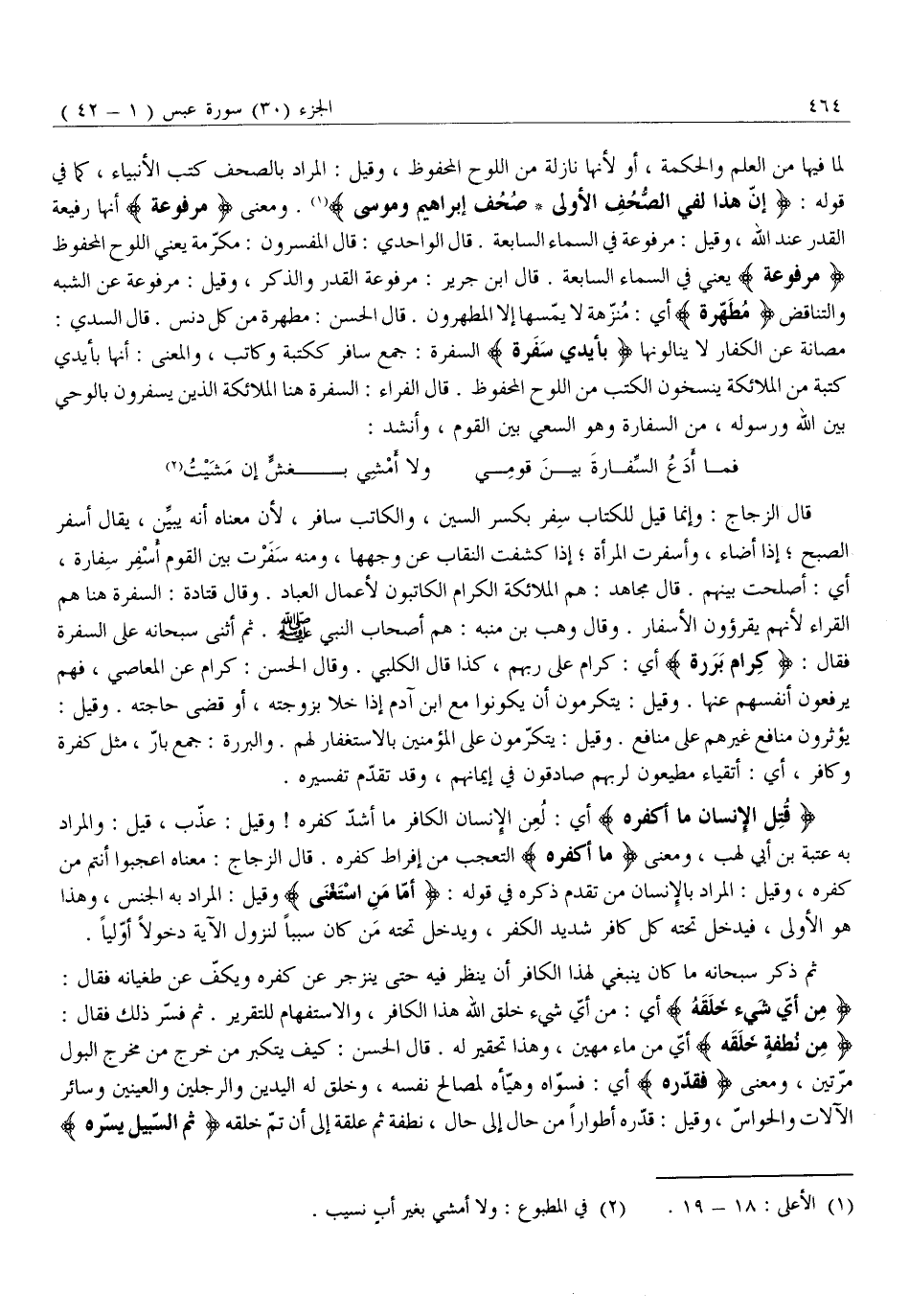 قَالَ الزَّجَّاجُ: وَإِنَّمَا قِيلَ لِلْكِتَابِ سِفْرٌ بِكَسْرِ السين، والكاتب سافر، لأن معناه أنه يبيّن، يُقَالُ أَسْفَرَ الصُّبْحُ إِذَا أَضَاءَ، وَأَسْفَرَتِ الْمَرْأَةُ إِذَا كَشَفَتِ النِّقَابَ عَنْ وَجْهِهَا، وَمِنْهُ سَفَرْتُ بَيْنَ الْقَوْمِ أَسْفَرَ سِفَارَةً، أَيْ: أَصْلَحْتُ بَيْنَهُمْ. قَالَ مُجَاهِدٌ: هُمُ الْمَلَائِكَةُ الْكِرَامُ الْكَاتِبُونَ لِأَعْمَالِ الْعِبَادِ. وَقَالَ قَتَادَةُ: السَّفَرَةُ هُنَا هُمُ الْقُرَّاءُ لِأَنَّهُمْ يَقْرَءُونَ الْأَسْفَارَ. وَقَالَ وَهْبُ بْنُ مُنَبِّهٍ: هُمْ أَصْحَابُ النَّبِيِّ صَلَّى اللَّهُ عَلَيْهِ وَسَلَّمَ. ثُمَّ أَثْنَى سُبْحَانَهُ عَلَى السَّفَرَةِ فَقَالَ: كِرامٍ بَرَرَةٍ أَيْ: كِرَامٍ عَلَى رَبِّهِمْ، كَذَا قَالَ الْكَلْبِيُّ. وَقَالَ الْحَسَنُ: كِرَامٌ عَنِ الْمَعَاصِي، فَهُمْ يَرْفَعُونَ أَنْفُسَهُمْ عَنْهَا. وَقِيلَ: يَتَكَرَّمُونَ أَنْ يَكُونُوا مَعَ ابْنِ آدَمَ إِذَا خَلَا بِزَوْجَتِهِ، أَوْ قَضَى حَاجَتَهُ. وَقِيلَ: