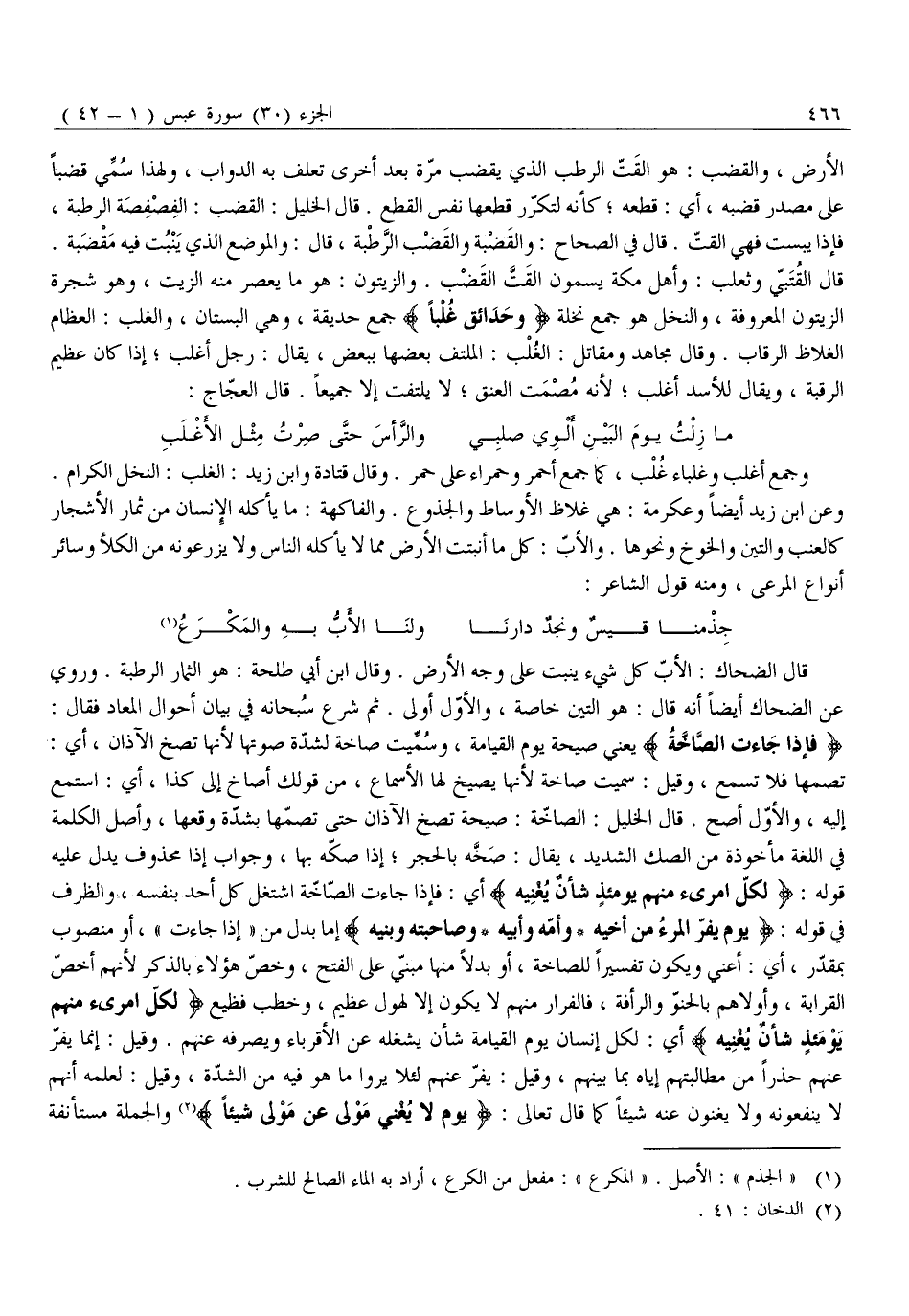 تُصِمُّهَا فَلَا تَسْمَعُ، وَقِيلَ: سُمِّيَتْ صَاخَّةً لِأَنَّهَا يَصِيخُ لَهَا الْأَسْمَاعُ، مِنْ قَوْلِكَ أَصَاخَ إِلَى كَذَا، أَيِ: اسْتَمَعَ إِلَيْهِ، وَالْأَوَّلُ أَصَحُّ. قَالَ الْخَلِيلُ: الصَّاخَّةُ: صَيْحَةٌ تَصُخُّ الْآذَانَ حَتَّى تَصُمَّهَا بِشِدَّةِ وَقْعِهَا، وَأَصْلُ الْكَلِمَةِ فِي اللُّغَةِ مَأْخُوذَةٌ مِنَ الصَّكِّ الشَّدِيدِ، يُقَالُ: صَخَّهُ بِالْحَجَرِ إِذَا صَكَّهُ بِهَا، وَجَوَابُ إِذَا مَحْذُوفٌ يَدُلُّ عَلَيْهِ قَوْلُهُ: لِكُلِّ امْرِئٍ مِنْهُمْ يَوْمَئِذٍ شَأْنٌ يُغْنِيهِ أَيْ: فَإِذَا جَاءَتِ الصَّاخَّةُ اشْتَغَلَ كُلُّ أَحَدٍ بِنَفْسِهِ، وَالظَّرْفُ فِي قَوْلِهِ: يَوْمَ يَفِرُّ الْمَرْءُ مِنْ أَخِيهِ- وَأُمِّهِ وَأَبِيهِ- وَصاحِبَتِهِ وَبَنِيهِ إِمَّا بَدَلٌ مِنْ «إِذَا جَاءَتْ» ، أَوْ مَنْصُوبٌ بِمُقَدَّرٍ، أَيْ: أَعْنِي وَيَكُونُ تَفْسِيرًا لِلصَّاخَّةِ، أَوْ بَدَلًا مِنْهَا مَبْنِيٌّ عَلَى الْفَتْحِ، وَخَصَّ هؤلاء بالذكر لأنهم أخصّ القرابة، وأولاهم بِالْحُنُوِّ وَالرَّأْفَةِ، فَالْفِرَارُ مِنْهُمْ لَا يَكُونُ إِلَّا لِهَوْلٍ عَظِيمٍ، وَخَطْبٍ فَظِيعٍ لِكُلِّ امْرِئٍ مِنْهُمْ يَوْمَئِذٍ شَأْنٌ يُغْنِيهِ أَيْ: لِكُلِّ إِنْسَانِ يَوْمِ الْقِيَامَةِ شَأْنٌ يَشْغَلُهُ عَنِ الْأَقْرِبَاءِ وَيَصْرِفُهُ عَنْهُمْ. وَقِيلَ: إِنَّمَا يَفِرُّ عَنْهُمْ حَذَرًا مِنْ مُطَالَبَتِهِمْ إِيَّاهُ بِمَا بَيْنَهُمْ، وَقِيلَ: يَفِرُّ عَنْهُمْ لِئَلَّا يَرَوْا مَا هُوَ فِيهِ مِنَ الشِّدَّةِ، وَقِيلَ: لعلمه أنهم لا ينفعونه ولا يغنون عَنْهُ شَيْئًا كَمَا قَالَ تَعَالَى: يَوْمَ لَا يُغْنِي مَوْلًى عَنْ مَوْلًى شَيْئاً «2» وَالْجُمْلَةُ مُسْتَأْنَفَةٌ