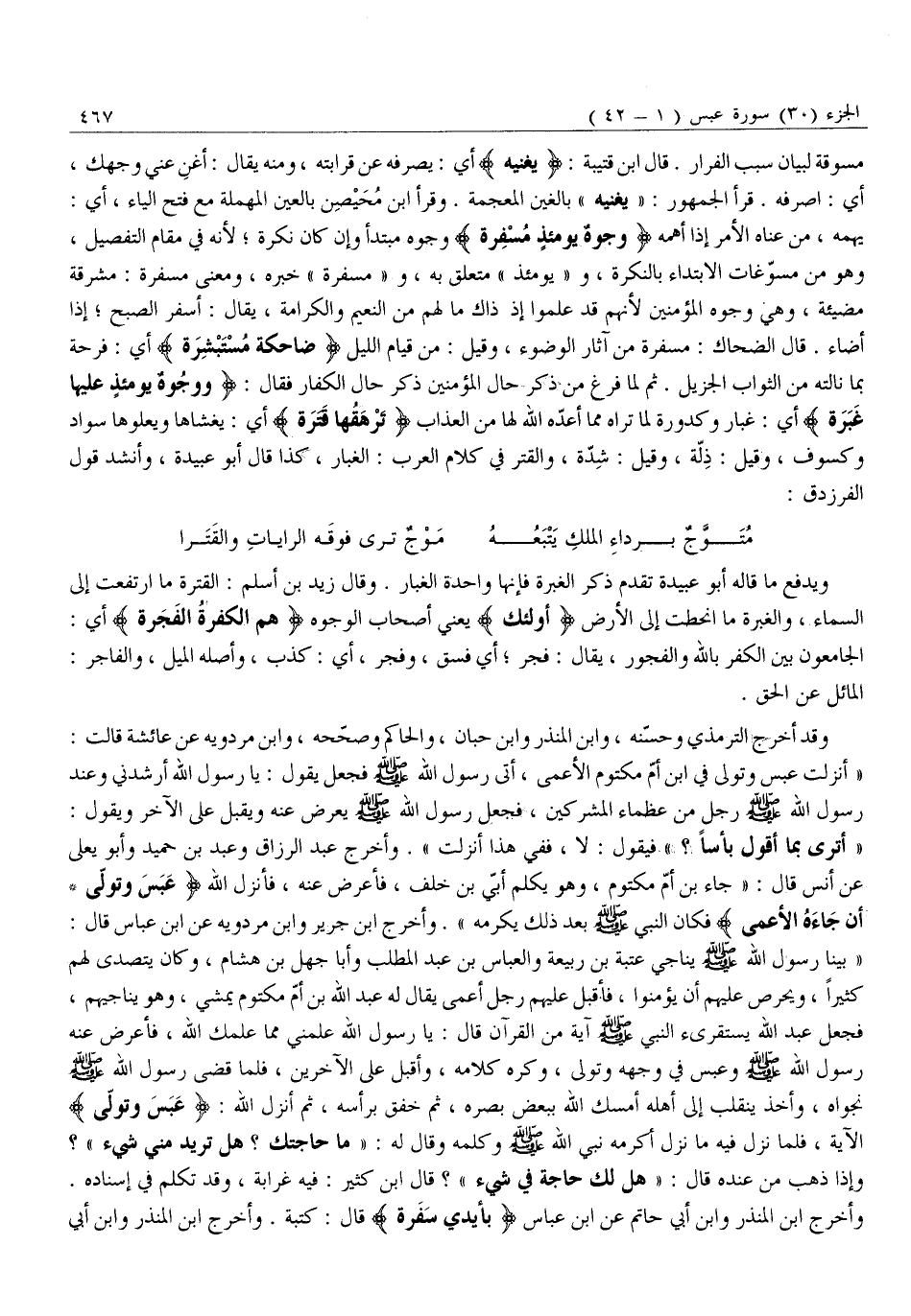 «أُنْزِلَتْ عَبَسَ وَتَوَلَّى فِي ابْنِ أُمِّ مَكْتُومٍ الْأَعْمَى، أَتَى رَسُولَ اللَّهِ صَلَّى اللَّهُ عَلَيْهِ وَسَلَّمَ فَجَعَلَ يَقُولُ: يَا رَسُولَ اللَّهِ أَرْشِدْنِي وَعِنْدَ رَسُولِ اللَّهِ صَلَّى اللَّهُ عَلَيْهِ وَسَلَّمَ رَجُلٌ مِنْ عُظَمَاءِ الْمُشْرِكِينَ، فَجَعَلَ رَسُولُ اللَّهِ صَلَّى اللَّهُ عَلَيْهِ وَسَلَّمَ يُعْرِضُ عَنْهُ وَيُقْبِلُ عَلَى الْآخَرِ وَيَقُولُ: