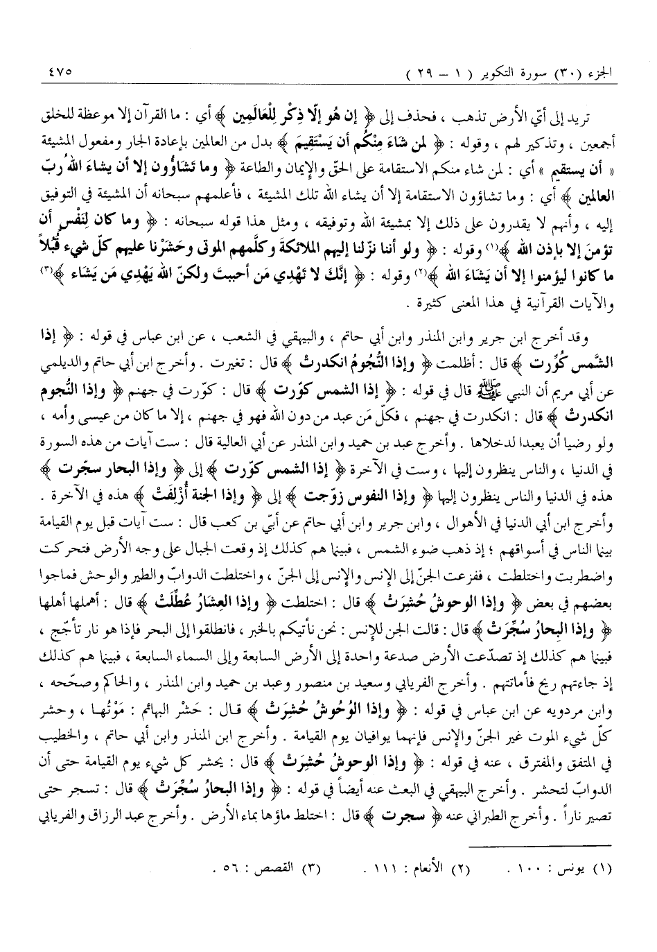 وَقَدْ أَخْرَجَ ابْنُ جَرِيرٍ وَابْنُ الْمُنْذِرِ وَابْنُ أَبِي حَاتِمٍ، وَالْبَيْهَقِيُّ فِي الشُّعَبِ، عَنِ ابْنِ عَبَّاسٍ فِي قَوْلِهِ: إِذَا الشَّمْسُ كُوِّرَتْ قَالَ: أَظْلَمَتْ وَإِذَا النُّجُومُ انْكَدَرَتْ قَالَ: تَغَيَّرَتْ. وَأَخْرَجَ ابْنُ أَبِي حَاتِمٍ وَالدَّيْلَمِيُّ عَنْ أَبِي مَرْيَمَ أَنَّ النَّبِيَّ صَلَّى اللَّهُ عَلَيْهِ وَسَلَّمَ قَالَ فِي قَوْلِهِ: إِذَا الشَّمْسُ كُوِّرَتْ قَالَ: كُوِّرَتْ فِي جَهَنَّمَ وَإِذَا النُّجُومُ انْكَدَرَتْ قَالَ: انْكَدَرَتْ فِي جَهَنَّمَ، فَكُلُّ مَنْ عُبِدَ مَنْ دُونِ اللَّهِ فَهُوَ فِي جَهَنَّمَ، إِلَّا مَا كَانَ مِنْ عِيسَى وَأُمِّهِ، وَلَوْ رَضِيَا أَنْ يُعْبَدَا لَدَخَلَاهَا. وَأَخْرَجَ عَبْدُ بْنُ حُمَيْدٍ وَابْنُ الْمُنْذِرِ عَنْ أَبِي الْعَالِيَةِ قَالَ: سِتُّ آيَاتٍ مِنْ هَذِهِ السُّورَةِ فِي الدُّنْيَا، وَالنَّاسُ يَنْظُرُونَ إِلَيْهَا، وَسِتٌّ فِي الْآخِرَةِ إِذَا الشَّمْسُ كُوِّرَتْ إِلَى وَإِذَا الْبِحارُ سُجِّرَتْ هَذِهِ فِي الدُّنْيَا وَالنَّاسُ يَنْظُرُونَ إِلَيْهَا وَإِذَا النُّفُوسُ زُوِّجَتْ إِلَى وَإِذَا الْجَنَّةُ أُزْلِفَتْ هَذِهِ فِي الْآخِرَةِ.