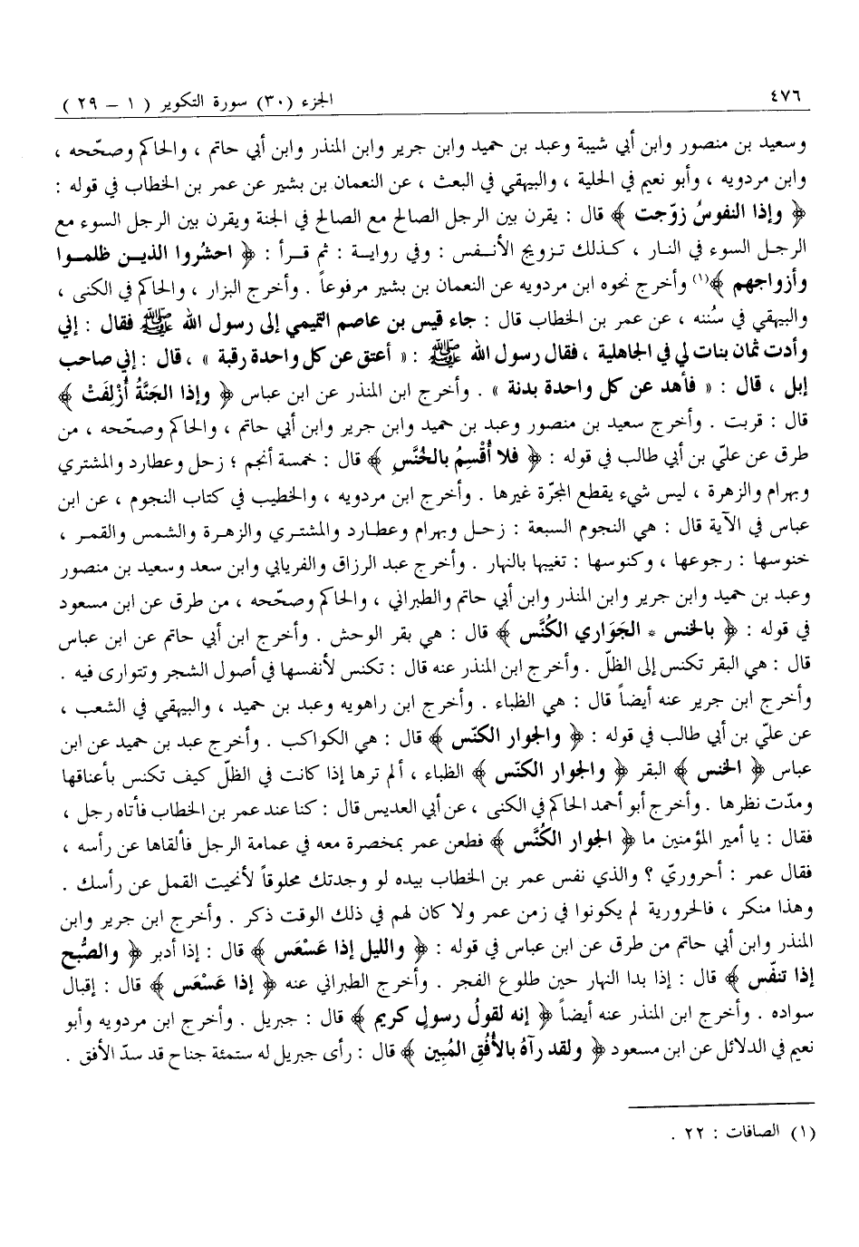 وَهَذَا مُنْكَرٌ، فَالْحَرُورِيَّةُ لَمْ يَكُونُوا فِي زَمَنِ عُمَرَ وَلَا كَانَ لَهُمْ فِي ذَلِكَ الْوَقْتِ ذِكْرٌ. وَأَخْرَجَ ابْنُ جَرِيرٍ وَابْنُ الْمُنْذِرِ وَابْنُ أَبِي حَاتِمٍ مِنْ طُرُقٍ عَنِ ابْنِ عَبَّاسٍ فِي قَوْلِهِ: وَاللَّيْلِ إِذا عَسْعَسَ قَالَ: إِذَا أَدْبَرَ وَالصُّبْحِ إِذا تَنَفَّسَ قَالَ: إِذَا بَدَا النَّهَارُ حِينَ طُلُوعِ الْفَجْرِ. وَأَخْرَجَ الطَّبَرَانِيُّ عَنْهُ إِذا عَسْعَسَ قَالَ: إِقْبَالُ سَوَادِهِ. وَأَخْرَجَ ابْنُ الْمُنْذِرِ عَنْهُ أَيْضًا إِنَّهُ لَقَوْلُ رَسُولٍ كَرِيمٍ قَالَ: جِبْرِيلُ. وَأَخْرَجَ ابْنُ مَرْدَوَيْهِ وَأَبُو نُعَيْمٍ فِي الدَّلَائِلِ عَنِ ابْنِ مَسْعُودٍ وَلَقَدْ رَآهُ بِالْأُفُقِ الْمُبِينِ قَالَ: رَأَى جِبْرِيلَ له ستّمائة جناح قد سدّ الأفق.