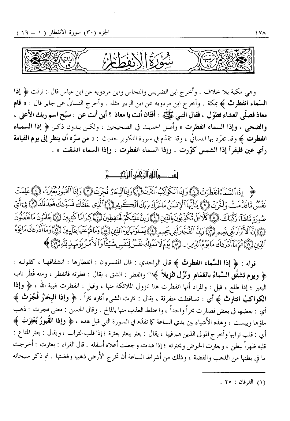 وَيَوْمَ تَشَقَّقُ السَّماءُ بِالْغَمامِ وَنُزِّلَ الْمَلائِكَةُ تَنْزِيلًا «1» وَالْفِطْرُ: الشِّقُّ، يُقَالُ: فَطَرْتُهُ فَانْفَطَرَ، وَمِنْهُ فَطَرَ نَابُ الْبَعِيرِ إِذَا طَلَعَ، قِيلَ: وَالْمُرَادُ أَنَّهَا انْفَطَرَتْ هُنَا لِنُزُولِ الْمَلَائِكَةِ مِنْهَا، وَقِيلَ: انْفَطَرَتْ لِهَيْبَةِ اللَّهِ، وَإِذَا الْكَواكِبُ انْتَثَرَتْ أَيْ: تَسَاقَطَتْ مُتَفَرِّقَةً، يُقَالُ: نَثَرْتُ الشَّيْءَ أَنْثُرُهُ نَثْرًا. وَإِذَا الْبِحارُ فُجِّرَتْ أي: بَعْضُهَا فِي بَعْضٍ فَصَارَتْ بَحْرًا وَاحِدًا، وَاخْتَلَطَ الْعَذْبُ مِنْهَا بِالْمَالِحِ. وَقَالَ الْحَسَنُ: مَعْنَى فُجِّرَتْ: ذَهَبَ مَاؤُهَا وَيَبِسَتْ، وَهَذِهِ الْأَشْيَاءُ بَيْنَ يَدَيِ السَّاعَةِ كَمَا تَقَدَّمَ فِي السُّورَةِ الَّتِي قَبْلَ هَذِهِ، وَإِذَا الْقُبُورُ بُعْثِرَتْ أَيْ: قُلِبَ تُرَابُهَا وَأُخْرِجَ الْمَوْتَى الَّذِينَ هُمْ فِيهَا، يُقَالُ: بَعْثَرَ يُبَعْثِرُ بَعْثَرَةً إِذَا قَلَبَ التُّرَابَ، وَيُقَالُ: بَعْثَرَ الْمَتَاعَ: