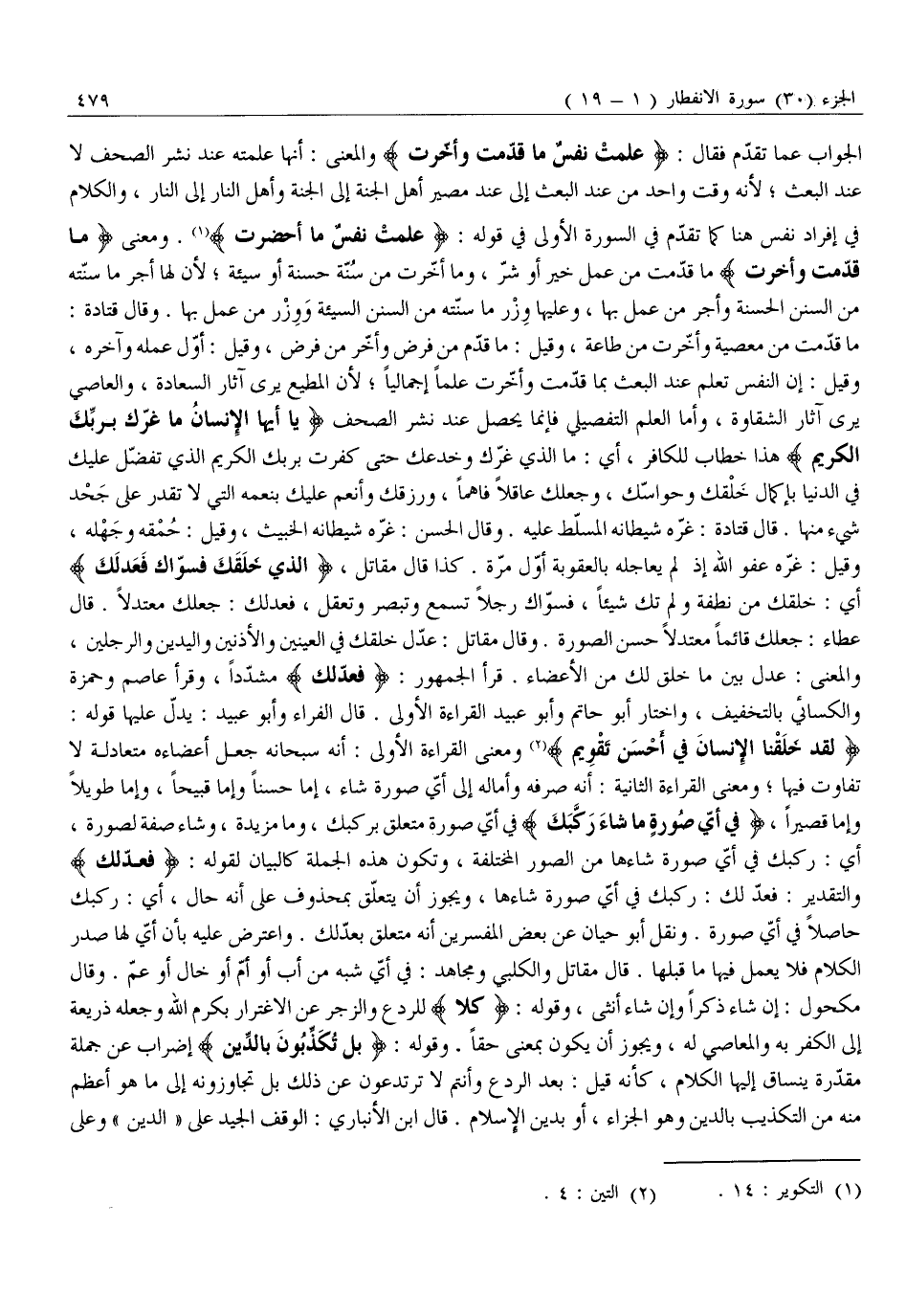 مَا قَدَّمَتْ مِنْ مَعْصِيَةٍ وَأَخَّرَتْ مِنْ طَاعَةٍ، وَقِيلَ: مَا قَدَّمَ مِنْ فَرْضٍ وَأَخَّرَ مِنْ فَرْضٍ، وَقِيلَ: أَوَّلُ عَمَلِهِ وَآخِرُهُ، وَقِيلَ: إِنَّ النَّفْسَ تَعْلَمُ عِنْدَ الْبَعْثِ بِمَا قَدَّمَتْ وَأَخَّرَتْ عِلْمًا إِجْمَالِيًّا لِأَنَّ الْمُطِيعَ يَرَى آثَارَ السَّعَادَةِ، وَالْعَاصِيَ يَرَى آثَارَ الشَّقَاوَةِ، وَأَمَّا الْعِلْمُ التَّفْصِيلِيُّ فَإِنَّمَا يَحْصُلُ عِنْدَ نَشْرِ الصُّحُفِ يَا أَيُّهَا الْإِنْسانُ مَا غَرَّكَ بِرَبِّكَ الْكَرِيمِ هَذَا خطاب للكافر، أَيْ: مَا الَّذِي غَرَّكَ وَخَدَعَكَ حَتَّى كَفَرْتَ بِرَبِّكَ الْكَرِيمِ الَّذِي تَفَضَّلَ عَلَيْكَ فِي الدُّنْيَا بِإِكْمَالِ خَلْقِكَ وَحَوَاسِّكَ، وَجَعْلِكَ عَاقِلًا فَاهِمًا، وَرَزَقَكَ وَأَنْعَمَ عَلَيْكَ بِنِعَمِهِ الَّتِي لَا تَقْدِرُ عَلَى جَحْدِ شَيْءٍ مِنْهَا. قَالَ قَتَادَةُ: غَرَّهُ شَيْطَانُهُ الْمُسَلَّطُ عَلَيْهِ. وَقَالَ الْحَسَنُ: غَرَّهُ شَيْطَانُهُ الْخَبِيثُ، وَقِيلَ: حُمْقُهُ وَجَهْلُهُ، وَقِيلَ: غَرَّهُ عَفْوُ اللَّهِ إِذْ لَمْ يُعَاجِلْهُ بِالْعُقُوبَةِ أَوَّلَ مَرَّةٍ. كَذَا قَالَ مُقَاتِلٌ، الَّذِي خَلَقَكَ فَسَوَّاكَ فَعَدَلَكَ أَيْ: خَلَقَكَ مِنْ نُطْفَةٍ وَلَمْ تَكُ شَيْئًا، فَسَوَّاكَ رَجُلًا تَسْمَعُ وَتُبْصِرُ وَتَعْقِلُ، فَعَدْلَكَ: جَعَلَكَ مُعْتَدِلًا. قَالَ عَطَاءٌ: جَعَلَكَ قَائِمًا مُعْتَدِلًا حَسَنَ الصُّورَةِ. وَقَالَ مُقَاتِلٌ: عَدَّلَ خَلْقَكَ فِي الْعَيْنَيْنِ وَالْأُذُنَيْنِ وَالْيَدَيْنِ وَالرِّجْلَيْنِ، وَالْمَعْنَى: عَدَلَ بَيْنَ مَا خَلَقَ لَكَ مِنَ الْأَعْضَاءِ. قَرَأَ الْجُمْهُورُ: فَعَدَلَكَ مُشَدَّدًا، وَقَرَأَ عَاصِمٌ وَحَمْزَةُ وَالْكِسَائِيُّ بِالتَّخْفِيفِ، وَاخْتَارَ أَبُو حَاتِمٍ وَأَبُو عُبَيْدٍ الْقِرَاءَةَ الْأُولَى. قَالَ الْفَرَّاءُ وَأَبُو عُبَيْدٍ: يَدُلُّ عَلَيْهَا قَوْلُهُ: