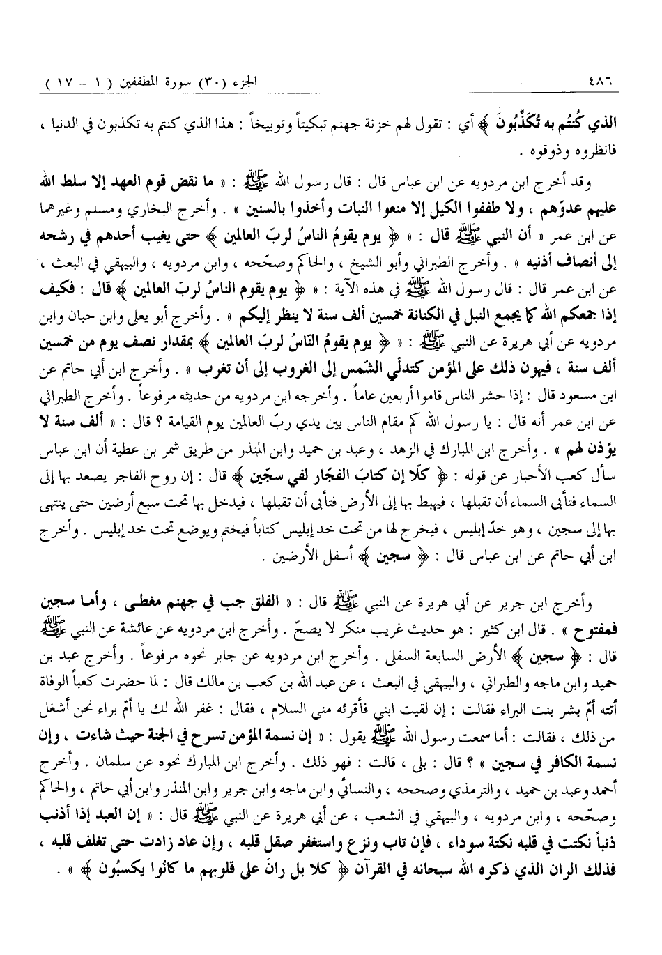 وَقَدْ أَخْرَجَ ابْنُ مَرْدَوَيْهِ عَنِ ابْنِ عَبَّاسٍ قَالَ: قَالَ رَسُولُ اللَّهِ صَلَّى اللَّهُ عَلَيْهِ وَسَلَّمَ: «مَا نَقَضَ قَوْمٌ الْعَهْدَ إِلَّا سَلَّطَ اللَّهُ عَلَيْهِمْ عَدُوَّهُمْ، وَلَا طَفَّفُوا الْكَيْلَ إِلَّا مُنِعُوا النَّبَاتَ وَأُخِذُوا بِالسِّنِينَ» . وَأَخْرَجَ الْبُخَارِيُّ وَمُسْلِمٌ وَغَيْرُهُمَا عَنِ ابْنِ عُمَرَ «أَنَّ النَّبِيَّ صَلَّى اللَّهُ عَلَيْهِ وَسَلَّمَ قَالَ: «يَوْمَ يَقُومُ النَّاسُ لِرَبِّ الْعالَمِينَ حَتَّى يَغِيبَ أَحَدُهُمْ فِي رَشْحِهِ إِلَى أَنْصَافِ أُذُنَيْهِ» . وَأَخْرَجَ الطَّبَرَانِيُّ وَأَبُو الشَّيْخِ، وَالْحَاكِمُ وَصَحَّحَهُ، وَابْنُ مَرْدَوَيْهِ، وَالْبَيْهَقِيُّ فِي الْبَعْثِ، عَنِ ابْنِ عُمَرَ قَالَ: قَالَ رَسُولُ اللَّهِ صلى الله عليه وسلم في هَذِهِ الْآيَةِ: «يَوْمَ يَقُومُ النَّاسُ لِرَبِّ الْعالَمِينَ قَالَ: فَكَيْفَ إِذَا جَمَعَكُمُ اللَّهُ كَمَا يُجْمَعُ النَّبْلُ فِي الْكِنَانَةِ خَمْسِينَ أَلْفَ سَنَةٍ لَا يَنْظُرُ إِلَيْكُمْ» . وَأَخْرَجَ أَبُو يَعْلَى وَابْنُ حِبَّانَ وَابْنُ مَرْدَوَيْهِ عَنْ أَبِي هُرَيْرَةَ عَنِ النَّبِيِّ صَلَّى اللَّهُ عَلَيْهِ وَسَلَّمَ: «يَوْمَ يَقُومُ النَّاسُ لِرَبِّ الْعالَمِينَ بِمِقْدَارِ نِصْفِ يَوْمٍ مِنْ خَمْسِينَ أَلْفَ سَنَةٍ، فَيُهَوَّنُ ذَلِكَ عَلَى الْمُؤْمِنِ كَتَدَلِّي الشَّمْسِ إِلَى الْغُرُوبِ إِلَى أَنْ تَغْرُبَ» . وَأَخْرَجَ ابْنُ أَبِي حَاتِمٍ عَنِ ابْنِ مَسْعُودٍ قَالَ: إِذَا حُشِرَ النَّاسُ قَامُوا أَرْبَعِينَ عَامًا. وَأَخْرَجَهُ ابْنُ مَرْدَوَيْهِ مِنْ حَدِيثِهِ مَرْفُوعًا. وَأَخْرَجَ الطَّبَرَانِيُّ عَنِ ابْنِ عُمَرَ أَنَّهُ قَالَ: يَا رَسُولَ اللَّهِ كَمْ مَقَامُ النَّاسِ بَيْنَ يَدَيْ رَبِّ الْعَالَمِينَ يَوْمَ الْقِيَامَةِ؟ قَالَ: «أَلْفُ سَنَةٍ لَا يُؤْذَنُ لَهُمْ» . وَأَخْرَجَ ابْنُ الْمُبَارَكِ فِي الزُّهْدِ، وَعَبْدُ بْنُ حُمَيْدٍ وَابْنُ الْمُنْذِرِ مِنْ طَرِيقِ شِمْرِ بْنِ عَطِيَّةَ أَنَّ ابْنَ عَبَّاسٍ سَأَلَ كَعْبَ الْأَحْبَارِ عَنْ قَوْلِهِ: كَلَّا إِنَّ كِتابَ الفُجَّارِ لَفِي سِجِّينٍ قَالَ: إِنَّ رُوحَ الْفَاجِرِ يُصْعَدُ بِهَا إِلَى السَّمَاءِ فَتَأْبَى السَّمَاءُ أَنْ تَقْبَلَهَا، فَيُهْبَطُ بِهَا إِلَى الْأَرْضِ فَتَأْبَى أَنْ تَقْبَلَهَا، فَيُدْخَلُ بِهَا تَحْتَ سَبْعِ أَرَضِينَ حَتَّى يُنْتَهِيَ بِهَا إِلَى سِجِّينٍ، وَهُوَ خَدُّ إِبْلِيسَ، فَيُخْرَجُ لَهَا مِنْ تَحْتِ خَدِّ إِبْلِيسَ كِتَابًا فيختم ويوضع تحت خد إِبْلِيسَ. وَأَخْرَجَ ابْنُ أَبِي حَاتِمٍ عَنِ ابْنِ عَبَّاسٍ قَالَ: سِجِّينٍ أَسْفَلَ الْأَرَضِينَ.