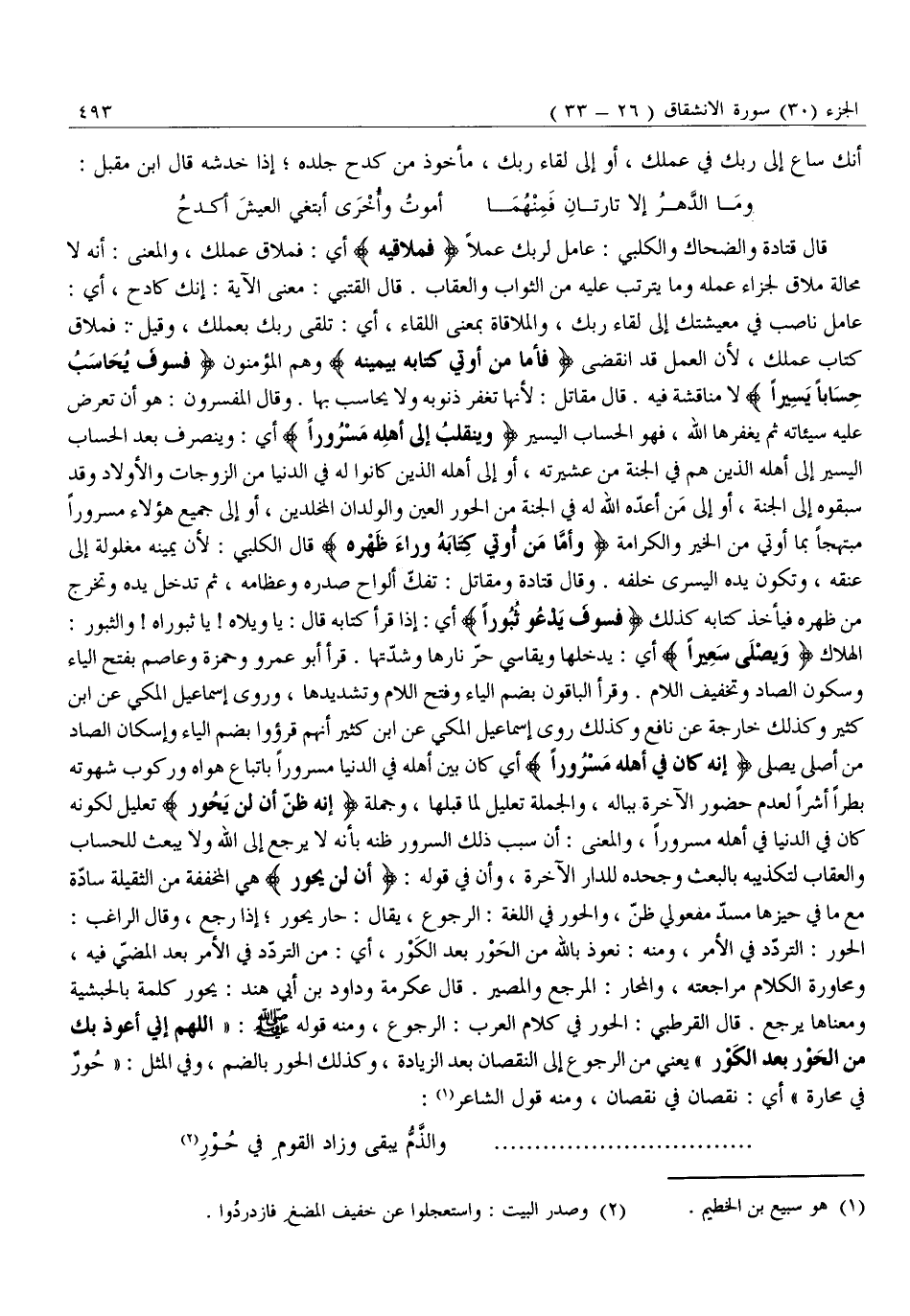 الْهَلَاكُ وَيَصْلى سَعِيراً أَيْ: يَدْخُلُهَا وَيُقَاسِي حَرَّ نَارِهَا وَشِدَّتَهَا. قَرَأَ أَبُو عَمْرٍو وَحَمْزَةُ وَعَاصِمٌ بِفَتْحِ الْيَاءِ وَسُكُونِ الصَّادِ وَتَخْفِيفِ اللَّامِ. وَقَرَأَ الْبَاقُونَ بِضَمِّ الْيَاءِ وَفَتْحِ اللَّامِ وَتَشْدِيدِهَا، وَرَوَى إِسْمَاعِيلُ الْمَكِّيُّ عَنِ ابْنِ كَثِيرٍ وَكَذَلِكَ خَارِجَةُ عَنْ نَافِعٍ وَكَذَلِكَ رَوَى إِسْمَاعِيلُ الْمَكِّيُّ عَنِ ابْنِ كَثِيرٍ أَنَّهُمْ قرءوا بِضَمِّ الْيَاءِ وَإِسْكَانِ الصَّادِ مِنْ أَصْلَى يُصْلِي إِنَّهُ كانَ فِي أَهْلِهِ مَسْرُوراً أَيْ كَانَ بَيْنَ أَهْلِهِ فِي الدُّنْيَا مَسْرُورًا بِاتِّبَاعِ هَوَاهُ وركوب شهوته بطرا أشرا لعدم حضور الْآخِرَةِ بِبَالِهِ، وَالْجُمْلَةُ تَعْلِيلٌ لِمَا قَبْلَهَا، وَجُمْلَةُ إِنَّهُ ظَنَّ أَنْ لَنْ يَحُورَ تَعْلِيلٌ لِكَوْنِهِ كَانَ فِي الدُّنْيَا فِي أَهْلِهِ مَسْرُورًا، وَالْمَعْنَى: أَنَّ سَبَبَ ذَلِكَ السُّرُورِ ظَنُّهُ بِأَنَّهُ لَا يَرْجِعُ إِلَى اللَّهِ وَلَا يُبْعَثُ لِلْحِسَابِ وَالْعِقَابِ لِتَكْذِيبِهِ بِالْبَعْثِ وَجَحْدِهِ لِلدَّارِ الْآخِرَةِ، وَأَنْ فِي قَوْلِهِ: أَنْ لَنْ يَحُورَ هِيَ الْمُخَفَّفَةُ مِنَ الثَّقِيلَةِ سَادَّةٌ مَعَ مَا فِي حَيِّزِهَا مَسَدَّ مَفْعُولَيْ ظَنَّ، وَالْحَوْرُ فِي اللُّغَةِ: الرُّجُوعُ، يُقَالُ: حَارَ يَحُورُ إِذَا رَجَعَ، وَقَالَ الرَّاغِبُ: