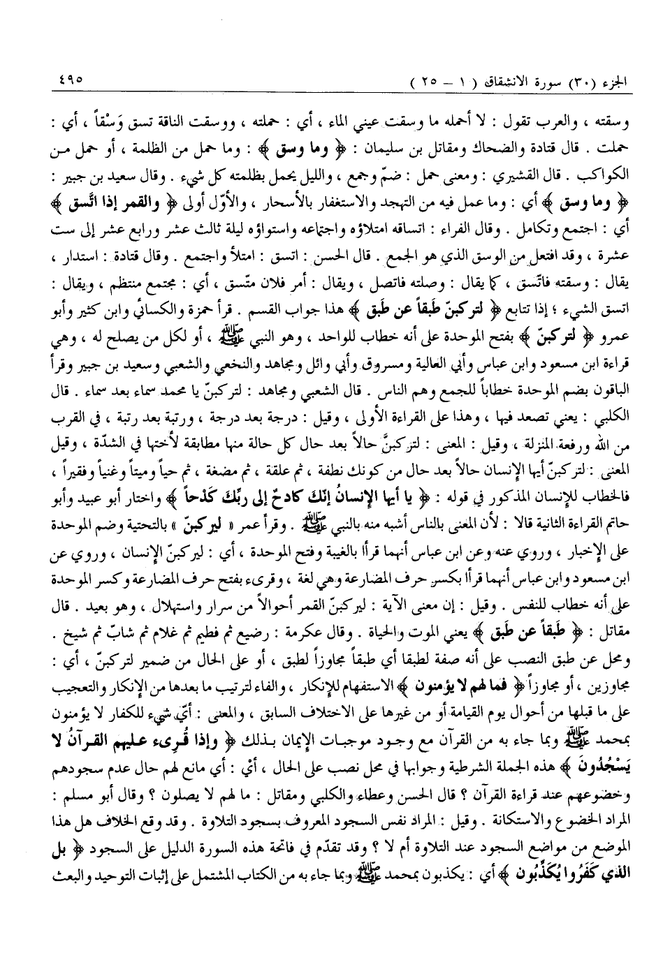 اتَّسَقَ الشَّيْءُ إِذَا تَتَابَعَ لَتَرْكَبُنَّ طَبَقاً عَنْ طَبَقٍ هَذَا جَوَابُ الْقَسَمِ. قَرَأَ حَمْزَةُ وَالْكِسَائِيُّ وَابْنُ كَثِيرٍ وَأَبُو عَمْرٍو لَتَرْكَبُنَّ بِفَتْحِ الْمُوَحَّدَةِ عَلَى أَنَّهُ خِطَابٌ لِلْوَاحِدِ، وَهُوَ النَّبِيُّ صَلَّى اللَّهُ عَلَيْهِ وَسَلَّمَ، أَوْ لِكُلِّ مَنْ يَصْلُحُ لَهُ، وَهِيَ قِرَاءَةُ ابْنِ مَسْعُودٍ وَابْنِ عَبَّاسٍ وَأَبِي الْعَالِيَةِ وَمَسْرُوقٍ وَأَبِي وَائِلٍ وَمُجَاهِدٍ وَالنَّخَعِيِّ وَالشَّعْبِيِّ وَسَعِيدِ بْنِ جُبَيْرٍ وَقَرَأَ الْبَاقُونَ بِضَمِّ الْمُوَحَّدَةِ خِطَابًا لِلْجَمْعِ وَهُمُ النَّاسُ. قَالَ الشَّعْبِيُّ وَمُجَاهِدٌ: لَتَرْكَبَنَّ يَا مُحَمَّدُ سَمَاءً بَعْدَ سَمَاءٍ. قَالَ الْكَلْبِيُّ: يَعْنِي تَصْعَدُ فِيهَا، وَهَذَا عَلَى الْقِرَاءَةِ الْأُولَى، وَقِيلَ: دَرَجَةً بَعْدَ دَرَجَةٍ، وَرُتْبَةً بَعْدَ رُتْبَةٍ، فِي الْقُرْبِ مِنَ اللَّهِ وَرِفْعَةِ الْمَنْزِلَةِ، وَقِيلَ: الْمَعْنَى: لَتَرْكَبَنَّ حَالًا بَعْدَ حَالٍ كُلُّ حَالَةٍ مِنْهَا مُطَابِقَةٌ لِأُخْتِهَا فِي الشِّدَّةِ، وَقِيلَ الْمَعْنَى: لَتَرْكَبَنَّ أَيُّهَا الْإِنْسَانُ حَالًا بَعْدَ حَالٍ مِنْ كَوْنِكَ نُطْفَةً، ثُمَّ عَلَقَةً، ثُمَّ مُضْغَةً، ثُمَّ حَيًّا وَمَيِّتًا وَغَنِيًّا وَفَقِيرًا، فالخطاب للإنسان المذكور في قوله: يَا أَيُّهَا الْإِنْسانُ إِنَّكَ كادِحٌ إِلى رَبِّكَ كَدْحاً وَاخْتَارَ أَبُو عُبَيْدٍ وَأَبُو حَاتِمٍ الْقِرَاءَةَ الثَّانِيَةَ قَالَا: لِأَنَّ الْمَعْنَى بِالنَّاسِ أَشْبَهُ مِنْهُ بِالنَّبِيِّ صَلَّى اللَّهُ عَلَيْهِ وَسَلَّمَ. وَقَرَأَ عُمَرُ «لَيَرْكَبُنَّ» بِالتَّحْتِيَّةِ وَضَمِّ الْمُوَحَّدَةِ عَلَى الْإِخْبَارِ، وَرُوِيَ عَنْهُ وَعَنِ ابْنِ عَبَّاسٍ أَنَّهُمَا قَرَآ بِالْغَيْبَةِ وَفَتْحِ الْمُوَحَّدَةِ، أَيْ: لَيَرْكَبَنَّ الْإِنْسَانُ، وَرُوِيَ عن ابن مسعود وابن عباس أنهما قَرَآ بِكَسْرِ حَرْفِ الْمُضَارَعَةِ وَهِيَ لُغَةٌ، وَقُرِئَ بِفَتْحِ حَرْفِ الْمُضَارَعَةِ وَكَسْرِ الْمُوَحَّدَةِ عَلَى أَنَّهُ خِطَابٌ لِلنَّفْسِ. وَقِيلَ: إِنَّ مَعْنَى الْآيَةِ: لَيَرْكَبَنَّ الْقَمَرُ أَحْوَالًا مِنْ سِرَارٍ وَاسْتِهْلَالٍ، وَهُوَ بَعِيدٌ. قَالَ مُقَاتِلٌ: طَبَقاً عَنْ طَبَقٍ يَعْنِي الْمَوْتَ وَالْحَيَاةَ. وَقَالَ عِكْرِمَةُ: رَضِيعٌ ثُمَّ فَطِيمٌ ثُمَّ غُلَامٌ ثُمَّ شَابٌّ ثُمَّ شَيْخٌ.