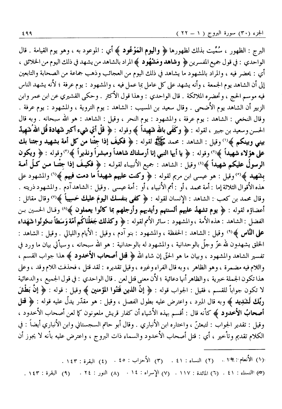 الْبُرْجِ: الظُّهُورُ، سُمِّيَتْ بِذَلِكَ لِظُهُورِهَا وَالْيَوْمِ الْمَوْعُودِ أَيِ: الْمَوْعُودِ بِهِ، وَهُوَ يَوْمُ الْقِيَامَةِ. قَالَ الْوَاحِدِيُّ: فِي قَوْلِ جَمِيعِ الْمُفَسِّرِينَ وَشاهِدٍ وَمَشْهُودٍ الْمُرَادُ بِالشَّاهِدِ مَنْ يَشْهَدُ فِي ذَلِكَ الْيَوْمِ مِنَ الْخَلَائِقِ، أَيْ: يَحْضُرُ فِيهِ، وَالْمُرَادُ بِالْمَشْهُودِ مَا يُشَاهَدُ فِي ذَلِكَ الْيَوْمِ مِنَ الْعَجَائِبِ وَذَهَبَ جَمَاعَةٌ مِنَ الصَّحَابَةِ وَالتَّابِعِينَ إِلَى أَنَّ الشَّاهِدَ يَوْمُ الْجُمُعَةِ، وَأَنَّهُ يَشْهَدُ عَلَى كُلِّ عَامِلٍ بِمَا عَمِلَ فِيهِ، وَالْمَشْهُودُ: يَوْمُ عَرَفَةَ لِأَنَّهُ يَشْهَدُ النَّاسُ فِيهِ مَوْسِمَ الْحَجِّ، وَتَحْضُرُهُ الْمَلَائِكَةُ. قَالَ الْوَاحِدِيُّ: وَهَذَا قَوْلُ الْأَكْثَرِ. وَحَكَى الْقُشَيْرِيُّ عَنِ ابْنِ عُمَرَ وَابْنِ الزُّبَيْرِ أَنَّ الشَّاهِدَ يَوْمُ الْأَضْحَى. وَقَالَ سَعِيدُ بْنُ الْمُسَيَّبِ: الشَّاهِدُ: يَوْمُ التَّرْوِيَةِ، وَالْمَشْهُودُ: يَوْمُ عَرَفَةَ.