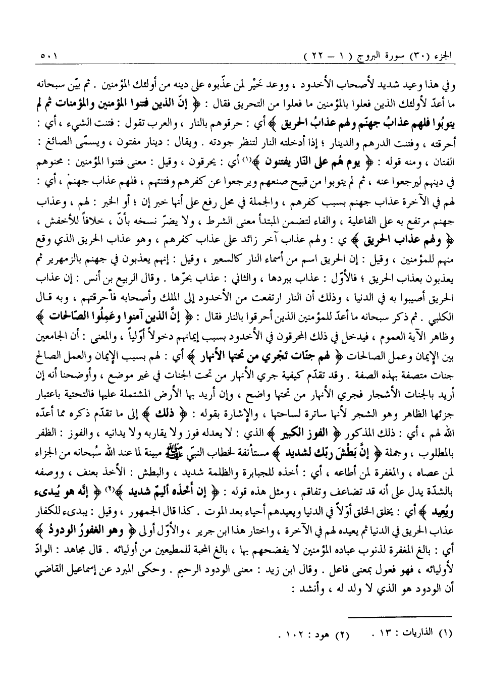 وَفِي هَذَا وَعِيدٌ شَدِيدٌ لِأَصْحَابِ الْأُخْدُودِ، وَوَعْدُ خَيْرٍ لِمَنْ عَذَّبُوهُ عَلَى دِينِهِ مِنْ أُولَئِكَ الْمُؤْمِنِينَ. ثُمَّ بَيَّنَ سُبْحَانَهُ مَا أَعَدَّ لِأُولَئِكَ الَّذِينَ فَعَلُوا بِالْمُؤْمِنِينَ مَا فَعَلُوا مِنَ التَّحْرِيقِ فَقَالَ: إِنَّ الَّذِينَ فَتَنُوا الْمُؤْمِنِينَ وَالْمُؤْمِناتِ ثُمَّ لَمْ يَتُوبُوا فَلَهُمْ عَذابُ جَهَنَّمَ وَلَهُمْ عَذابُ الْحَرِيقِ أَيْ: حَرَقُوهُمْ بِالنَّارِ، وَالْعَرَبُ تَقُولُ: فَتَنْتُ الشَّيْءَ، أَيْ: