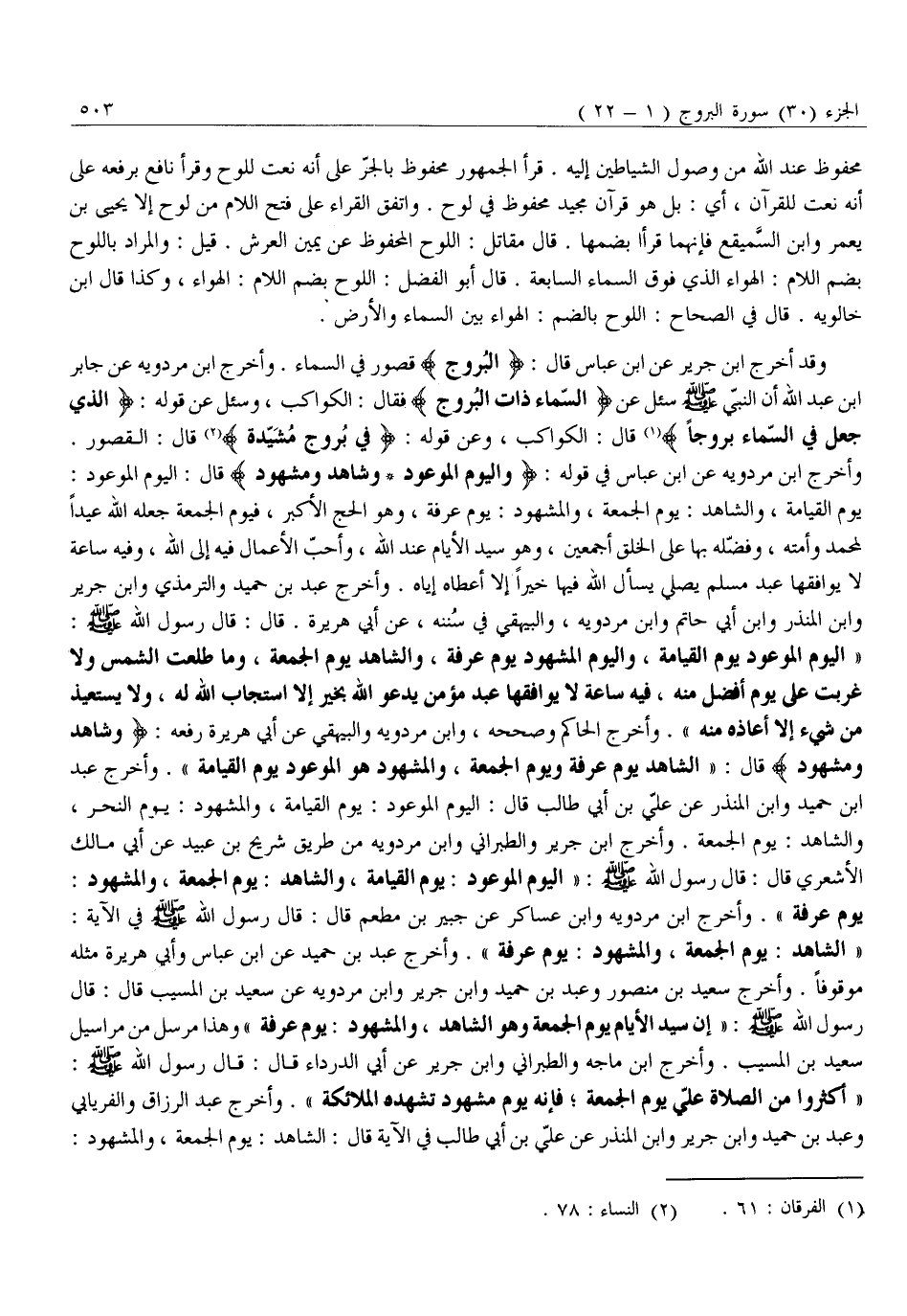 «أَكْثِرُوا مِنَ الصَّلَاةِ عَلَيَّ يَوْمَ الْجُمُعَةِ فَإِنَّهُ يَوْمٌ مَشْهُودٌ تَشْهَدُهُ الْمَلَائِكَةُ» . وَأَخْرَجَ عَبْدُ الرَّزَّاقِ وَالْفِرْيَابِيُّ وَعَبْدُ بْنُ حُمَيْدٍ وَابْنُ جَرِيرٍ وَابْنُ الْمُنْذِرِ عَنْ عَلِيِّ بْنِ أَبِي طَالِبٍ فِي الْآيَةِ قَالَ: الشاهد: يوم الجمعة، والمشهود: