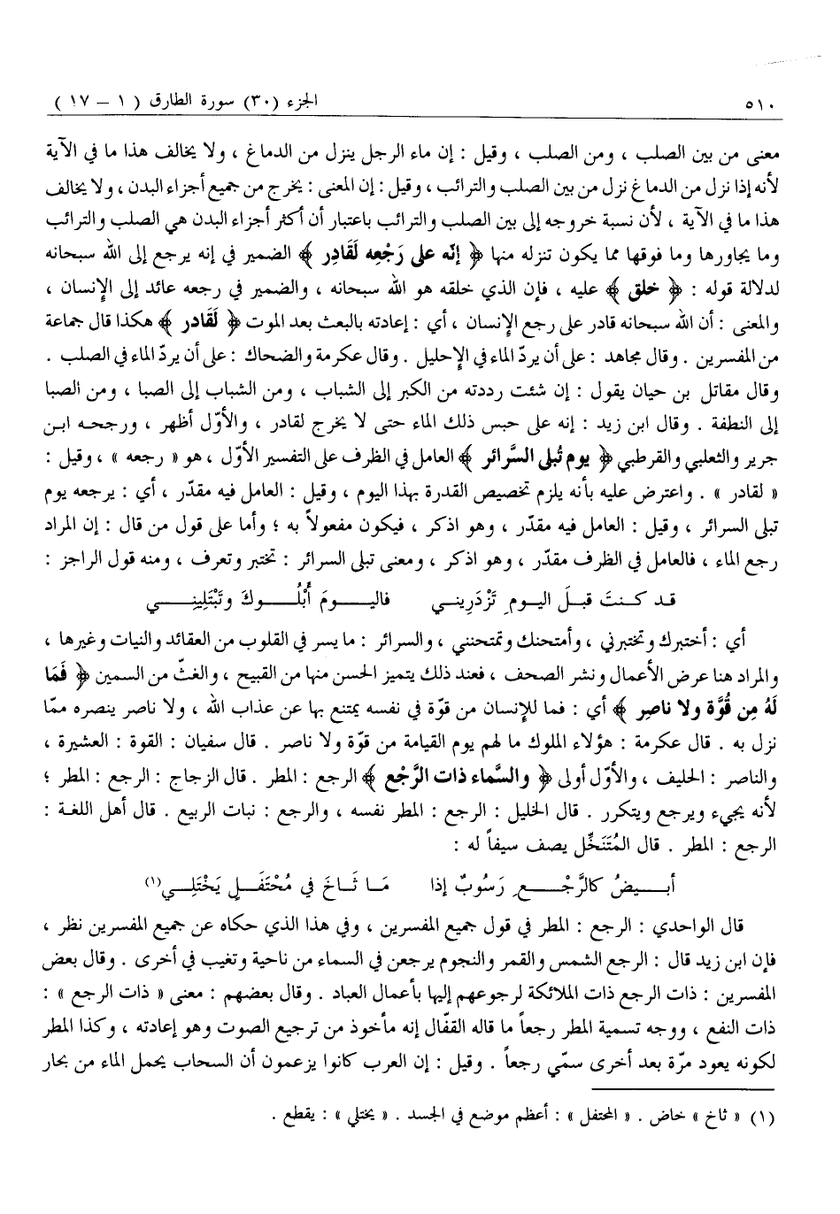 معنى من بين الصلب، ومن الصُّلْبِ، وَقِيلَ: إِنَّ مَاءَ الرَّجُلِ يَنْزِلُ مِنَ الدِّمَاغِ، وَلَا يُخَالِفُ هَذَا مَا فِي الْآيَةِ لِأَنَّهُ إِذَا نَزَلَ مِنَ الدِّمَاغِ نَزَلَ مِنْ بَيْنِ الصُّلْبِ وَالتَّرَائِبِ، وَقِيلَ: إِنَّ الْمَعْنَى: يَخْرُجُ مِنْ جَمِيعِ أَجْزَاءِ الْبَدَنِ، وَلَا يُخَالِفُ هَذَا مَا فِي الْآيَةِ، لِأَنَّ نِسْبَةَ خُرُوجِهِ إِلَى بَيْنِ الصُّلْبِ وَالتَّرَائِبِ بِاعْتِبَارِ أَنَّ أَكْثَرَ أَجْزَاءِ الْبَدَنِ هِيَ الصُّلْبُ وَالتَّرَائِبُ وَمَا يُجَاوِرُهَا وَمَا فَوْقَهَا مِمَّا يَكُونُ تَنَزُّلُهُ مِنْهَا إِنَّهُ عَلى رَجْعِهِ لَقادِرٌ الضَّمِيرُ فِي إِنَّهُ يَرْجِعُ إِلَى اللَّهِ سُبْحَانَهُ لِدَلَالَةِ قَوْلِهِ: خُلِقَ عَلَيْهِ، فَإِنَّ الَّذِي خَلَقَهُ هُوَ اللَّهُ سُبْحَانَهُ، وَالضَّمِيرُ فِي رَجْعِهِ عَائِدٌ إِلَى الْإِنْسَانِ، وَالْمَعْنَى: أَنَّ اللَّهَ سبحانه قادر على رجع الْإِنْسَانِ، أَيْ: إِعَادَتِهِ بِالْبَعْثِ بَعْدَ الْمَوْتِ لَقادِرٌ هَكَذَا قَالَ جَمَاعَةٌ مِنَ الْمُفَسِّرِينَ. وَقَالَ مُجَاهِدٌ: عَلَى أَنْ يَرُدَّ الْمَاءَ فِي الْإِحْلِيلِ. وَقَالَ عِكْرِمَةُ وَالضَّحَّاكُ: عَلَى أَنْ يَرُدَّ الْمَاءَ فِي الصُّلْبِ.