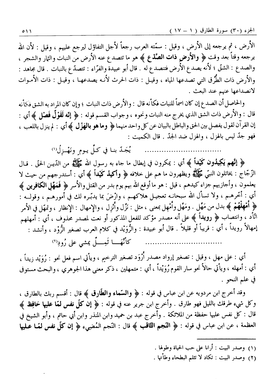 الْأَرْضِ، ثُمَّ يُرْجِعُهُ إِلَى الْأَرْضِ، وَقِيلَ: سَمَّتْهُ الْعَرَبُ رَجْعًا لِأَجْلِ التَّفَاؤُلِ لِيَرْجِعَ عَلَيْهِمْ، وَقِيلَ: لِأَنَّ اللَّهَ يُرْجِعُهُ وَقْتًا بَعْدَ وَقْتٍ وَالْأَرْضِ ذاتِ الصَّدْعِ هُوَ مَا تَتَصَدَّعُ عَنْهُ الْأَرْضُ مِنَ النَّبَاتِ وَالثِّمَارِ وَالشَّجَرِ، وَالصَّدْعُ: الشَّقُّ لِأَنَّهُ يُصَدِّعُ الْأَرْضَ فَتَنْصَدِعُ لَهُ. قَالَ أَبُو عُبَيْدَةَ وَالْفَرَّاءُ: تَتَصَدَّعُ بِالنَّبَاتِ. قَالَ مُجَاهِدٌ: