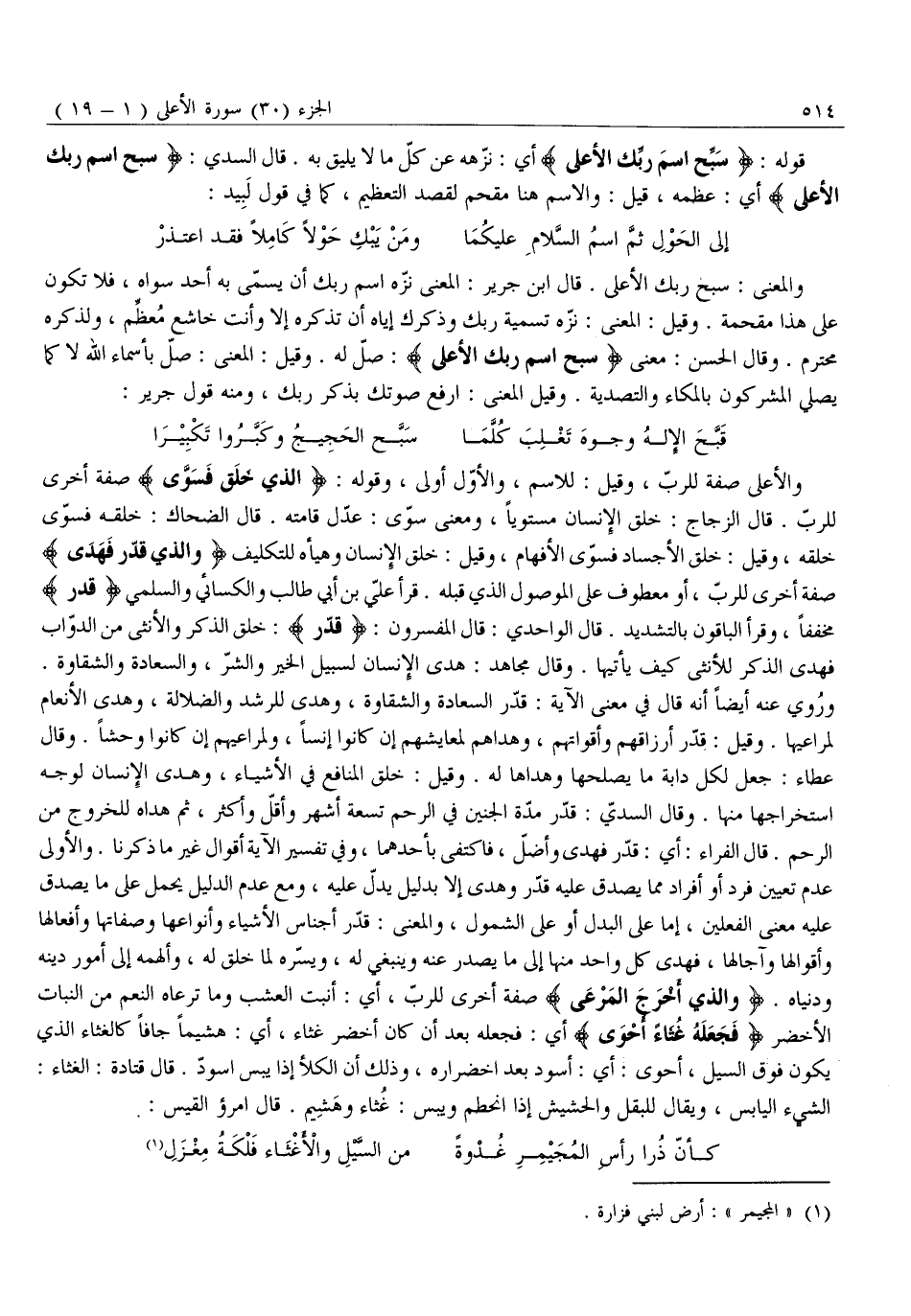 وَرُوِيَ عَنْهُ أَيْضًا أَنَّهُ قَالَ فِي مَعْنَى الْآيَةِ: قَدَّرَ السَّعَادَةَ وَالشَّقَاوَةَ، وَهَدَى لِلرُّشْدِ وَالضَّلَالَةِ، وَهَدَى الْأَنْعَامَ لِمَرَاعِيهَا. وَقِيلَ: قَدَّرَ أَرْزَاقَهُمْ وَأَقْوَاتَهُمْ، وَهَدَاهُمْ لِمَعَايِشِهِمْ إِنْ كَانُوا إِنْسًا، وَلِمَرَاعِيهِمْ إِنْ كَانُوا وَحْشًا. وَقَالَ عَطَاءٌ: جُعِلَ لِكُلِّ دَابَّةٍ مَا يُصْلِحُهَا وَهَدَاهَا لَهُ. وَقِيلَ: خَلَقَ الْمَنَافِعَ فِي الْأَشْيَاءِ، وَهَدَى الْإِنْسَانَ لِوَجْهِ اسْتِخْرَاجِهَا مِنْهَا. وَقَالَ السُّدِّيُّ: قَدَّرَ مُدَّةَ الْجَنِينِ فِي الرَّحِمِ تِسْعَةَ أَشْهُرٍ وَأَقَلَّ وَأَكْثَرَ، ثُمَّ هَدَاهُ لِلْخُرُوجِ مِنَ الرَّحِمِ. قَالَ الْفَرَّاءُ: أَيْ: قَدَّرَ فَهَدَى وَأَضَلَّ، فَاكْتُفِيَ بِأَحَدِهِمَا، وَفِي تَفْسِيرِ الْآيَةِ أَقْوَالٌ غَيْرُ مَا ذَكَرْنَا. وَالْأَوْلَى عَدَمُ تَعْيِينِ فَرْدٍ أَوْ أَفْرَادٍ مِمَّا يَصْدُقُ عَلَيْهِ قَدَّرَ وَهَدَى إِلَّا بِدَلِيلٍ يَدُلُّ عَلَيْهِ، وَمَعَ عَدَمِ الدَّلِيلِ يُحْمَلُ عَلَى مَا يَصْدُقُ عَلَيْهِ مَعْنَى الْفِعْلَيْنِ، إِمَّا عَلَى الْبَدَلِ أَوْ عَلَى الشُّمُولِ، وَالْمَعْنَى: قَدَّرَ أَجْنَاسَ الْأَشْيَاءِ وَأَنْوَاعَهَا وَصِفَاتِهَا وَأَفْعَالَهَا وَأَقْوَالَهَا وَآجَالَهَا، فَهَدَى كُلَّ وَاحِدٍ مِنْهَا إِلَى مَا يَصْدُرُ عَنْهُ وَيَنْبَغِي لَهُ، وَيَسَّرَهُ لِمَا خُلِقَ لَهُ، وَأَلْهَمَهُ إِلَى أُمُورِ دِينِهِ وَدُنْيَاهُ. وَالَّذِي أَخْرَجَ الْمَرْعى صِفَةٌ أُخْرَى لِلرَّبِّ، أَيْ: أَنْبَتَ الْعُشْبَ وَمَا تَرْعَاهُ النَّعَمُ مِنَ النَّبَاتِ الْأَخْضَرِ فَجَعَلَهُ غُثاءً أَحْوى أَيْ: فَجَعَلَهُ بَعْدَ أَنْ كَانَ أَخْضَرَ غُثَاءً، أَيْ: هَشِيمًا جَافًّا كَالْغُثَاءِ الَّذِي يَكُونُ فَوْقَ السَّيْلِ، أَحَوَى: أَيِ: أَسْوَدَ بَعْدَ اخْضِرَارِهِ، وَذَلِكَ أَنَّ الْكَلَأَ إِذَا يَبِسَ اسْوَدَّ. قَالَ قَتَادَةُ: الْغُثَاءُ: