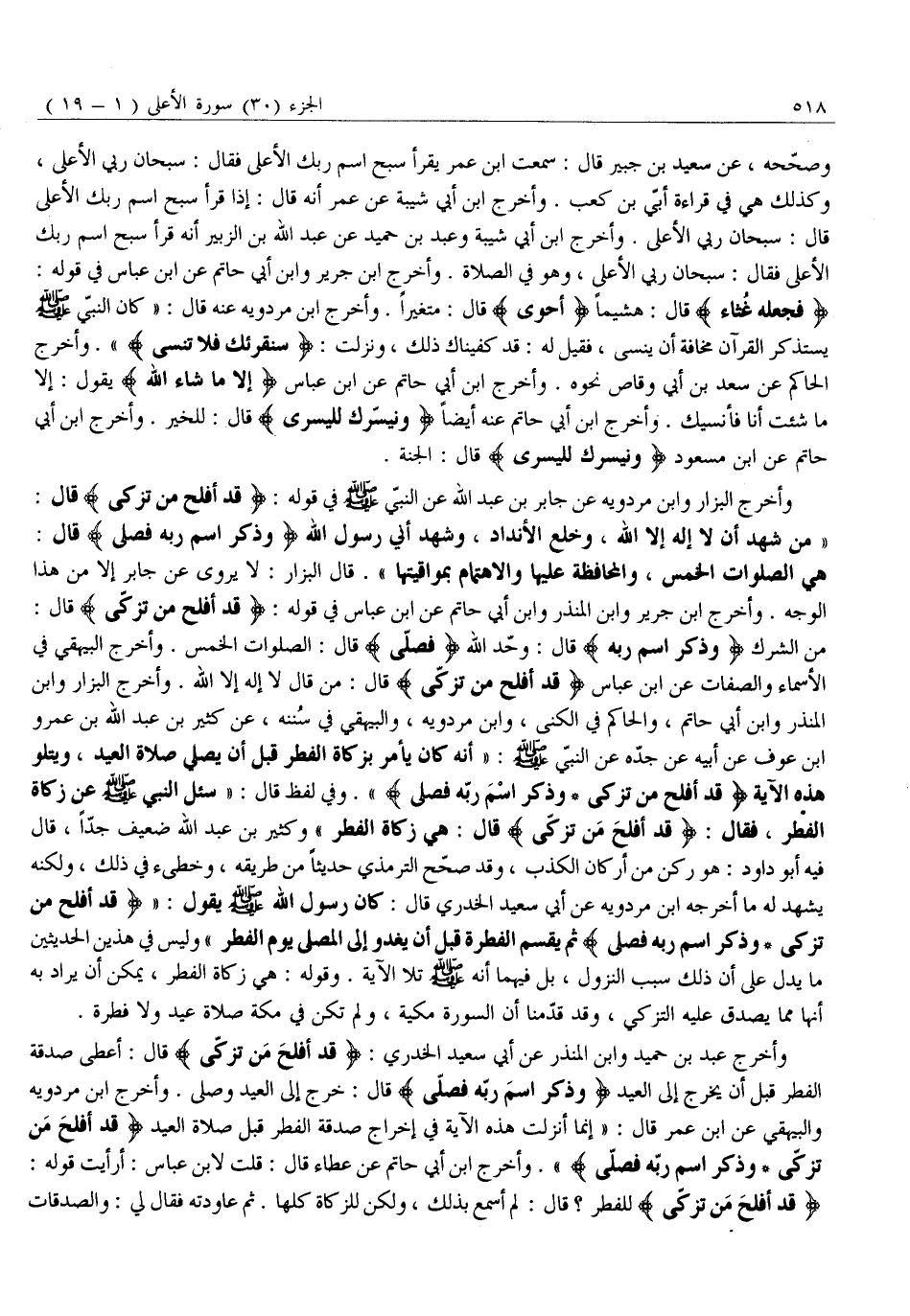 مِنَ الشِّرْكِ وَذَكَرَ اسْمَ رَبِّهِ قَالَ: وَحَّدَ اللَّهَ فَصَلَّى قَالَ: الصَّلَوَاتُ الْخَمْسُ. وَأَخْرَجَ الْبَيْهَقِيُّ فِي الْأَسْمَاءِ وَالصِّفَاتِ عَنِ ابْنِ عَبَّاسٍ قَدْ أَفْلَحَ مَنْ تَزَكَّى قَالَ: مَنْ قَالَ لَا إِلَهَ إِلَّا اللَّهُ. وَأَخْرَجَ الْبَزَّارُ وَابْنُ الْمُنْذِرِ وَابْنُ أَبِي حَاتِمٍ، وَالْحَاكِمُ فِي الْكُنَى، وَابْنُ مَرْدَوَيْهِ، وَالْبَيْهَقِيُّ فِي سُنَنِهِ، عَنْ كَثِيرِ بْنِ عَبْدِ اللَّهِ بْنِ عَمْرِو ابن عَوْفٍ عَنْ أَبِيهِ عَنْ جَدِّهِ عَنِ النَّبِيِّ صَلَّى اللَّهُ عَلَيْهِ وَسَلَّمَ: «أَنَّهُ كَانَ يَأْمُرُ بِزَكَاةِ الْفِطْرِ قَبْلَ أَنْ يُصَلِّيَ صَلَاةَ الْعِيدِ، وَيَتْلُوَ هَذِهِ الْآيَةَ قَدْ أَفْلَحَ مَنْ تَزَكَّى- وَذَكَرَ اسْمَ رَبِّهِ فَصَلَّى» . وَفِي لَفْظٍ قَالَ: «سُئِلَ النَّبِيُّ صَلَّى اللَّهُ عَلَيْهِ وَسَلَّمَ عَنْ زَكَاةِ الْفِطْرِ، فَقَالَ: قَدْ أَفْلَحَ مَنْ تَزَكَّى قَالَ: هِيَ زَكَاةُ الْفِطْرِ» وَكَثِيرُ بْنُ عَبْدِ اللَّهِ ضَعِيفٌ جِدًّا، قَالَ فِيهِ أَبُو دَاوُدَ: هُوَ رُكْنٌ مِنْ أَرْكَانِ الْكَذِبِ، وَقَدْ صَحَّحَ الترمذي حديثا من طريقه، وخطىء فِي ذَلِكَ، وَلَكِنَّهُ يَشْهَدُ لَهُ مَا أَخْرَجَهُ ابْنُ مَرْدَوَيْهِ عَنْ أَبِي سَعِيدٍ الْخُدْرِيِّ قَالَ: كَانَ رَسُولُ اللَّهِ صَلَّى اللَّهُ عَلَيْهِ وَسَلَّمَ يَقُولُ: «قَدْ أَفْلَحَ مَنْ تَزَكَّى- وَذَكَرَ اسْمَ رَبِّهِ فَصَلَّى ثُمَّ يَقْسِمُ الْفِطْرَةَ قَبْلَ أَنْ يَغْدُوَ إِلَى الْمُصَلَّى يَوْمَ الْفِطْرِ» وَلَيْسَ فِي هَذَيْنِ الْحَدِيثَيْنِ مَا يَدُلُّ عَلَى أَنَّ ذَلِكَ سَبَبُ النُّزُولِ، بَلْ فِيهِمَا أَنَّهُ صَلَّى اللَّهُ عَلَيْهِ وَسَلَّمَ تَلَا الْآيَةَ. وَقَوْلُهُ: هِيَ زَكَاةُ الْفِطْرِ، يُمْكِنُ أَنْ يُرَادَ بِهِ أَنَّهَا مِمَّا يَصْدُقُ عَلَيْهِ التَّزَكِّي، وَقَدْ قَدَّمْنَا أَنَّ السُّورَةَ مَكِّيَّةٌ، وَلَمْ تَكُنْ فِي مَكَّةَ صَلَاةُ عِيدٍ وَلَا فِطْرَةٌ.
