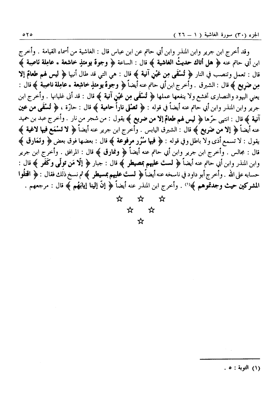 قَالَ: حَارَّةٌ، تُسْقى مِنْ عَيْنٍ آنِيَةٍ قَالَ: انْتَهَى حَرُّهَا لَيْسَ لَهُمْ طَعامٌ إِلَّا مِنْ ضَرِيعٍ يَقُولُ: مِنْ شَجَرٍ مِنْ نَارٍ. وَأَخْرَجَ عَبْدُ بْنُ حُمَيْدٍ عَنْهُ أَيْضًا إِلَّا مِنْ ضَرِيعٍ قَالَ: الشِّبْرِقُ الْيَابِسُ. وَأَخْرَجَ ابْنُ جَرِيرٍ عَنْهُ أَيْضًا لَا تَسْمَعُ فِيها لاغِيَةً يقول: لا تسمع أذى ولا باطل وَفِي قَوْلِهِ: فِيها سُرُرٌ مَرْفُوعَةٌ قَالَ: بَعْضُهَا فَوْقَ بَعْضٍ وَنَمارِقُ قَالَ: مَجَالِسُ. وَأَخْرَجَ ابْنُ جَرِيرٍ وَابْنُ أَبِي حَاتِمٍ عَنْهُ أَيْضًا وَنَمارِقُ قَالَ: الْمَرَافِقُ. وَأَخْرَجَ ابْنُ جَرِيرٍ وَابْنُ الْمُنْذِرِ وَابْنُ أَبِي حَاتِمٍ عَنْهُ أَيْضًا لَسْتَ عَلَيْهِمْ بِمُصَيْطِرٍ قَالَ: جَبَّارٌ إِلَّا مَنْ تَوَلَّى وَكَفَرَ قَالَ:
