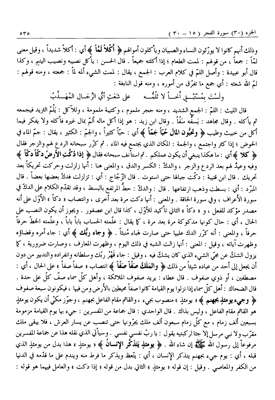 قَالَ اللَّيْثُ: اللَّمُّ: الْجَمْعُ الشَّدِيدُ، وَمِنْهُ حجر ملموم، وكتيبة ملمومة، وللآكل: يَلُمُّ الثَّرِيدَ فَيَجْمَعُهُ ثُمَّ يَأْكُلُهُ. وَقَالَ مُجَاهِدٌ: يَسِفُّهُ سَفًّا. وَقَالَ ابْنُ زَيْدٍ: هُوَ إِذَا أَكَلَ مَالَهُ أَلَمَّ بِمَالِ غَيْرِهِ فَأَكَلَهُ وَلَا يُفَكِّرُ فِيمَا أَكَلَ مِنْ خَبِيثٍ وَطَيِّبٍ وَتُحِبُّونَ الْمالَ حُبًّا جَمًّا أَيْ: حُبًّا كَثِيرًا، وَالْجَمُّ: الْكَثِيرُ، يُقَالُ: جَمَّ الْمَاءُ فِي الْحَوْضِ إِذَا كثر واجتمع، والجملة: الْمَكَانُ الَّذِي يَجْتَمِعُ فِيهِ الْمَاءُ. ثُمَّ كَرَّرَ سُبْحَانَهُ الرَّدْعَ لَهُمْ وَالزَّجْرَ فَقَالَ كَلَّا أَيْ: مَا هَكَذَا يَنْبَغِي أَنْ يَكُونَ عَمَلُكُمْ. ثُمَّ اسْتَأْنَفَ سُبْحَانَهُ فَقَالَ إِذا دُكَّتِ الْأَرْضُ دَكًّا دَكًّا وَفِيهِ وَعِيدٌ لَهُمْ بَعْدَ الرَّدْعِ وَالزَّجْرِ، وَالدَّكُّ: الْكَسْرُ وَالدَّقُّ، وَالْمَعْنَى هُنَا: أَنَّهَا زُلْزِلَتْ وَحُرِّكَتْ تَحْرِيكًا بَعْدَ تَحْرِيكٍ. قَالَ ابْنُ قُتَيْبَةَ: دُكَّتْ جِبَالُهَا حَتَّى اسْتَوَتْ. قَالَ الزَّجَّاجُ: أَيْ: تَزَلْزَلَتْ فَدَكَّ بَعْضُهَا بَعْضًا. قَالَ الْمُبَرِّدُ: أَيْ: بُسِطَتْ وَذَهَبَ ارْتِفَاعُهَا. قَالَ: وَالدَّكُّ: حَطُّ الْمُرْتَفِعِ بِالْبَسْطِ، وَقَدْ تَقَدَّمَ الْكَلَامُ عَلَى الدَّكِّ فِي سورة الأعراف، وفي سورة الحاقة. وَالْمَعْنَى: أَنَّهَا دُكَّتْ مَرَّةً بَعْدَ أُخْرَى، وَانْتِصَابُ «دَكًّا» الْأَوَّلُ عَلَى أَنَّهُ مَصْدَرٌ مُؤَكِّدٌ لِلْفِعْلِ، و «دكا» الثَّانِي تَأْكِيدٌ لِلْأَوَّلِ، كَذَا قَالَ ابْنُ عُصْفُورٍ. وَيَجُوزُ أَنْ يَكُونَ النَّصْبُ عَلَى الْحَالِ، أَيْ: حَالَ كَوْنِهَا مَدْكُوكَةً مَرَّةً بَعْدَ مَرَّةٍ، كَمَا يُقَالُ: عَلَّمْتُهُ الْحِسَابَ بَابًا بَابًا، وَعَلَّمْتُهُ الْخَطَّ حَرْفًا حَرْفًا، وَالْمَعْنَى: أَنَّهُ كَرَّرَ الدَّكَّ عَلَيْهَا حَتَّى صَارَتْ هَبَاءً مُنْبَثًّا. وَجاءَ رَبُّكَ أَيْ: جَاءَ أَمْرُهُ وَقَضَاؤُهُ وَظَهَرَتْ آيَاتُهُ، وَقِيلَ: الْمَعْنَى: أَنَّهَا زَالَتِ الشُّبَهُ فِي ذَلِكَ الْيَوْمِ، وَظَهَرَتِ المعارف، وصارت ضرورية، كما يزول الشكّ عن مَجِيءِ الشَّيْءِ الَّذِي كَانَ يُشَكُّ فِيهِ، وَقِيلَ: جاء قهر ربّك وسلطانه وانفراده وَالتَّدْبِيرِ مِنْ دُونِ أَنْ يَجْعَلَ إِلَى أَحَدٍ مِنْ عِبَادِهِ شَيْئًا مِنْ ذَلِكَ وَالْمَلَكُ صَفًّا صَفًّا انْتِصَابُ «صَفًّا صَفًّا» عَلَى الْحَالِ، أَيْ: