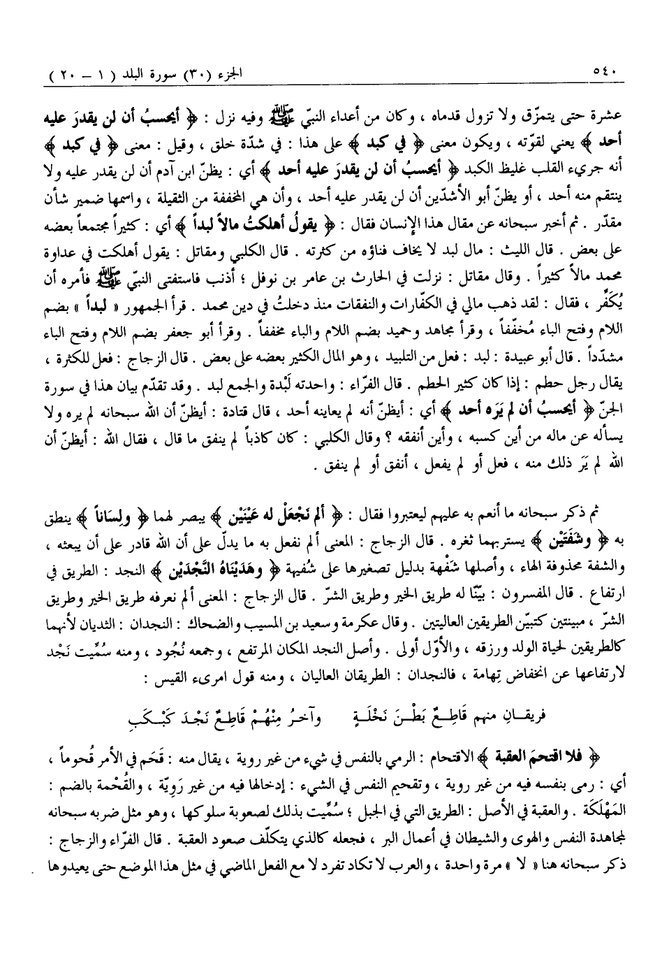عَشَرَةٌ حَتَّى يَتَمَزَّقَ وَلَا تَزُولُ قَدَمَاهُ، وَكَانَ مِنْ أَعْدَاءِ النَّبِيِّ صَلَّى اللَّهُ عَلَيْهِ وَسَلَّمَ وَفِيهِ نَزَلَ: أَيَحْسَبُ أَنْ لَنْ يَقْدِرَ عَلَيْهِ أَحَدٌ يَعْنِي لِقُوَّتِهِ، وَيَكُونُ مَعْنًى فِي كَبَدٍ عَلَى هَذَا: فِي شِدَّةِ خَلْقٍ، وَقِيلَ: مَعْنَى فِي كَبَدٍ أَنَّهُ جَرِيءُ الْقَلْبِ غَلِيظُ الْكَبِدِ أَيَحْسَبُ أَنْ لَنْ يَقْدِرَ عَلَيْهِ أَحَدٌ أَيْ: يَظُنُّ ابْنُ آدَمَ أَنْ لَنْ يَقْدِرَ عَلَيْهِ وَلَا يَنْتَقِمَ مِنْهُ أَحَدٌ، أَوْ يَظُنَّ أَبُو الأشدّين أن لن يقدر عليه أحد، وَأَنْ هِيَ الْمُخَفَّفَةُ مِنَ الثَّقِيلَةِ، وَاسْمُهَا ضَمِيرُ شَأْنٍ مُقَدَّرٌ. ثُمَّ أَخْبَرَ سُبْحَانَهُ عَنْ مَقَالِ هَذَا الْإِنْسَانِ فَقَالَ: يَقُولُ أَهْلَكْتُ مَالًا لُبَداً أَيْ: كَثِيرًا مُجْتَمِعًا بَعْضُهُ عَلَى بَعْضٍ. قَالَ اللَّيْثُ: مَالٌ لُبَدٌ لَا يُخَافُ فَنَاؤُهُ مِنْ كَثْرَتِهِ. قَالَ الْكَلْبِيُّ وَمُقَاتِلٌ: يَقُولُ أَهْلَكْتُ فِي عَدَاوَةِ مُحَمَّدٍ مَالًا كَثِيرًا. وَقَالَ مُقَاتِلٌ: نَزَلَتْ فِي الْحَارِثِ بْنِ عَامِرِ بْنِ نَوْفَلٍ أَذْنَبَ فَاسْتَفْتَى النَّبِيَّ صَلَّى اللَّهُ عَلَيْهِ وَسَلَّمَ فَأَمَرَهُ أَنْ يُكَفِّرَ، فَقَالَ: لَقَدْ ذَهَبَ مَالِي فِي الْكَفَّارَاتِ وَالنَّفَقَاتِ مُنْذُ دَخَلْتُ فِي دِينِ مُحَمَّدٍ. قَرَأَ الجمهور «لبدا» بضم اللام وفتح الباء مخفّفا، وقرأ مجاهد وحميد بضم اللام والباء مخففا. وقرأ أبو جعفر بِضَمِّ اللَّامِ وَفَتْحِ الْبَاءِ مُشَدَّدًا. قَالَ أَبُو عُبَيْدَةَ: لُبَدٌ: فُعَلٌ مِنَ التَّلْبِيدِ، وَهُوَ الْمَالُ الْكَثِيرُ بَعْضُهُ عَلَى بَعْضٍ. قَالَ الزَّجَّاجُ: فُعَلٌ لِلْكَثْرَةِ، يُقَالُ رَجُلٌ حُطَمٌ: إِذَا كَانَ كَثِيرَ الْحَطْمِ. قَالَ الْفَرَّاءُ: وَاحِدَتُهُ لُبَدَةٌ وَالْجَمْعُ لُبَدٌ. وَقَدْ تَقَدَّمَ بَيَانُ هَذَا فِي سُورَةِ الْجِنِّ أَيَحْسَبُ أَنْ لَمْ يَرَهُ أَحَدٌ أَيْ: أَيَظُنُّ أَنَّهُ لَمْ يُعَايِنْهُ أَحَدٌ، قَالَ قَتَادَةُ: أَيَظُنُّ أَنَّ اللَّهَ سُبْحَانَهُ لَمْ يَرَهُ وَلَا يَسْأَلْهُ عَنْ مَالِهِ مِنْ أَيْنَ كَسَبَهُ، وَأَيْنَ أَنْفَقَهُ؟ وَقَالَ الْكَلْبِيُّ: كَانَ كَاذِبًا لَمْ يُنْفِقْ مَا قَالَ، فَقَالَ اللَّهُ: أَيَظُنُّ أَنَّ اللَّهَ لَمْ يَرَ ذَلِكَ مِنْهُ، فَعَلَ أَوْ لَمْ يَفْعَلْ، أنفق أو لَمْ يُنْفِقْ.