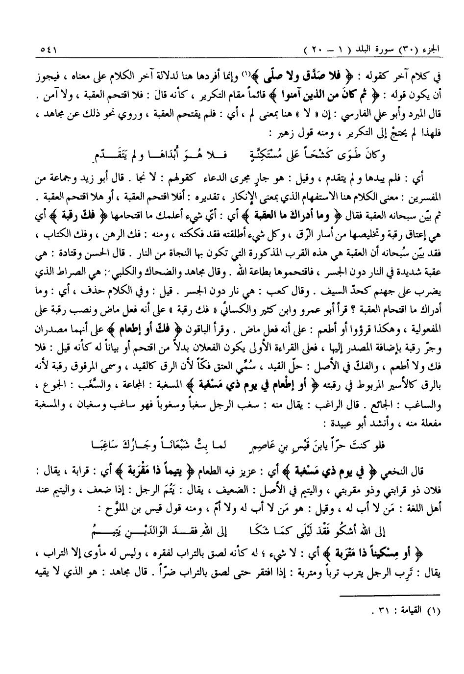 ثُمَّ بَيَّنَ سُبْحَانَهُ الْعَقَبَةَ فَقَالَ وَما أَدْراكَ مَا الْعَقَبَةُ أَيْ: أَيُّ شَيْءٍ أَعْلَمَكَ مَا اقْتِحَامُهَا فَكُّ رَقَبَةٍ أَيْ هِيَ إِعْتَاقُ رَقَبَةٍ وَتَخْلِيصُهَا مِنْ أَسَارِ الرِّقِّ، وَكُلُّ شَيْءٍ أَطْلَقْتَهُ فَقَدْ فَكَكْتَهُ، وَمِنْهُ: فَكُّ الرَّهْنِ، وَفَكُّ الْكِتَابِ، فَقَدْ بَيَّنَ سُبْحَانَهُ أَنَّ الْعَقَبَةَ هِيَ هَذِهِ الْقُرَبُ الْمَذْكُورَةُ الَّتِي تَكُونُ بِهَا النَّجَاةُ مِنَ النَّارِ. قَالَ الْحَسَنُ وَقَتَادَةُ: هِيَ عَقَبَةٌ شَدِيدَةٌ فِي النَّارِ دُونَ الْجِسْرِ، فَاقْتَحِمُوهَا بِطَاعَةِ اللَّهِ. وَقَالَ مُجَاهِدٌ وَالضَّحَّاكُ وَالْكَلْبِيُّ: هِيَ الصِّرَاطُ الَّذِي يُضْرَبُ عَلَى جَهَنَّمَ كَحَدِّ السَّيْفِ. وَقَالَ كَعْبٌ: هي نار دون الجسر. قيل: وَفِي الْكَلَامِ حَذْفٌ، أَيْ: وَمَا أَدْرَاكَ مَا اقتحام العقبة؟ قرأ أبو عمرو وَابْنُ كَثِيرٍ وَالْكِسَائِيُّ «فَكَّ رَقَبَةً» عَلَى أَنَّهُ فِعْلٌ مَاضٍ وَنَصَبَ رَقَبَةً عَلَى الْمَفْعُولِيَّةِ، وَهَكَذَا قرءوا أو أَطْعَمَ: عَلَى أَنَّهُ فِعْلٌ مَاضٍ. وَقَرَأَ الْبَاقُونَ فَكُّ أَوْ إِطْعَامٌ عَلَى أَنَّهُمَا مَصْدَرَانِ وَجَرِّ رَقَبَةٍ بِإِضَافَةِ الْمَصْدَرِ إِلَيْهَا، فَعَلَى الْقِرَاءَةِ الْأُولَى يَكُونُ الْفِعْلَانِ بَدَلًا مِنِ اقْتَحَمَ أَوْ بَيَانًا لَهُ كَأَنَّهُ قِيلَ: فَلَا فَكَّ وَلَا أَطْعَمَ، وَالْفَكُّ فِي الْأَصْلِ: حَلُّ الْقَيْدِ، سُمِّيَ الْعِتْقُ فَكًّا لِأَنَّ الرِّقَّ كَالْقَيْدِ، وَسُمِّيَ الْمَرْقُوقُ رَقَبَةً لِأَنَّهُ بِالرِّقِّ كَالْأَسِيرِ الْمَرْبُوطِ فِي رَقَبَتِهِ أَوْ إِطْعامٌ فِي يَوْمٍ ذِي مَسْغَبَةٍ الْمَسْغَبَةُ: الْمَجَاعَةُ، وَالسَّغَبُ: الْجُوعُ، وَالسَّاغِبُ: الْجَائِعُ. قَالَ الرَّاغِبُ: يُقَالُ مِنْهُ: سَغَبَ الرَّجُلُ سَغَبًا وَسُغُوبًا فَهُوَ سَاغِبٌ وَسَغْبَانُ، وَالْمَسْغَبَةُ مَفْعَلَةٌ مِنْهُ، وَأَنْشَدَ أَبُو عُبَيْدَةَ: